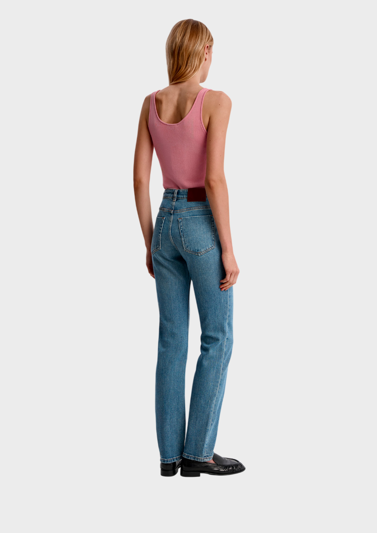 Базовые джинсы прямого кроя на высокой посадке. Плотно прилегают в бедрах и заужены по ноге — самая узкая модель из линии Straight Fit. Детали: застежка на молнию и пуговицу.