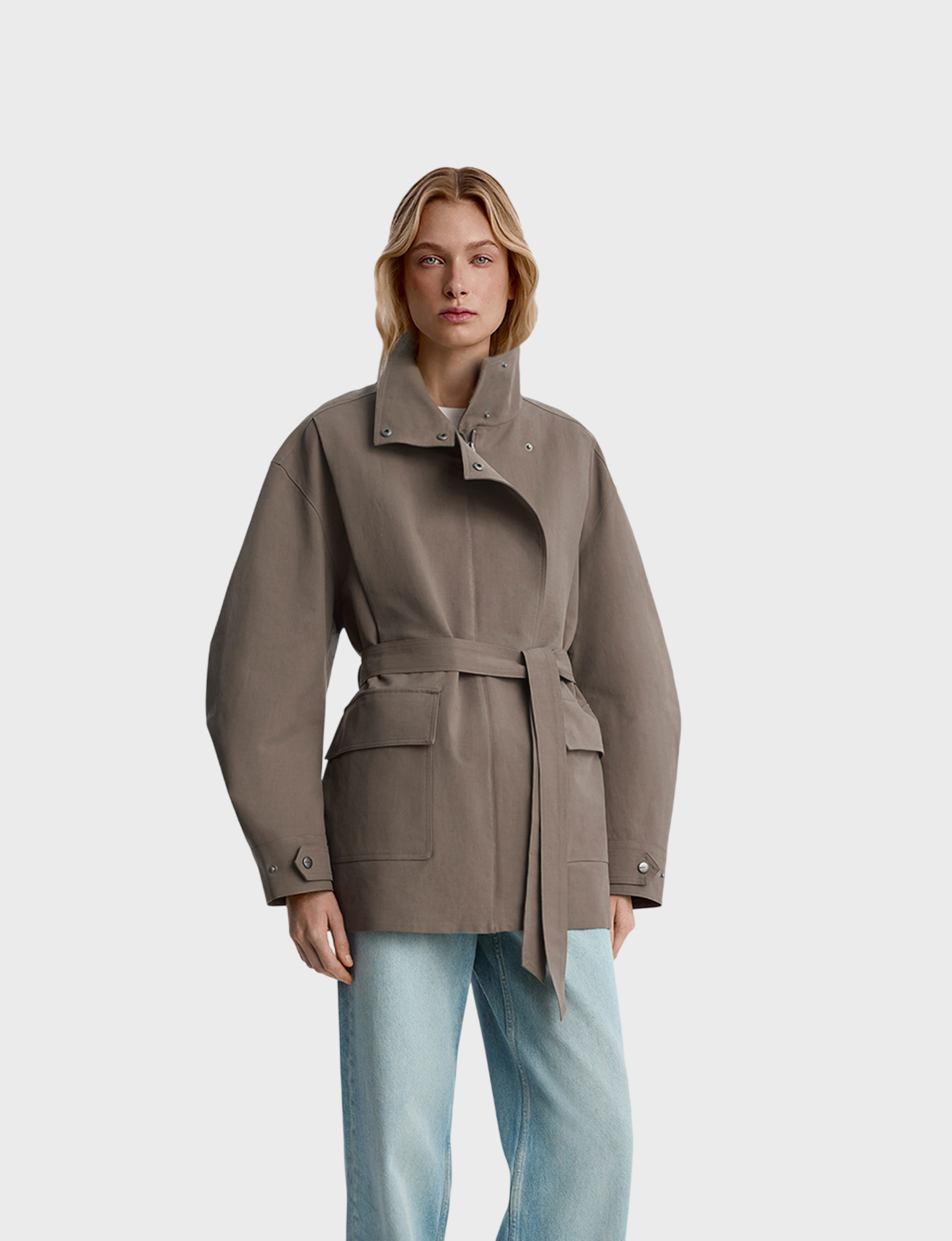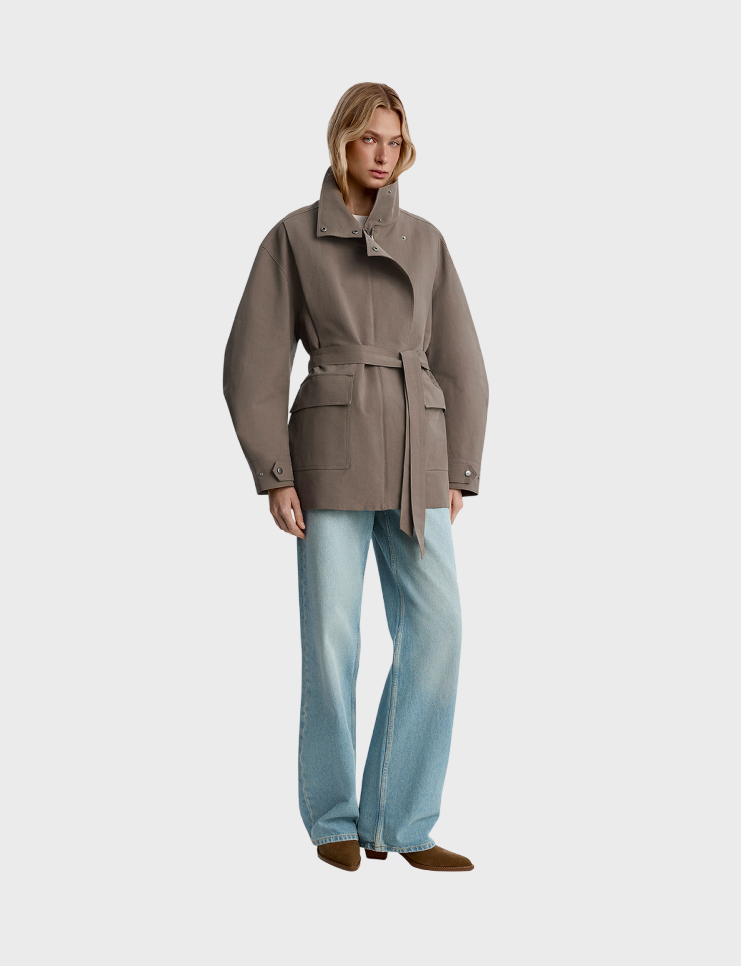 Объемная парка с высоким воротником-стойкой для прохладного межсезонья. Свободный силуэт и рукав реглан формируют мягкие линии и обеспечивают комфортную посадку.