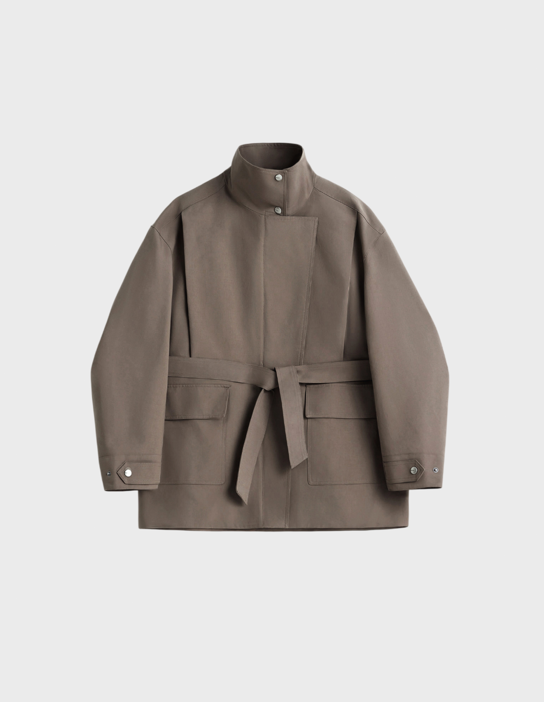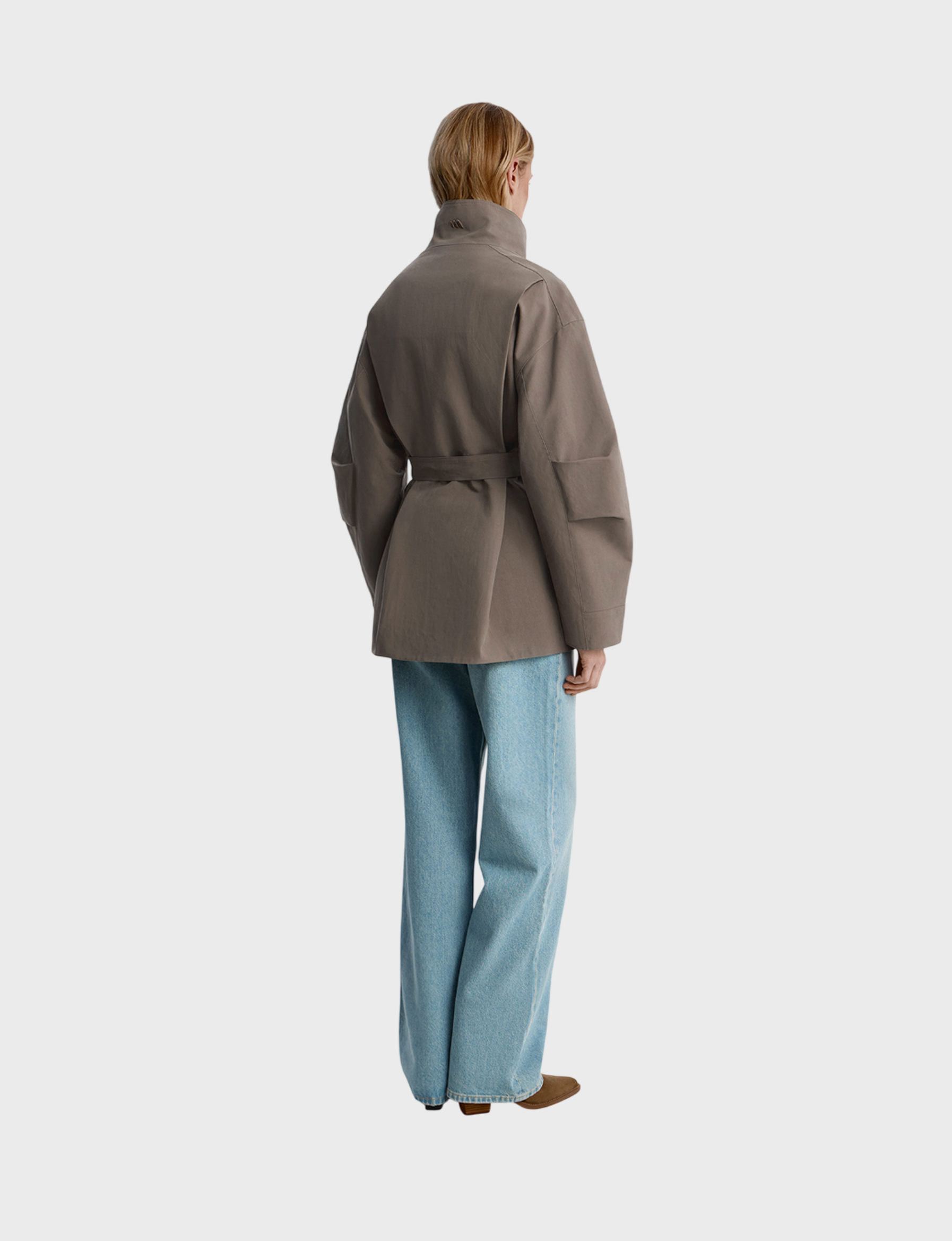 Куртка имеет двойную застежку — на молнию и потайные кнопки. Спереди декорирована накладными карманами с клапанами. Мягкий ремень позволяет регулировать объем и подчеркивать линию талии по желанию.