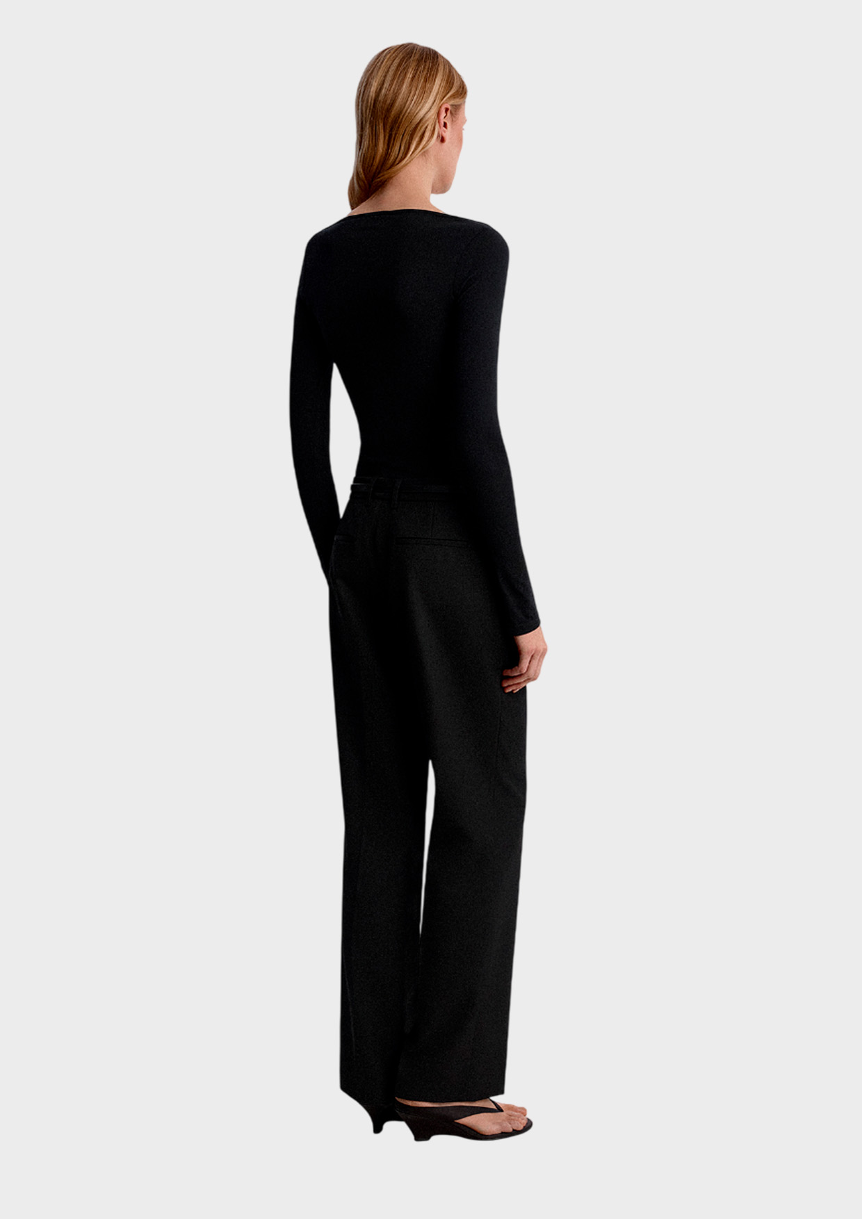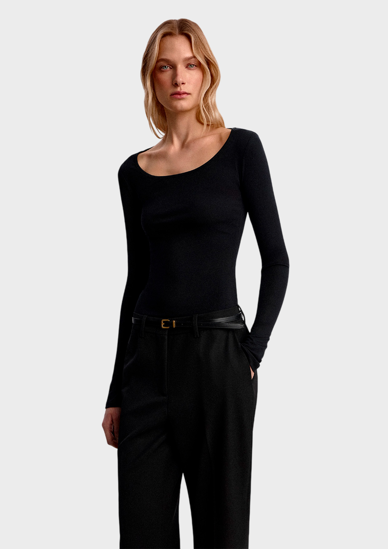 Облегающий лонгслив с удлиненным рукавом и глубоким вырезом по горловине выгодно подчеркивает силуэт и создает акцент на линии груди. Прилегающая посадка мягко повторяет линии тела, не сковывая движений.