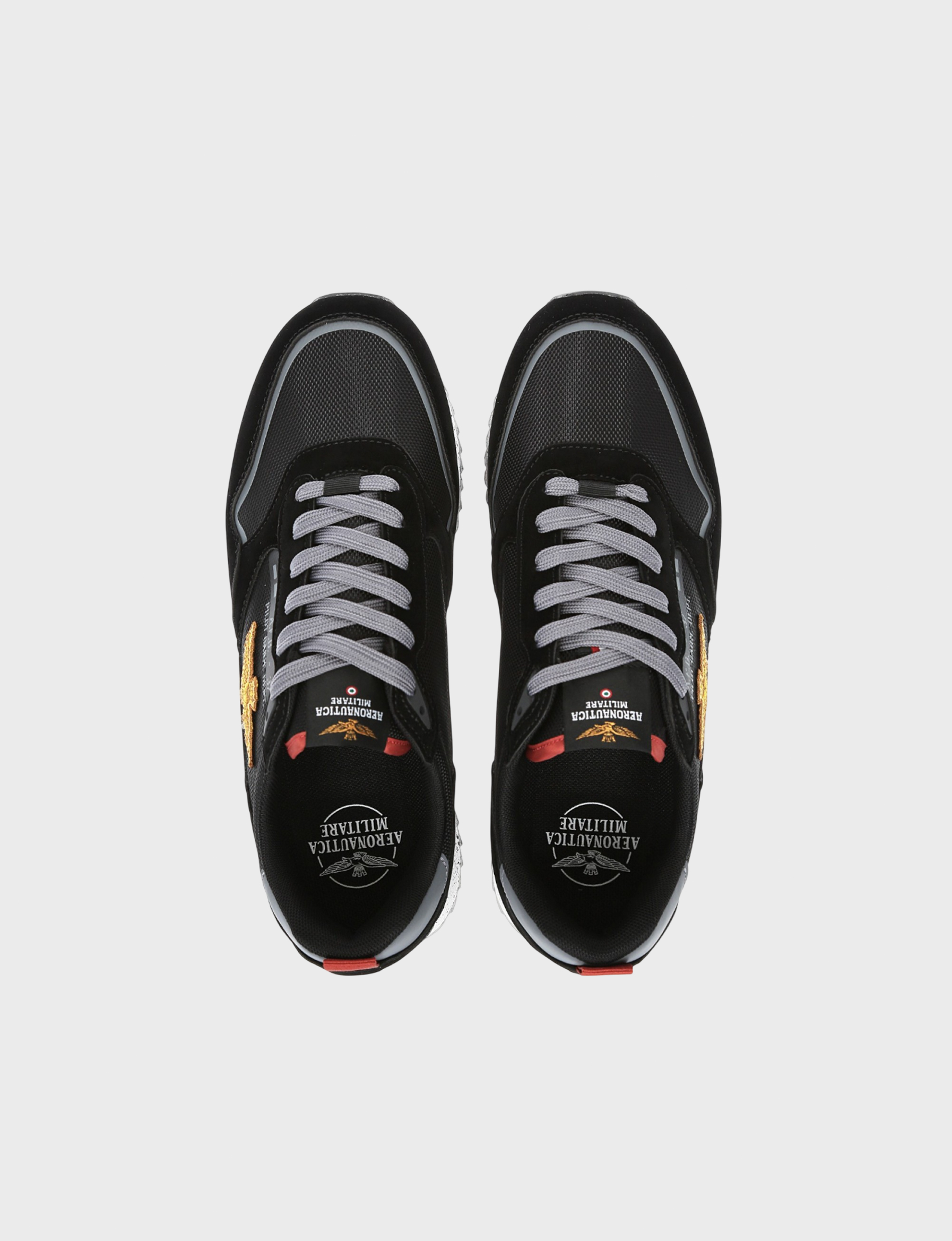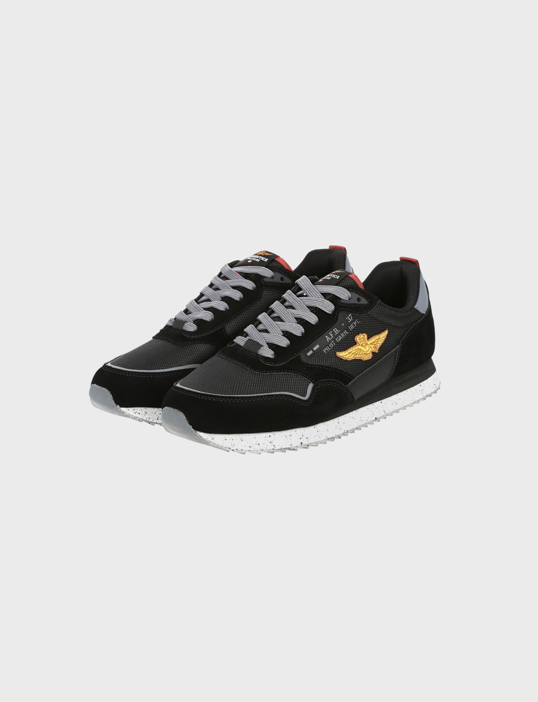 Черные мужские кроссовки AERONAUTICA — Верх из полиуретана и полиэстера обеспечивает прочность и комфорт, подкладка из мягкого полиэстера дарит приятное ощущение при носке, а подошва из ЭВА и резины гарантирует лёгкость и надёжность каждого шага.