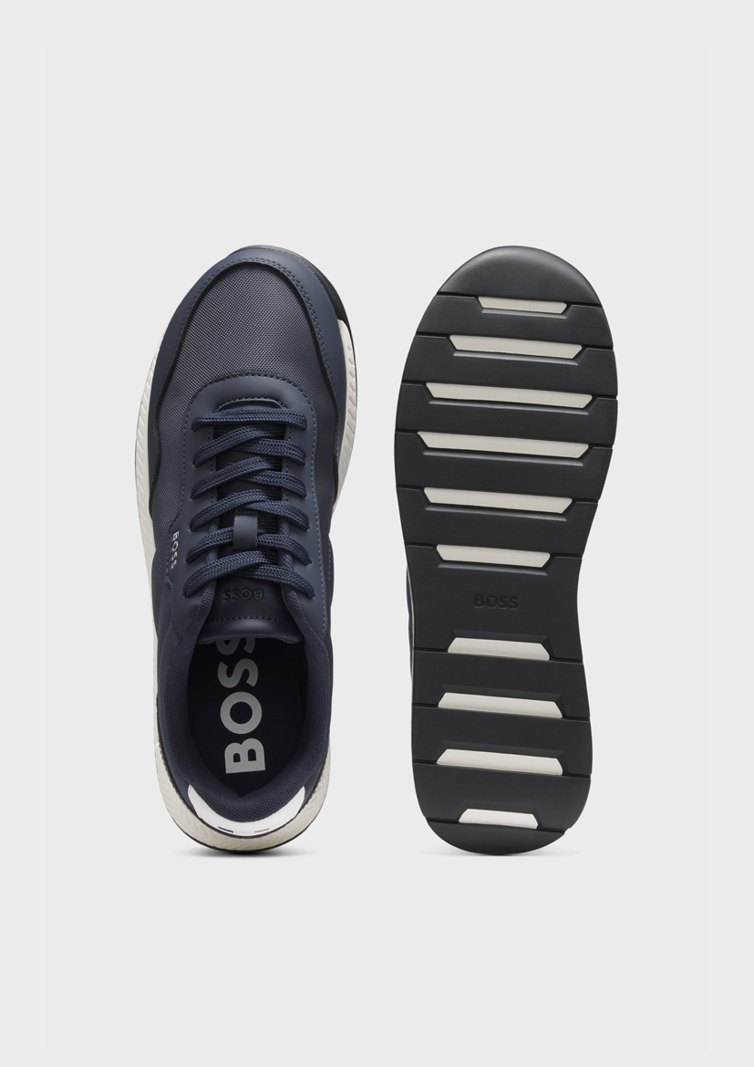 Мужские кроссовки BOSS с логотипом и фирменной строчкой в полоску придают повседневным образам особую изюминку. Комбинированный верх из текстурированных и гладких тканей.