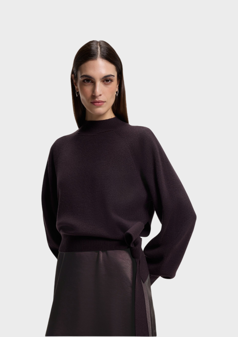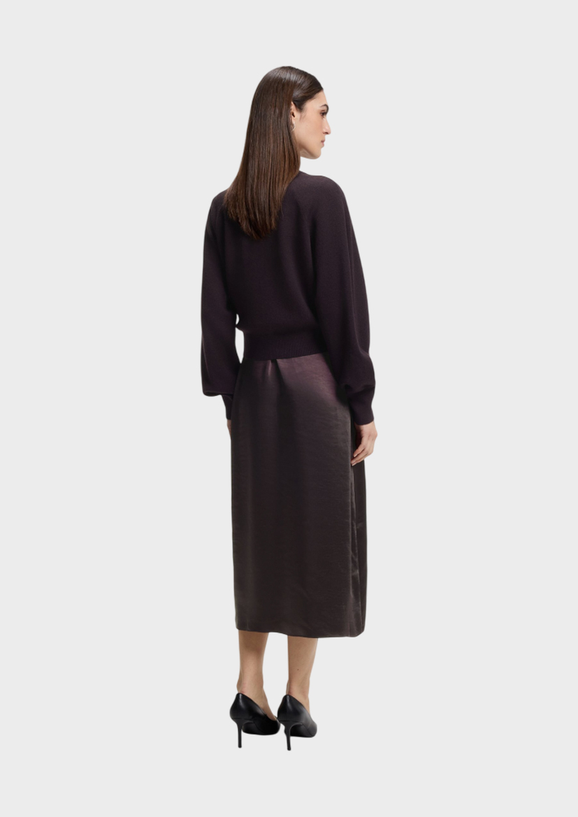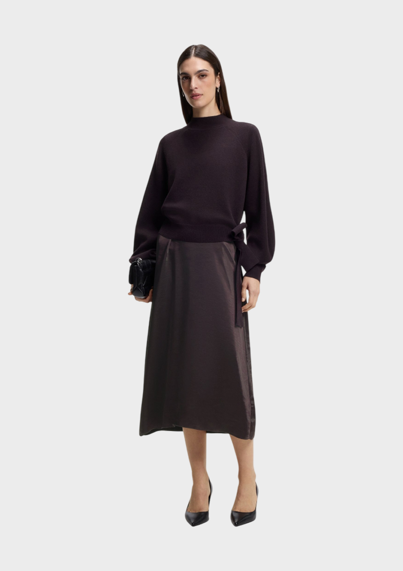 Платье- миди Flalina- комплект из струящейся юбки и свободного свитера, завязывающегося сбоку лентами. Верх модели изготовлен из микса шерсти и кашемира, а подол – полиэстера.