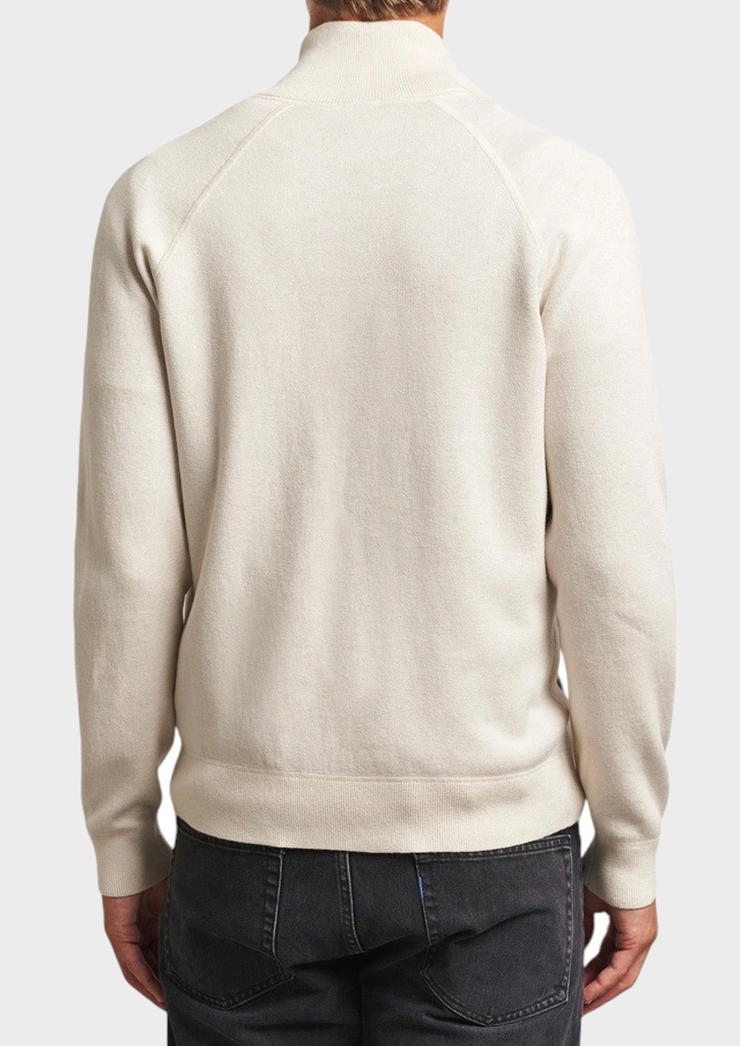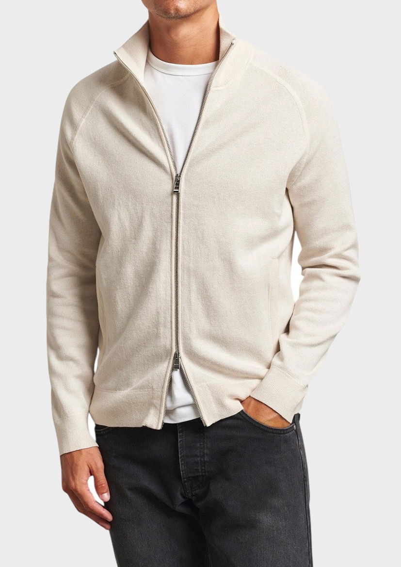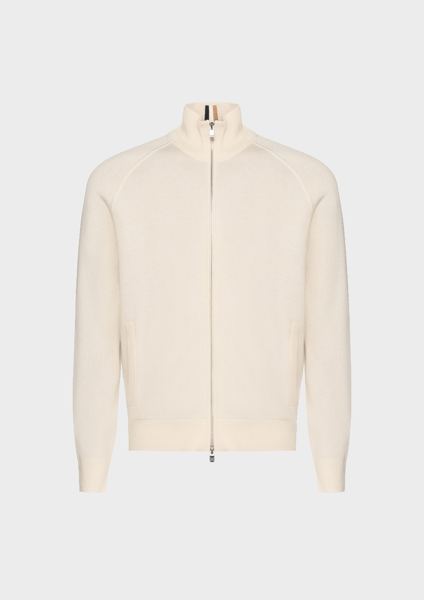Кардиган Idino с отделкой в рубчик и встречной молнией выполнили из пряжи на основе органического хлопка с добавлением шерсти первого пострига. Модель с фирменным триколором на внутренней стороне воротника-стойки дополнили боковыми карманами.