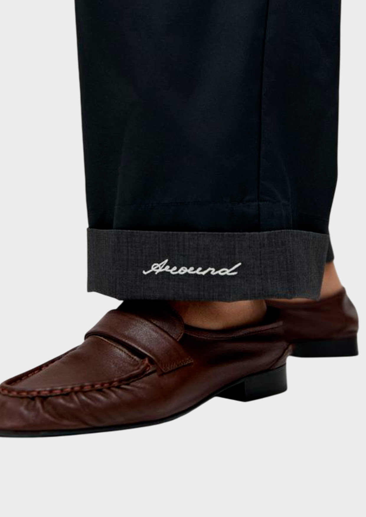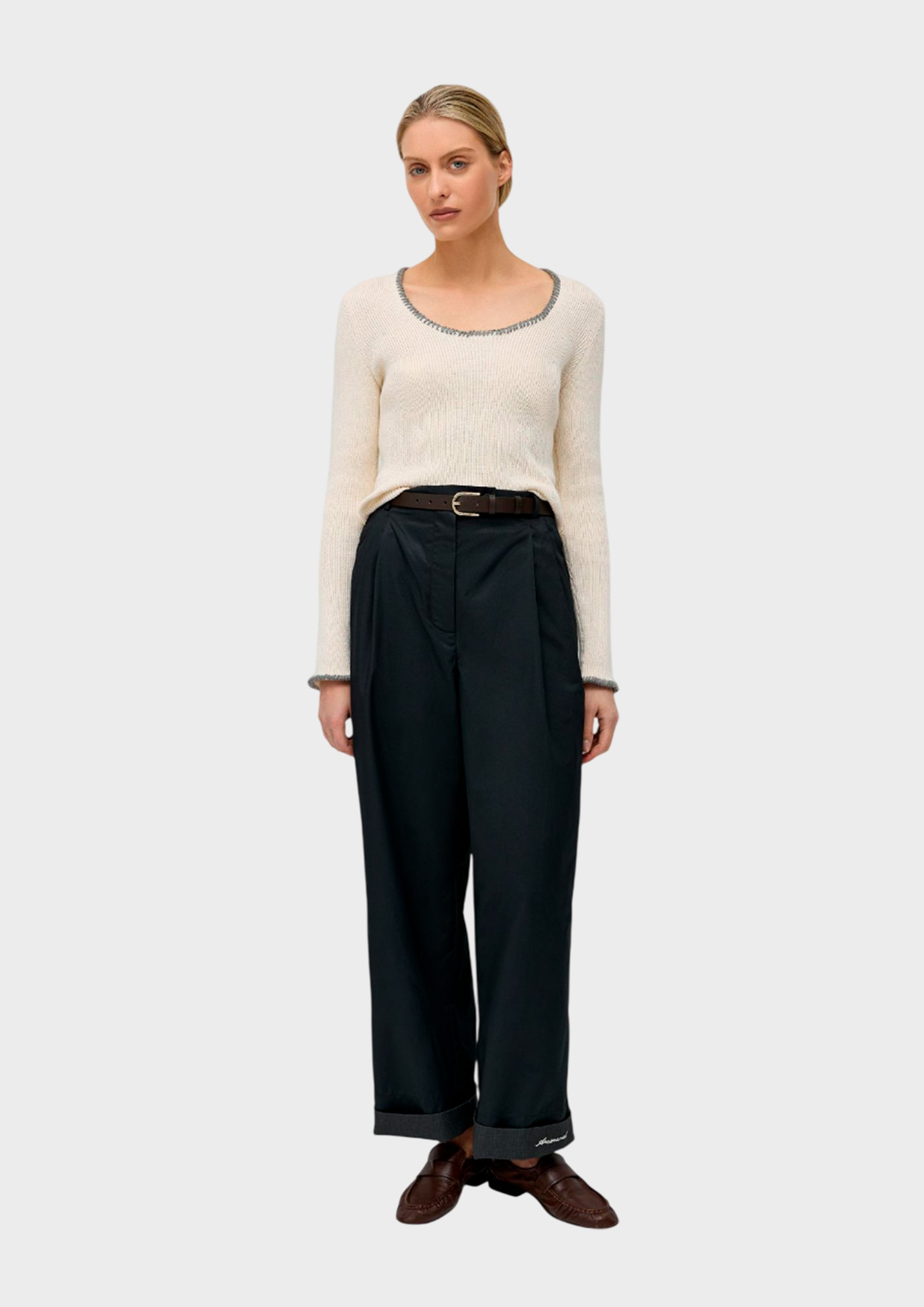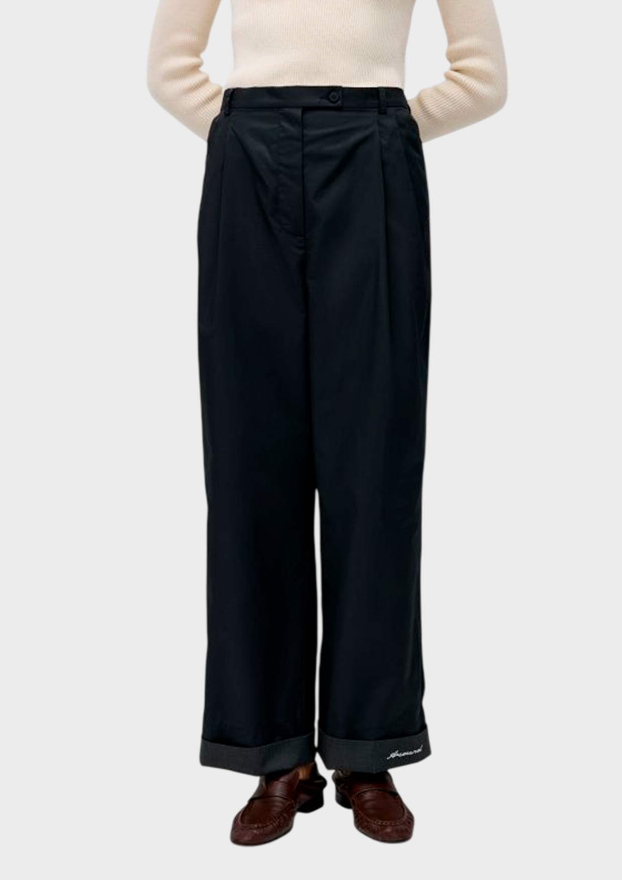 Акцентная деталь брюк — широкие отвороты с контрастной машинной вышивкой в виде надписи Around. При желании этот элемент можно «спрятать» внутрь, подвернув низ в обратную сторону.