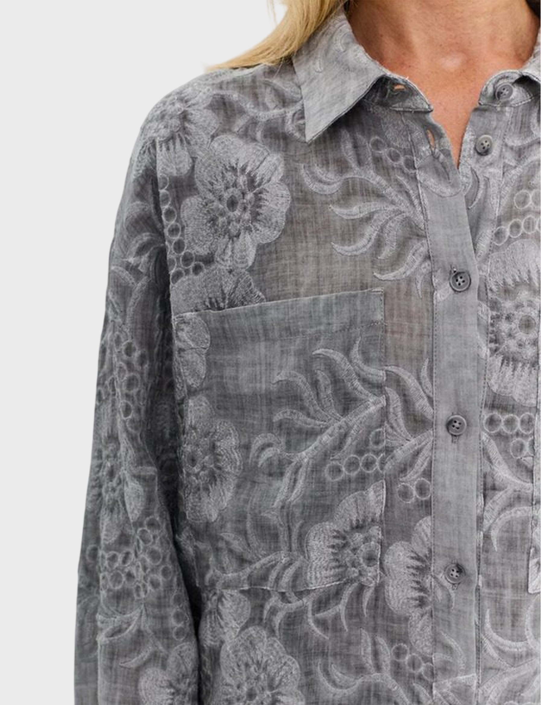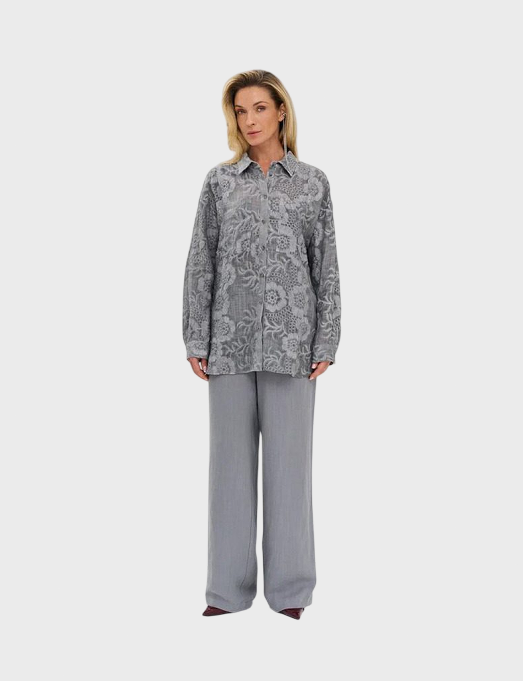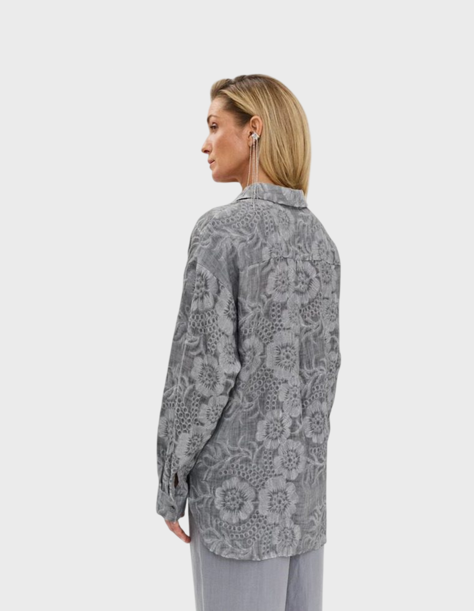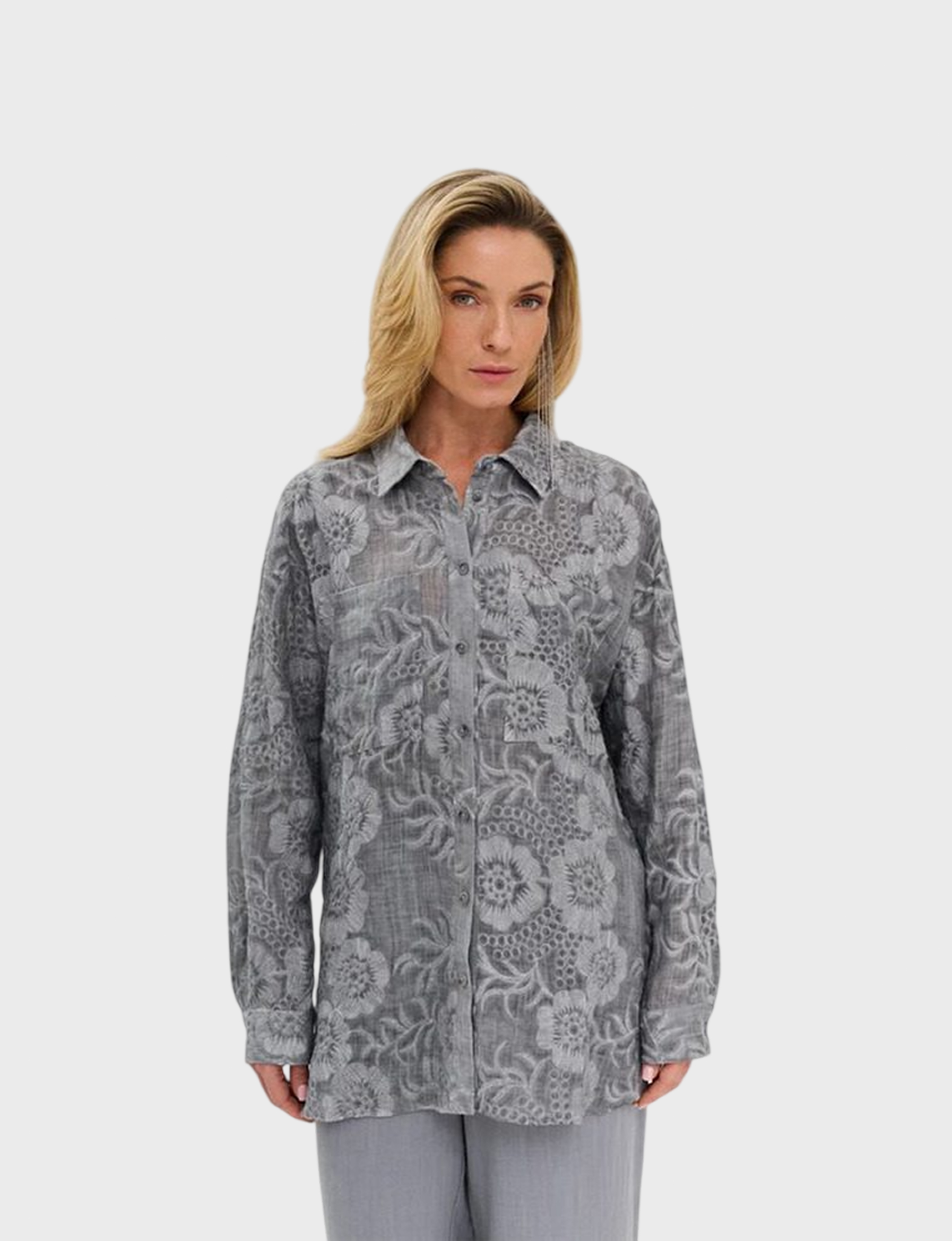 Удлинённая блузка из 100% рами. Прямой силуэт подойдёт практически для любого типа фигуры. Блузка застёгивается на пуговицы, которые, в свою очередь, не конфликтуют с основным дизайном.