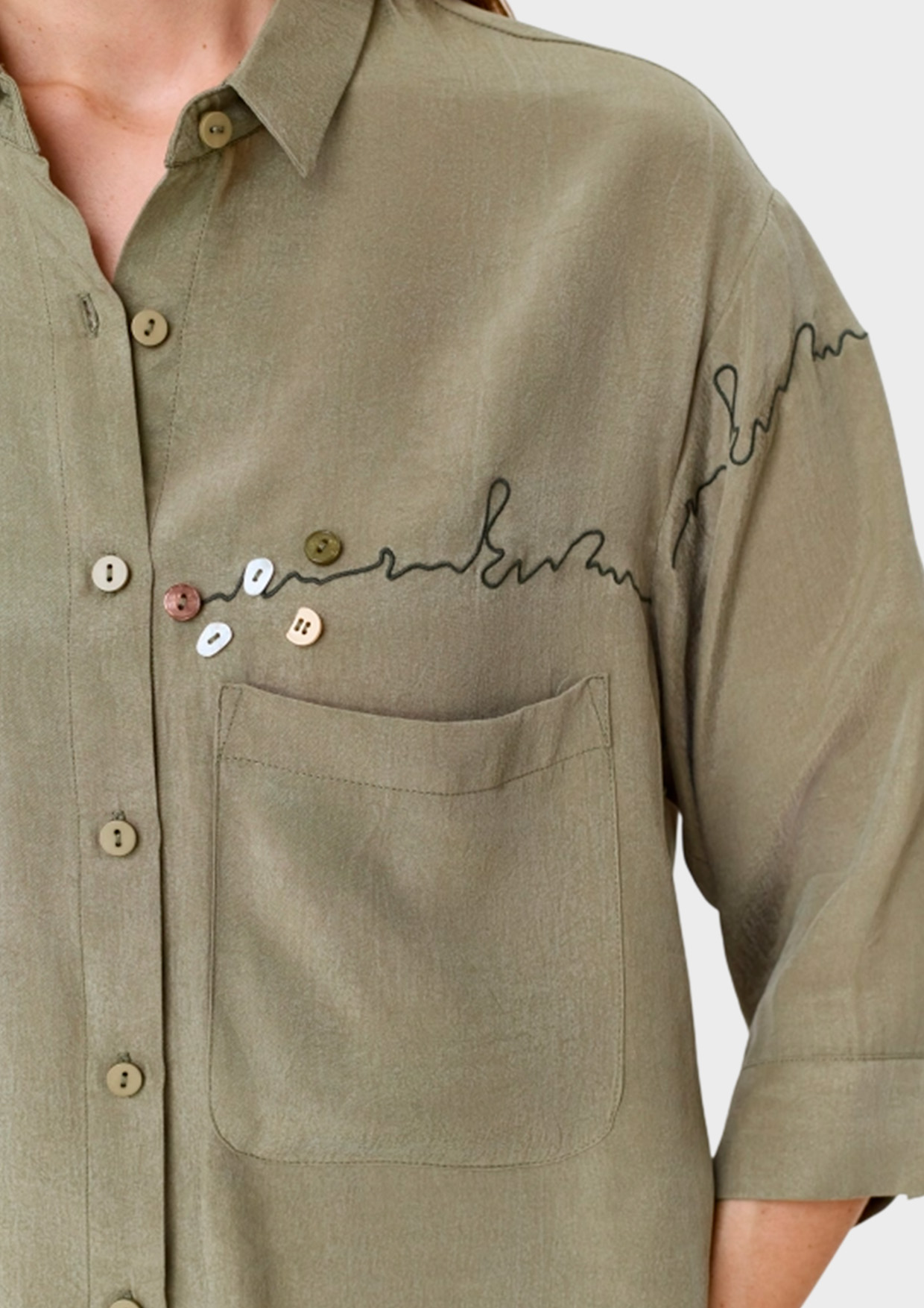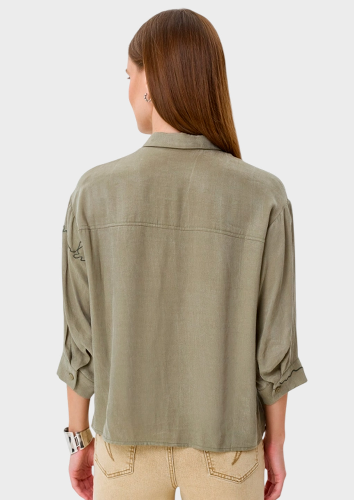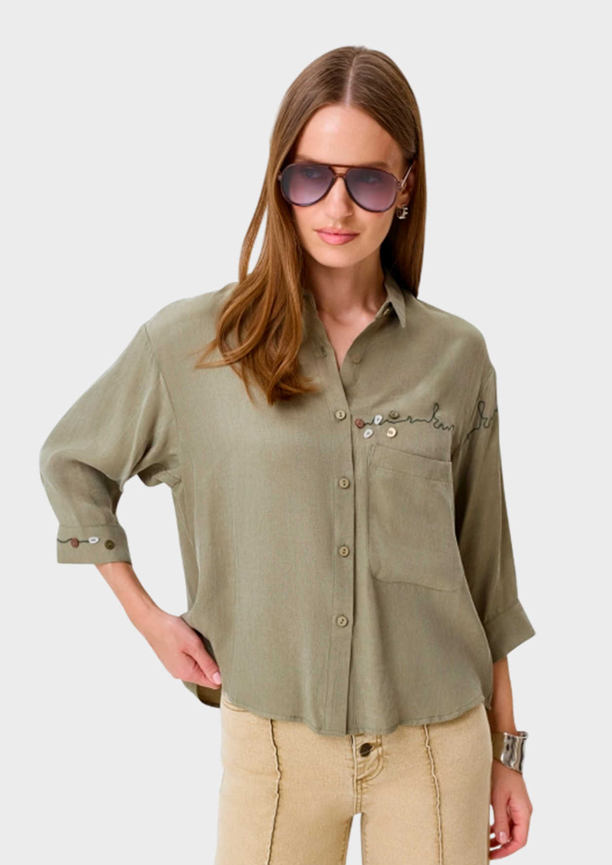 Оливковая блузка из тенселя и вискозы. Свободный силуэт. Отложной воротник. Застежка на пуговицы. Спущенная линия плеч и втачные рукава 3/4. Накладной нагрудный карман. Дополнена акцентной вышивкой и декором.