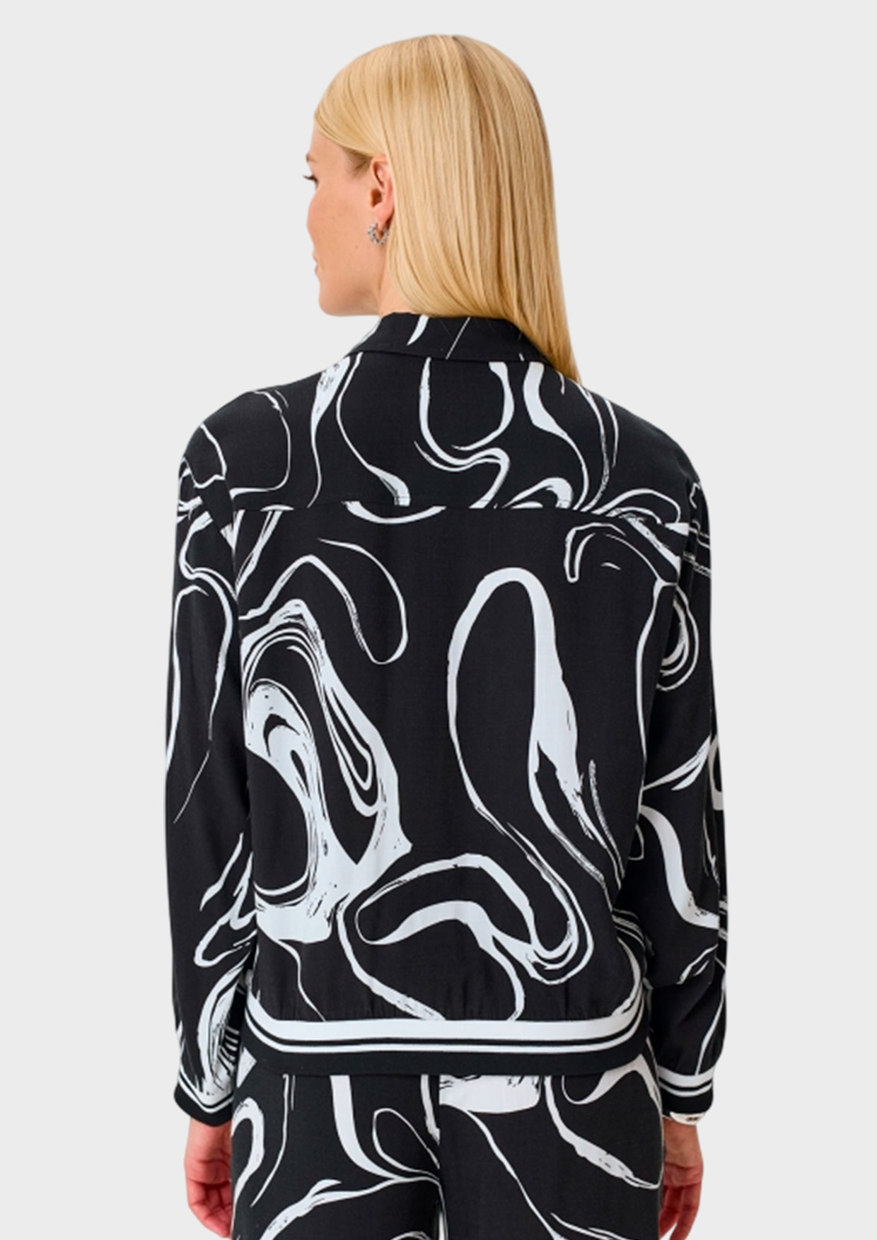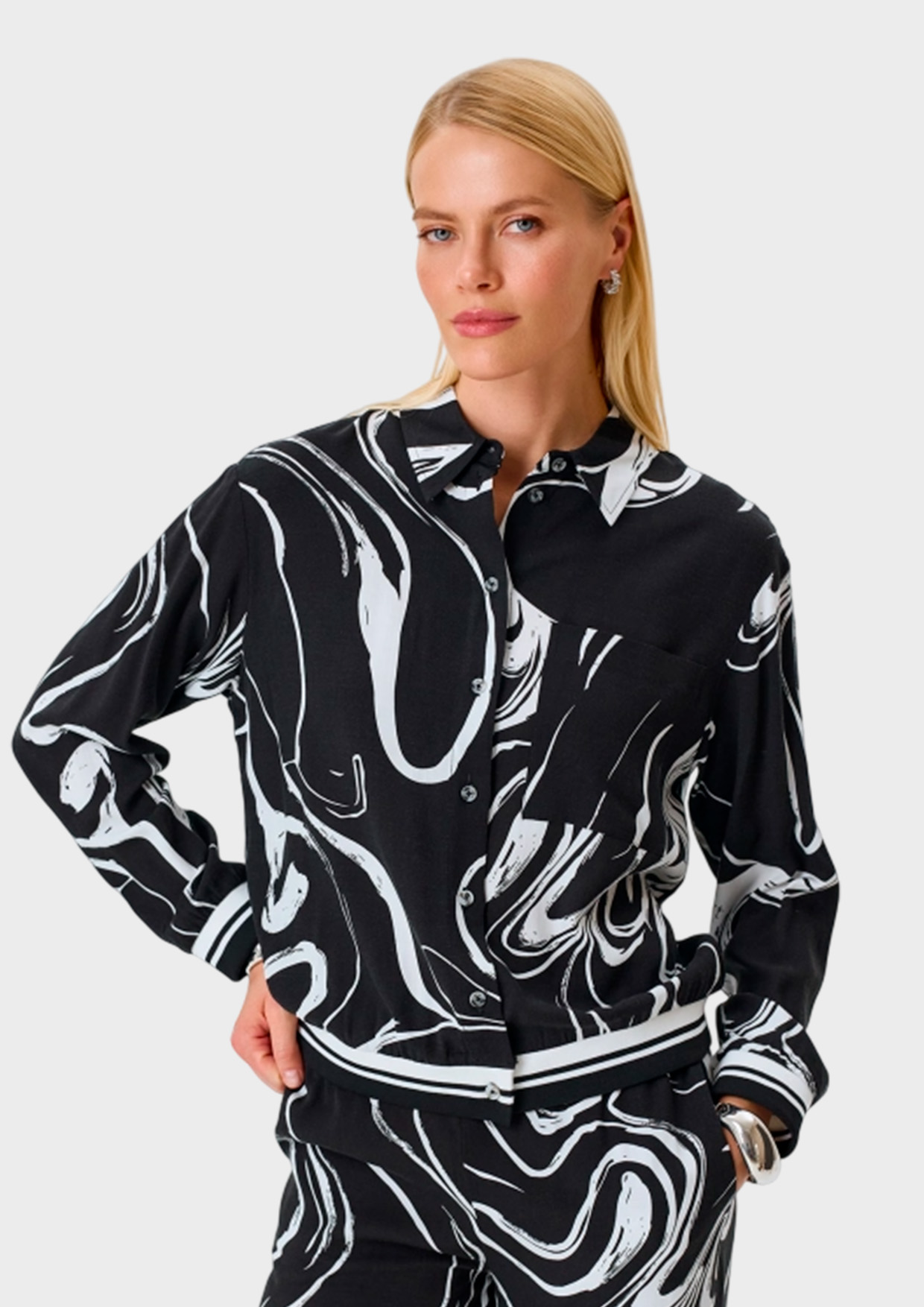 Блузка из 100% района с графичным принтом. Прямой силуэт. Отложной воротник. Застежка на пуговицы. Спущенная линия плеча, длинные рукава с манжетами. Накладной нагрудный карман. Дополнена рибом в полоску по низу изделия и рукавов.