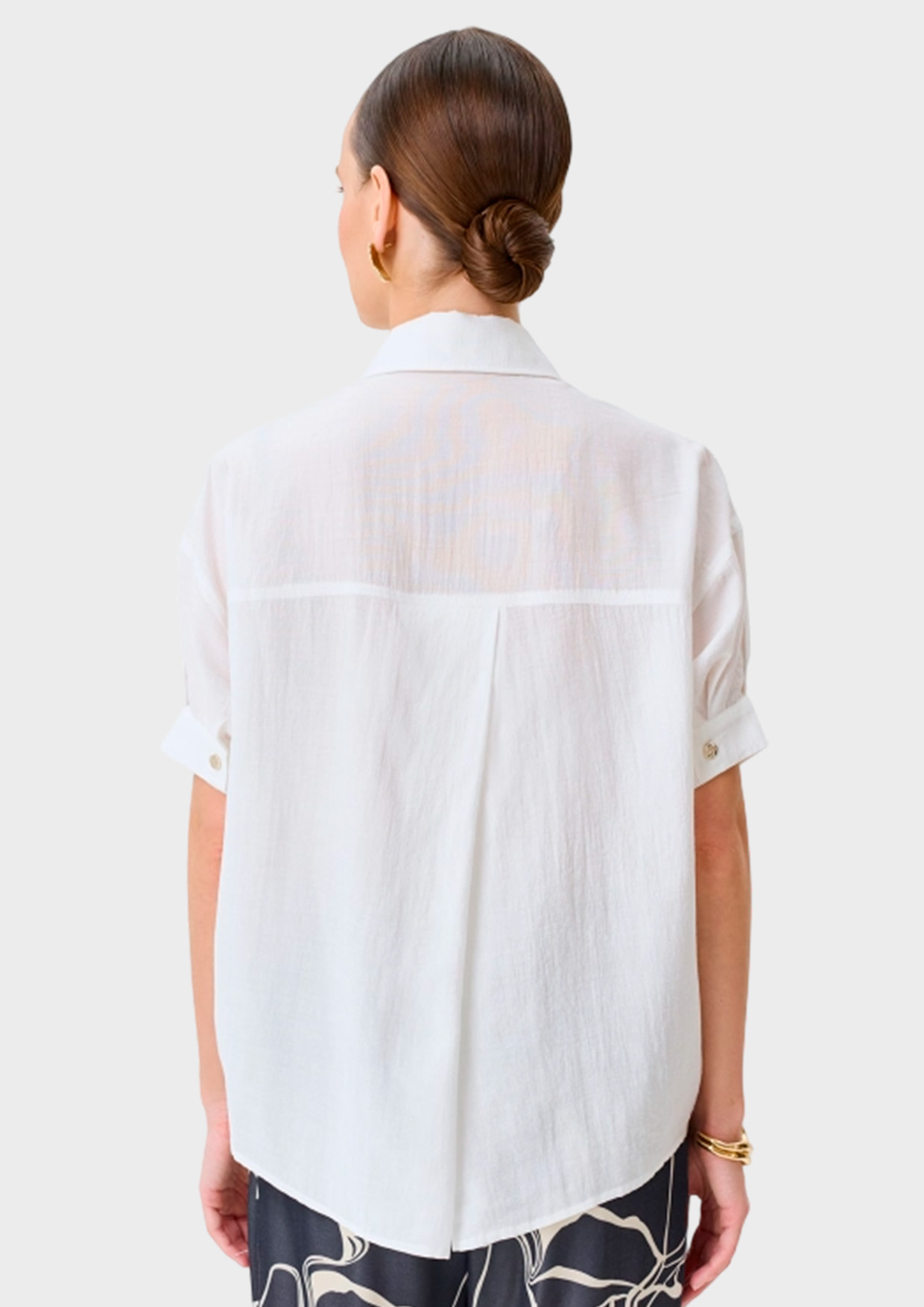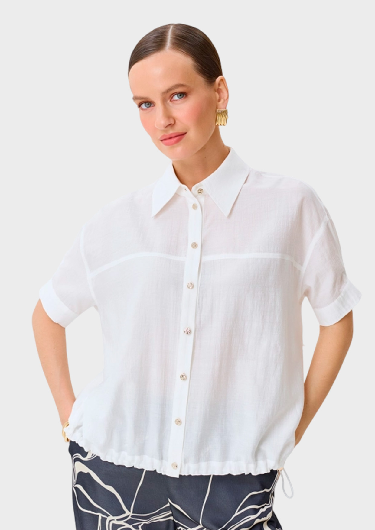 Полупрозрачная легкая блузка свободного силуэта из нейлона. Отложной воротник. Застежка на золотистые пуговицы. Спущенная линия плеч и короткие втачные рукава с манжетами по низу. Дополнена кулисой с утяжниками по низу изделия. Спинка немного удлинена.