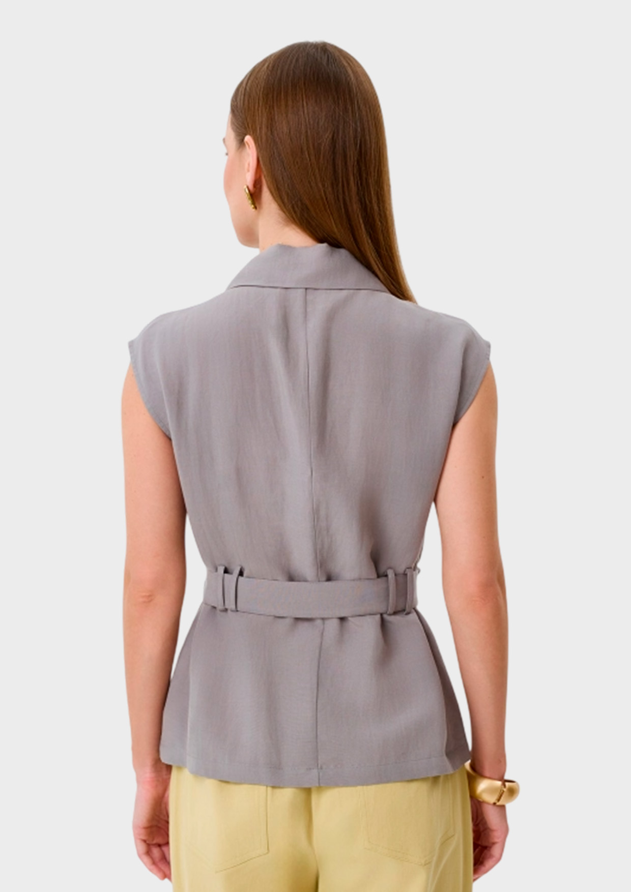 Блузка-жилет из тенселя. Прямой силуэт можно приталить поясом. Отложной воротник. Застежка на пуговицы. Накладные нагрудные карманы с клапанами на пуговицах. В составе лен.