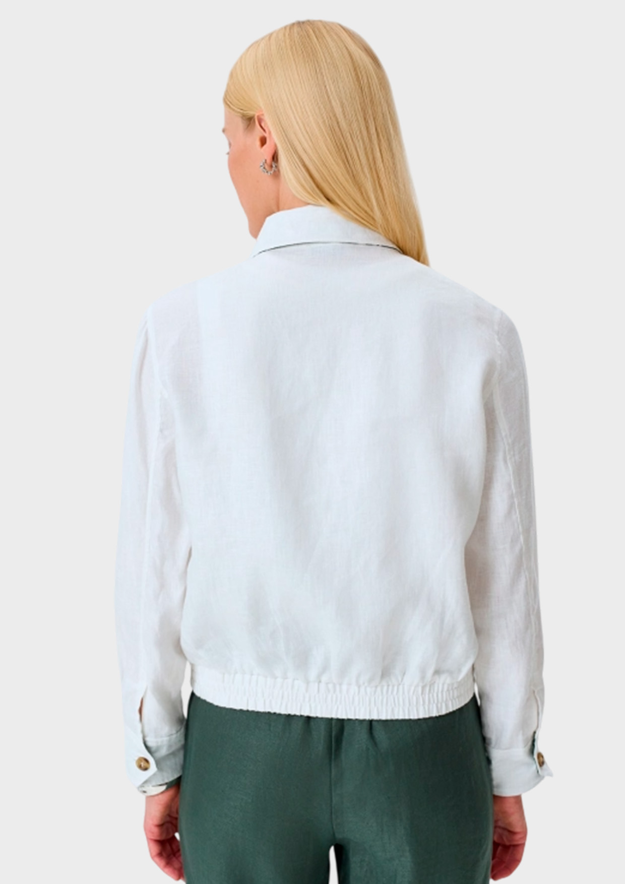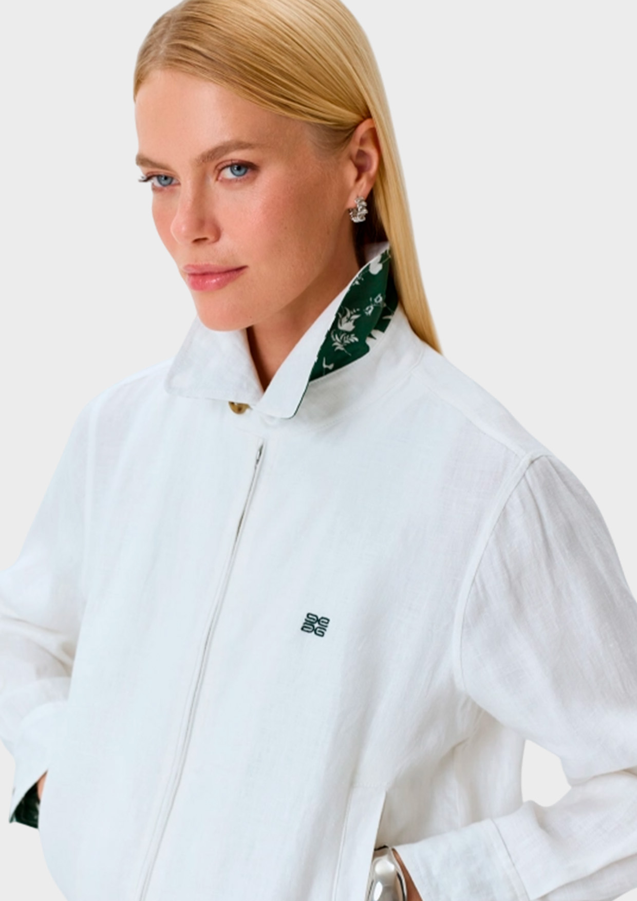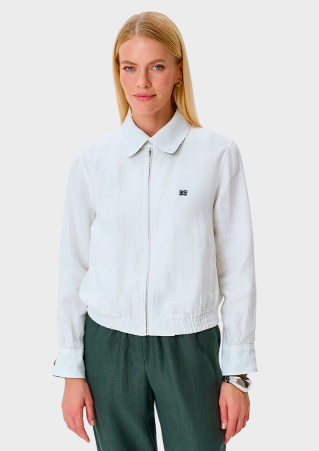 Свободный бомбер из 100% льна. Застежка на молнию. Отложной воротник на пуговице с контрастной принтованной подкладкой. Спущенная линия плеч и длинные втачные рукава с контрастными принтованными манжетами по низу. Дополнен контрастной брендированной вышивкой и резинкой по низу изделия.