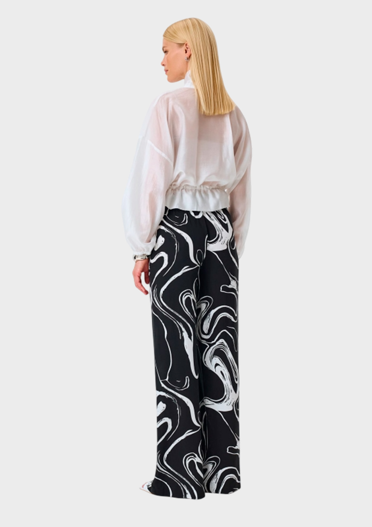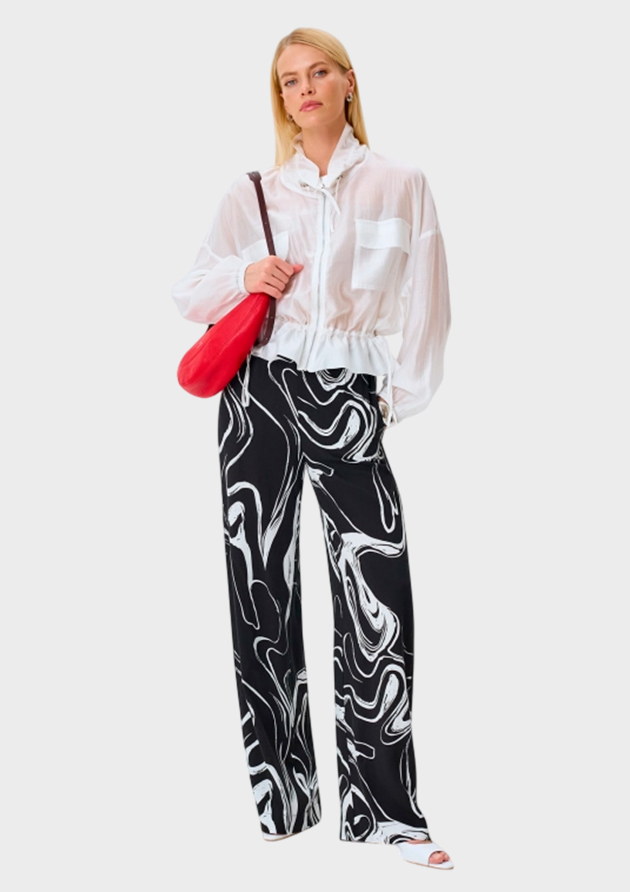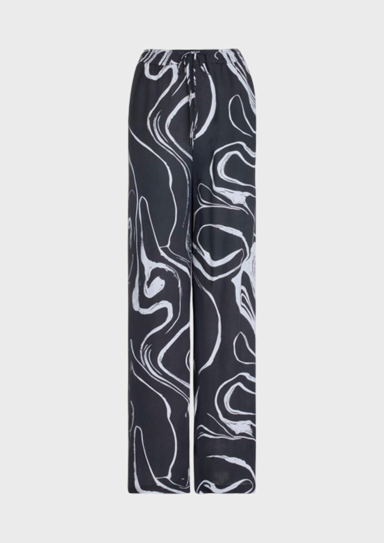 Брюки из 100% района с графичным принтом.  Прямой силуэт. Резинка и кулиса по линии талии. Боковые карманы в швах.