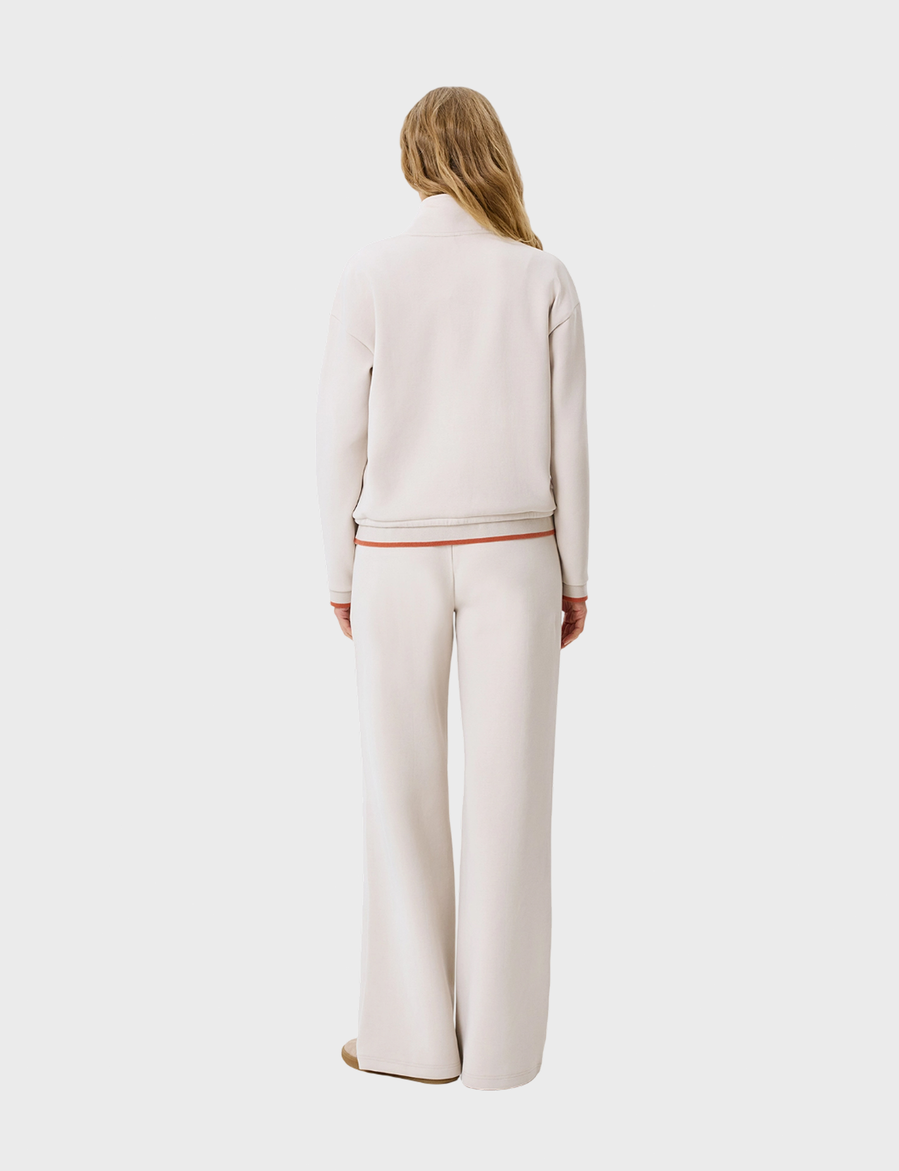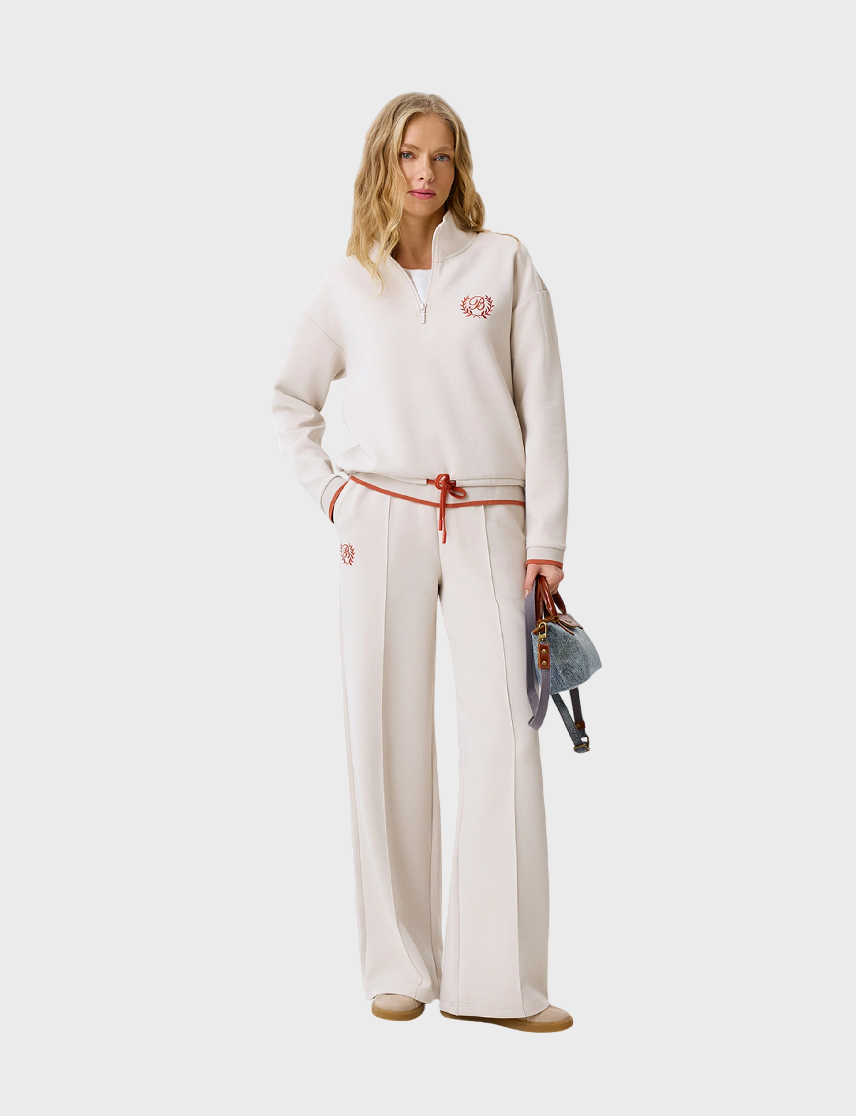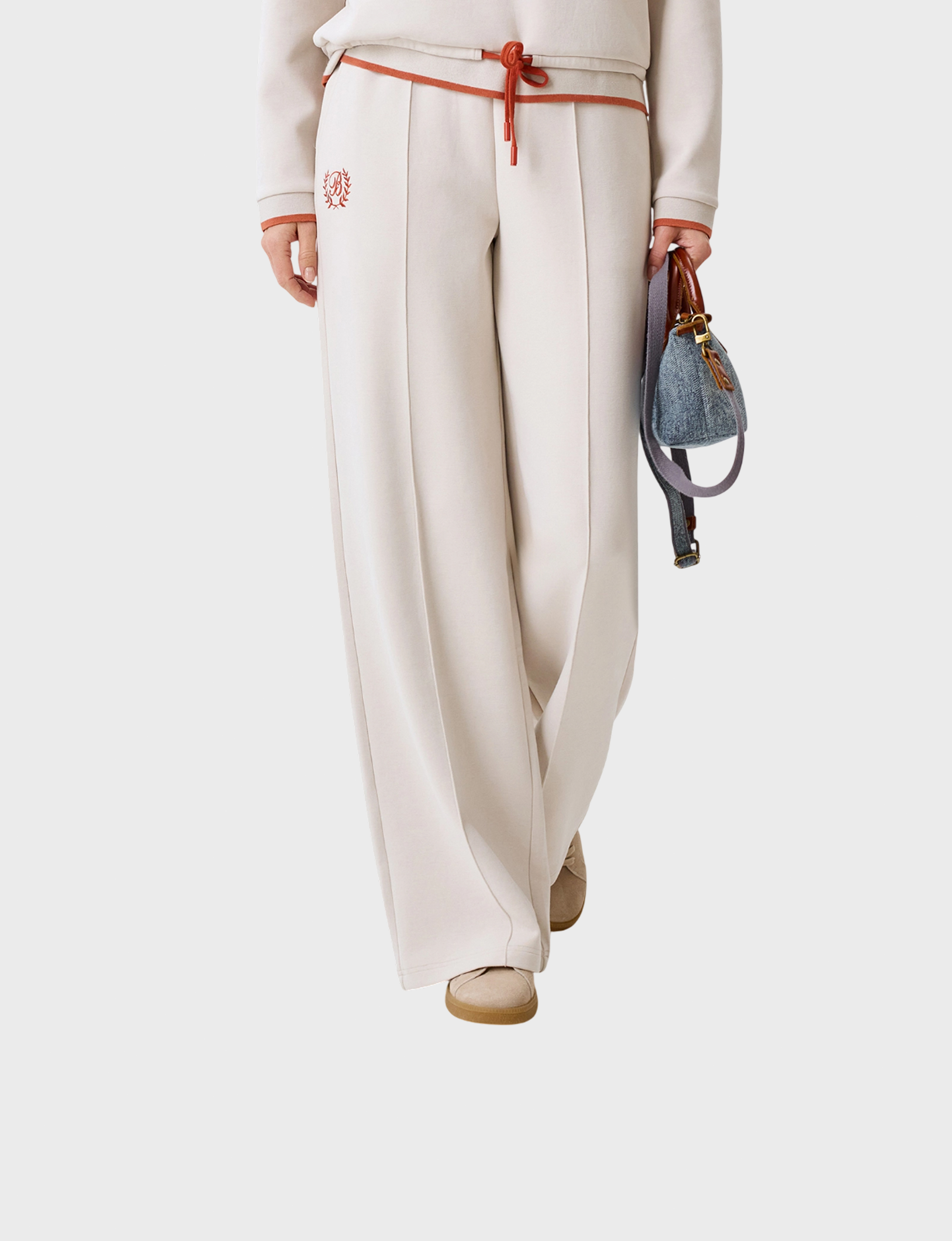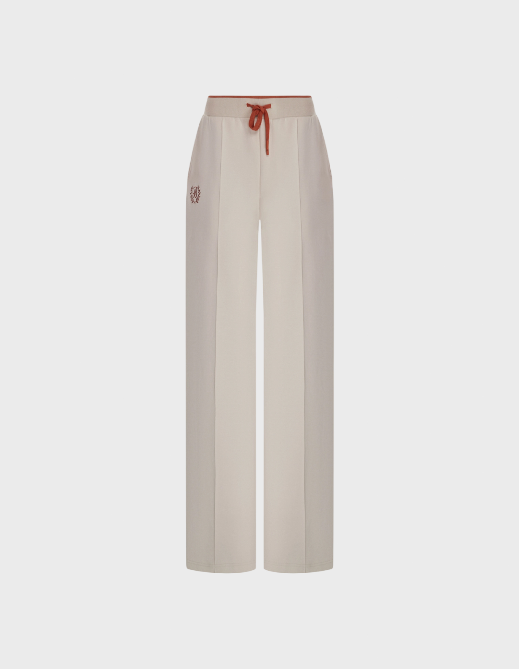 Трикотажные брюки из смесового хлопка с застроченными стрелками. Свободный силуэт. Резинка с кулисой и ярким шнурком по талии. Боковые карманы в швах. Дополнены контрастной вышивкой.