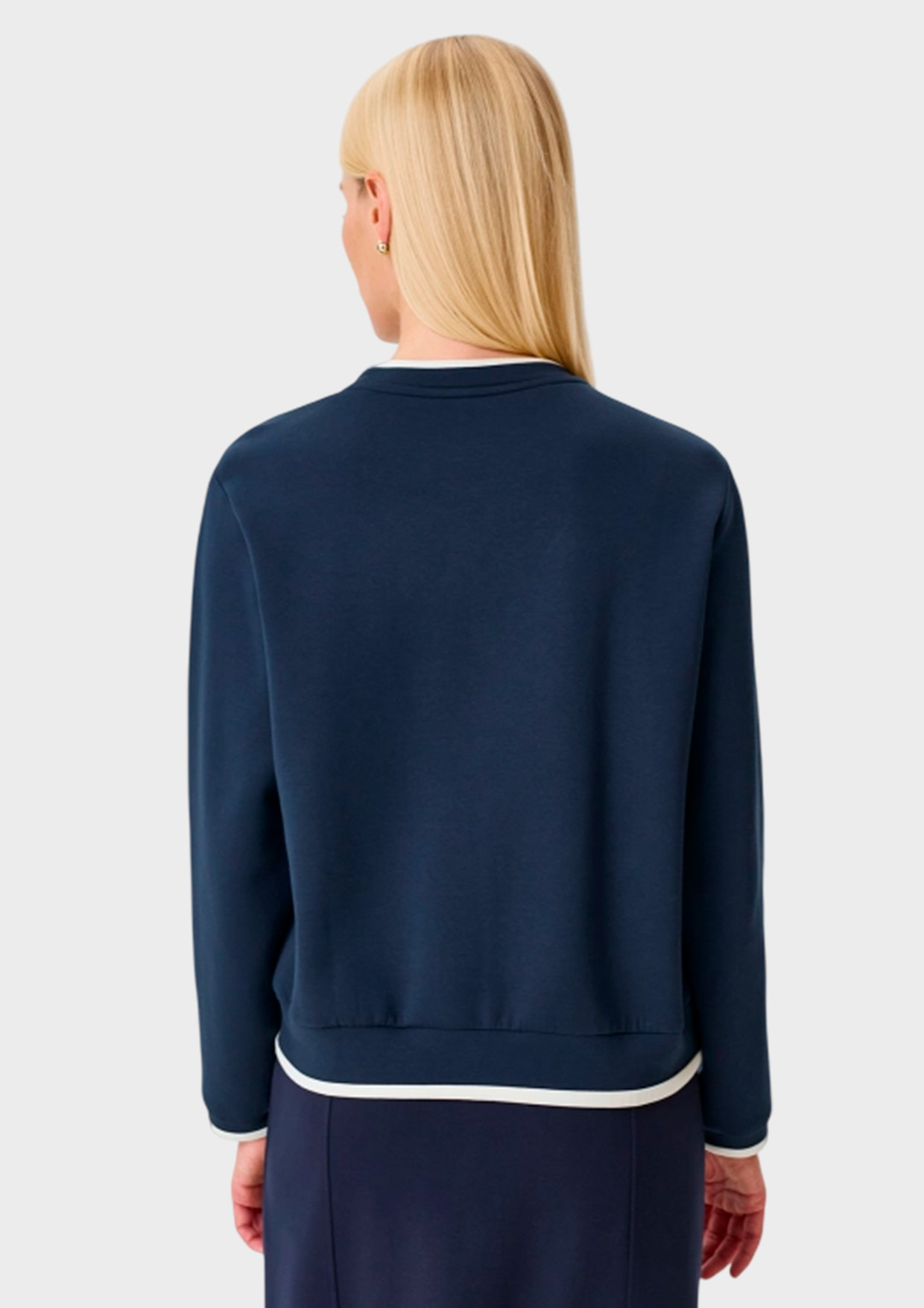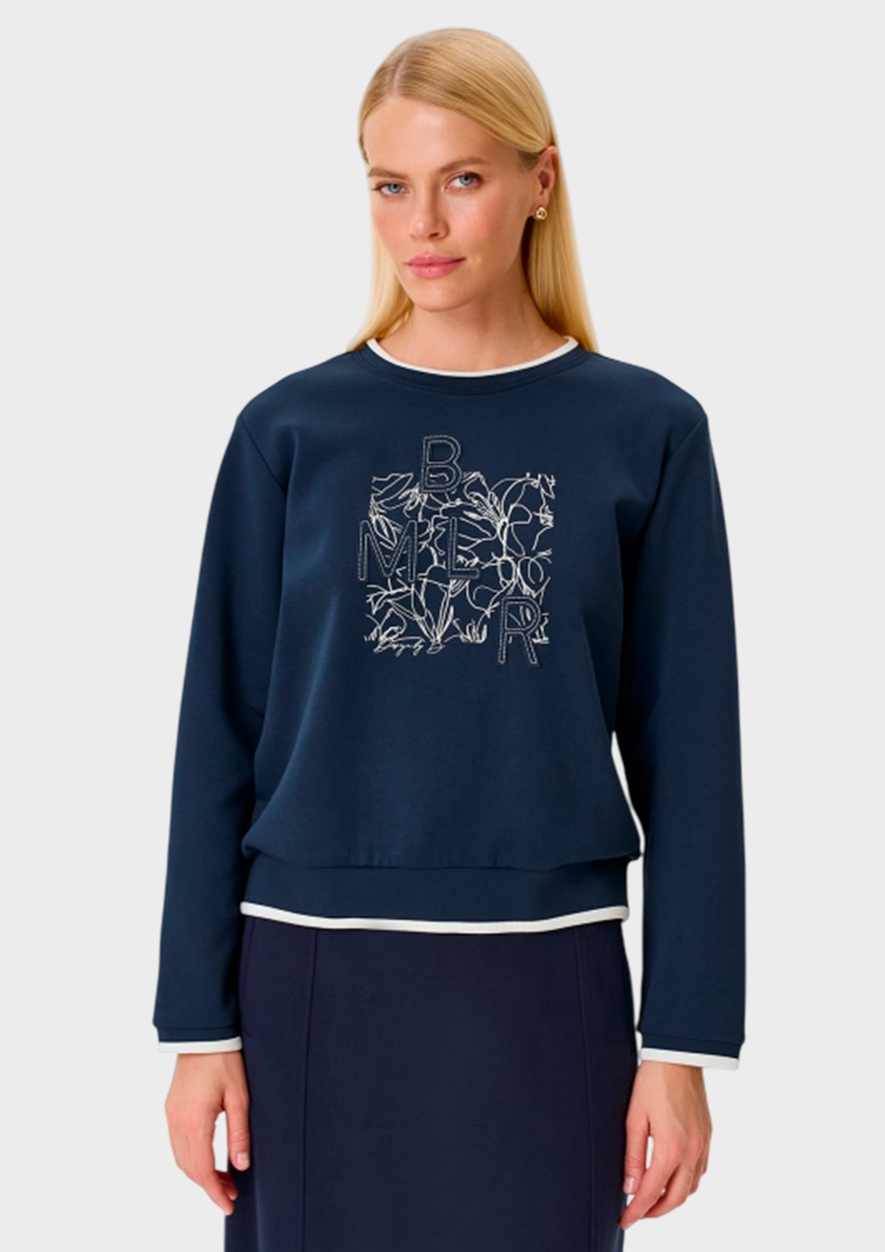 Свитшот с акцентным графичным принтом из модала и хлопка. Прямой силуэт. Круглый вырез. Линия плеч немного спущена. Дополнен контрастным рибом по горловине, низу рукавов и изделия.