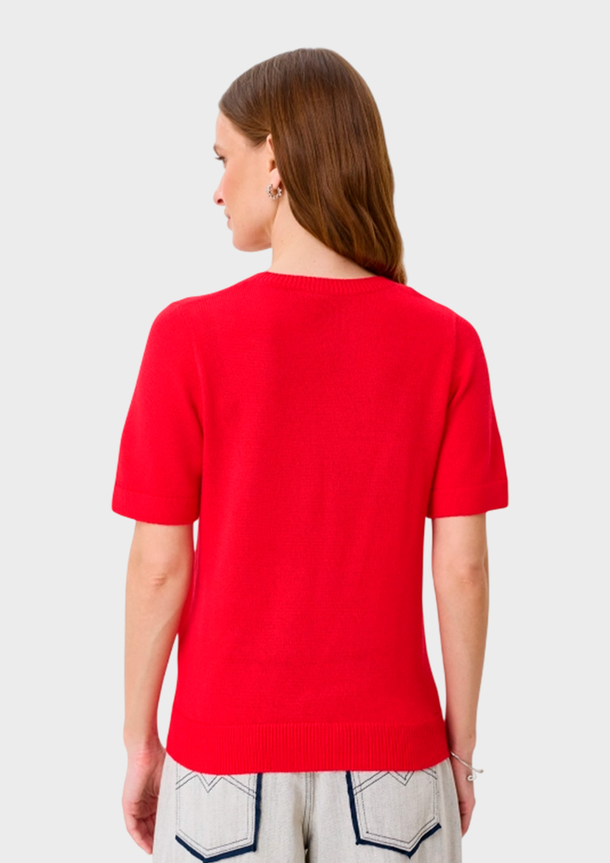 Яркий джемпер из района и льна. Прямой силуэт. Круглый вырез. Короткие втачные рукава. Дополнен рибом по низу рукавов и изделия.