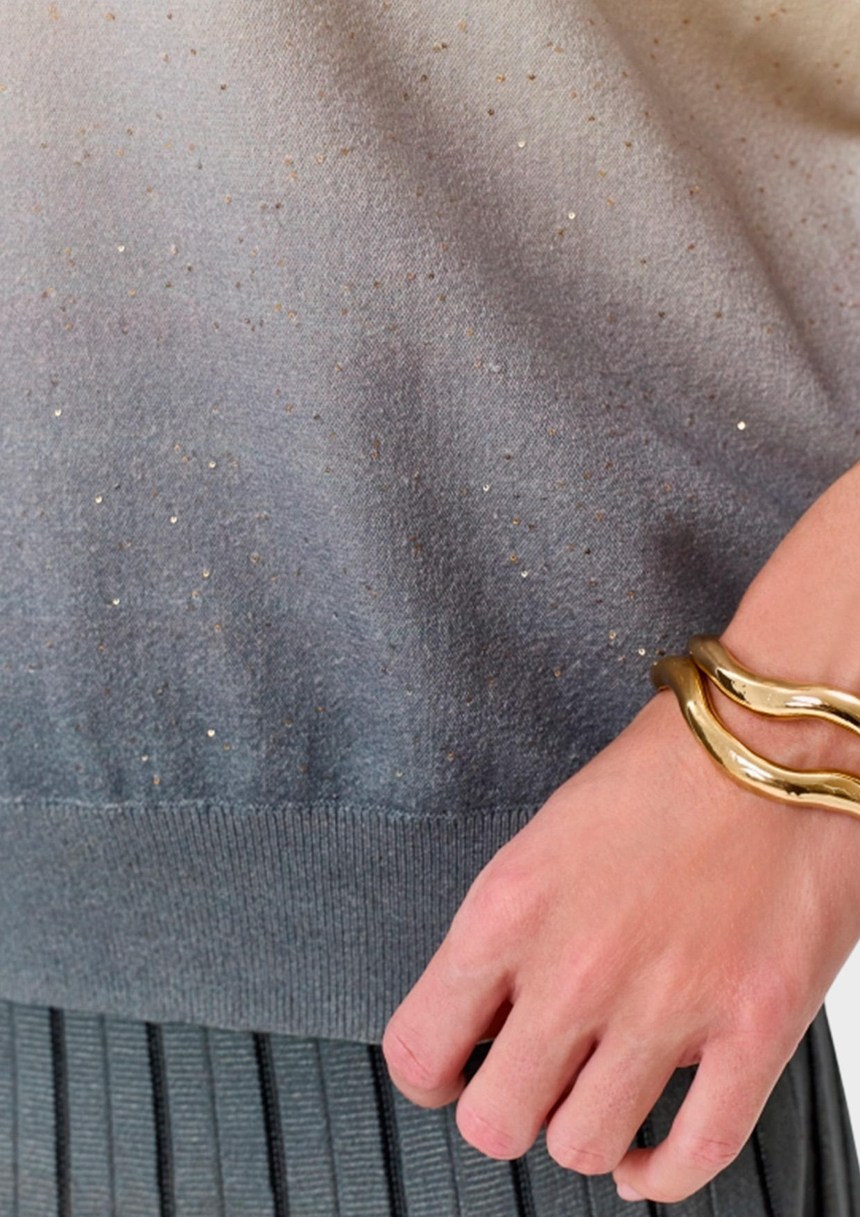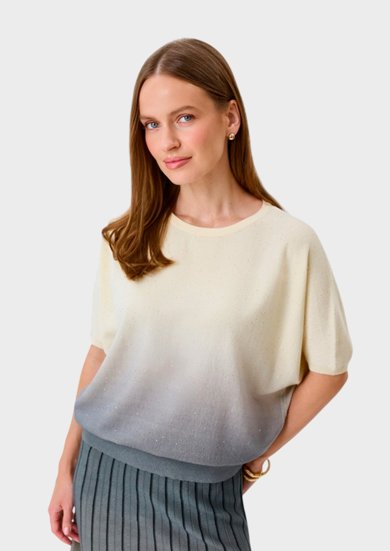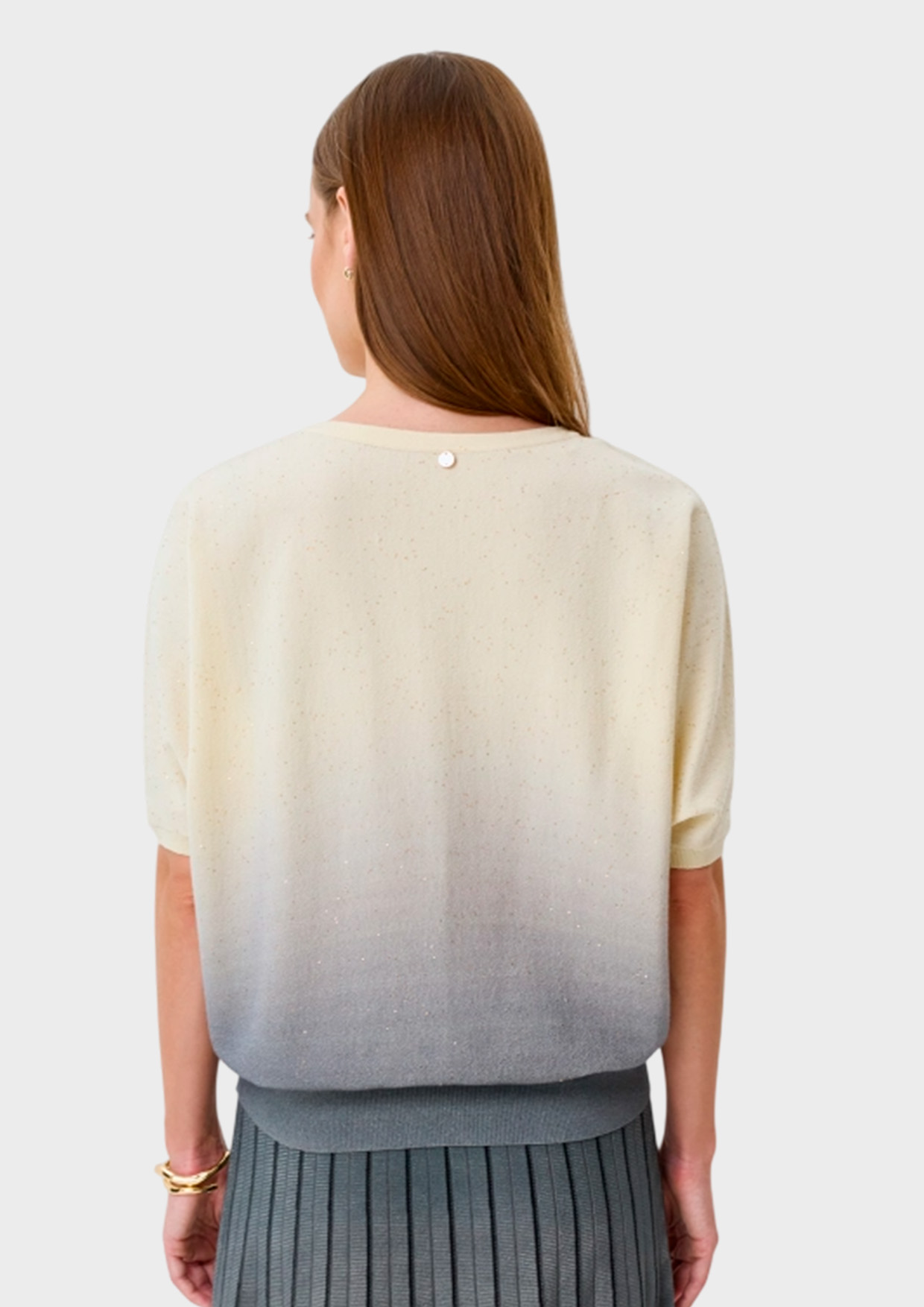 Яркий джемпер с градиентным принтом и мерцающими пайетками. Свободный силуэт. Круглый вырез. Укороченные цельнокроенные рукава. Дополнен рибом по низу изделия. В составе район и нейлон.
