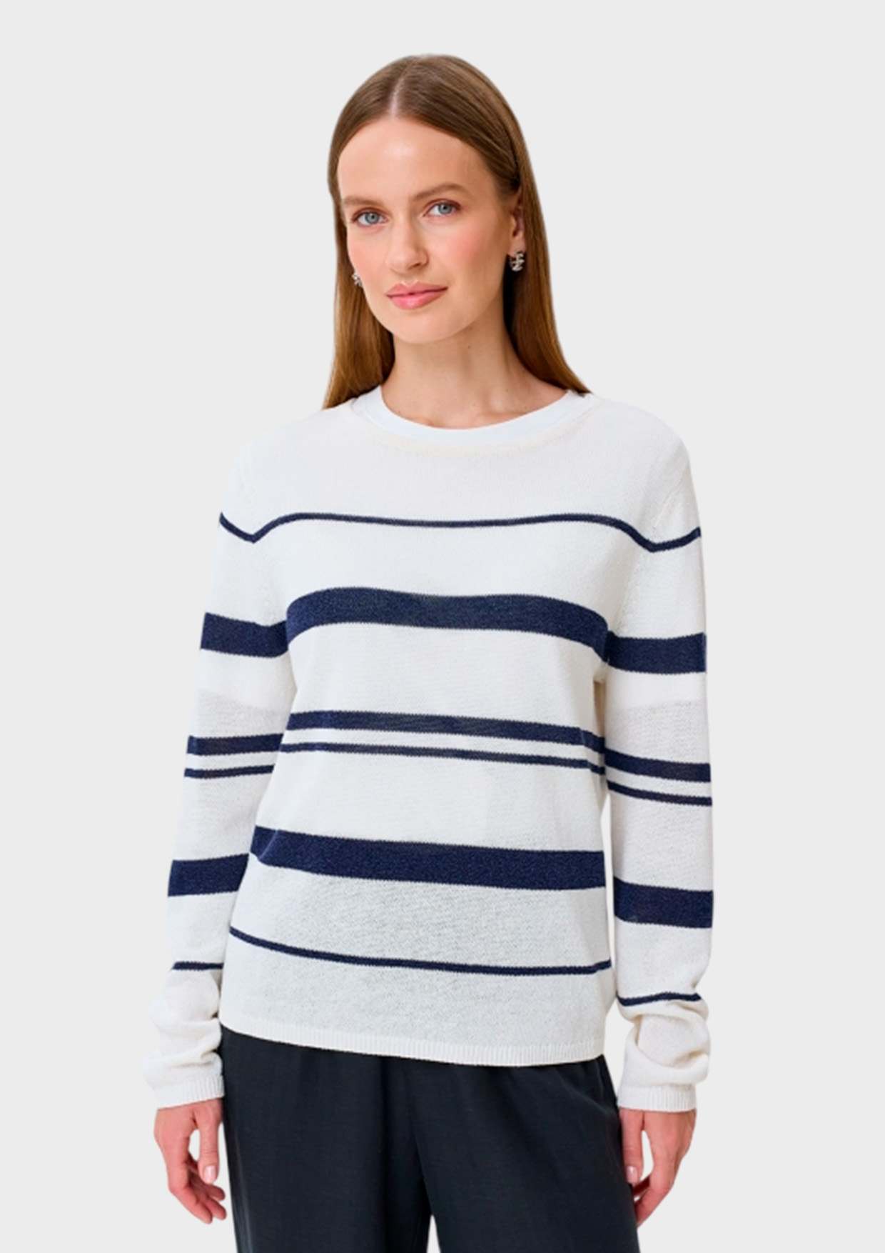 Фактурный вязаный джемпер в контрастную полоску из смесовой вискозы и льна. Прямой силуэт. Вырез лодочка. Длинные втачные рукава.