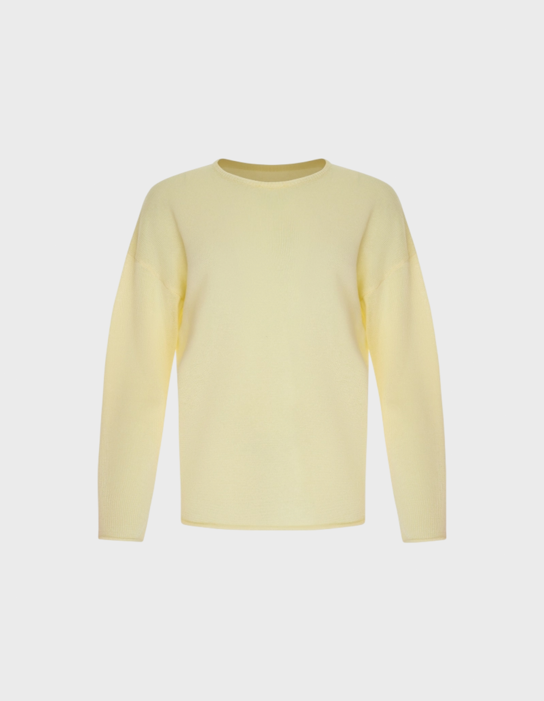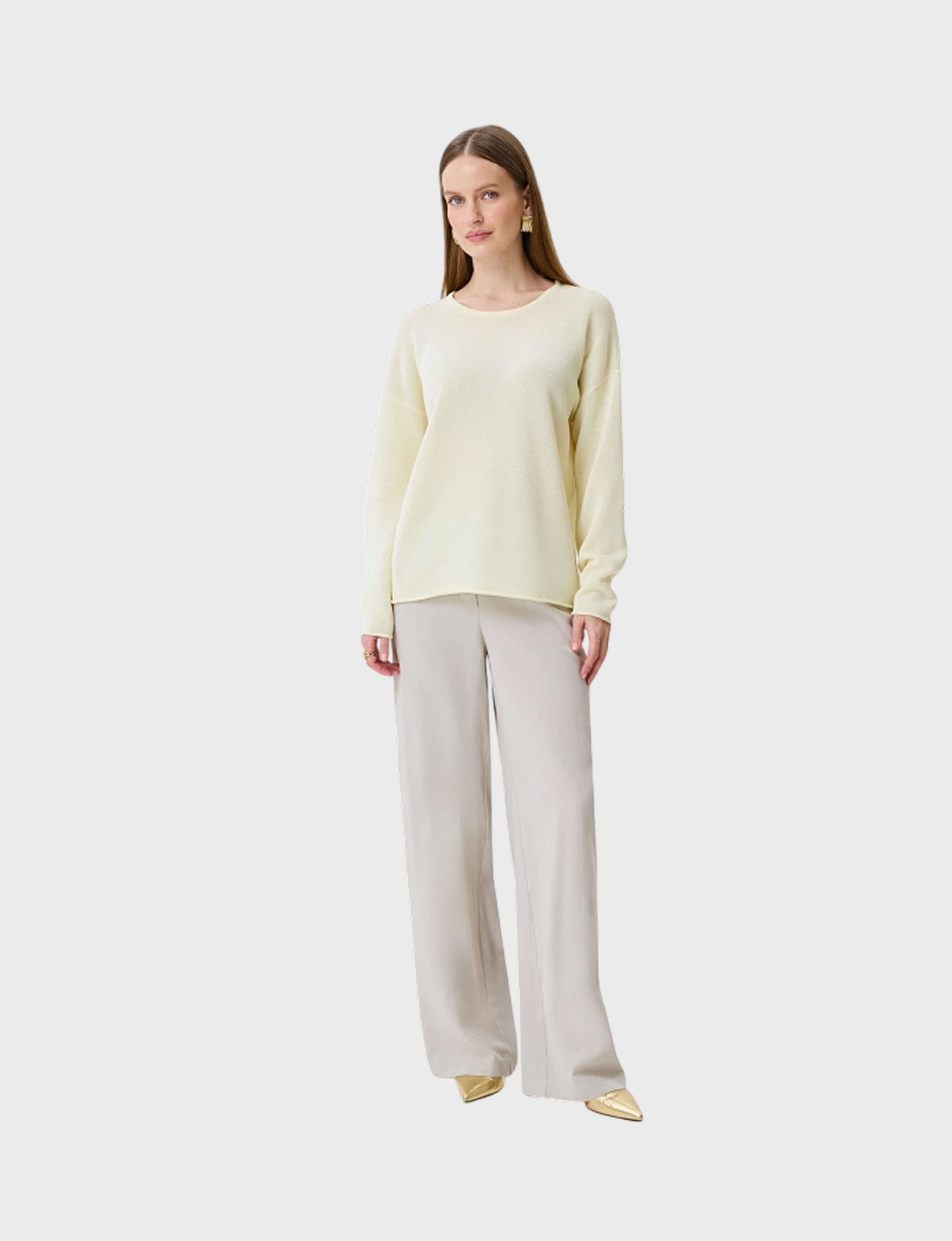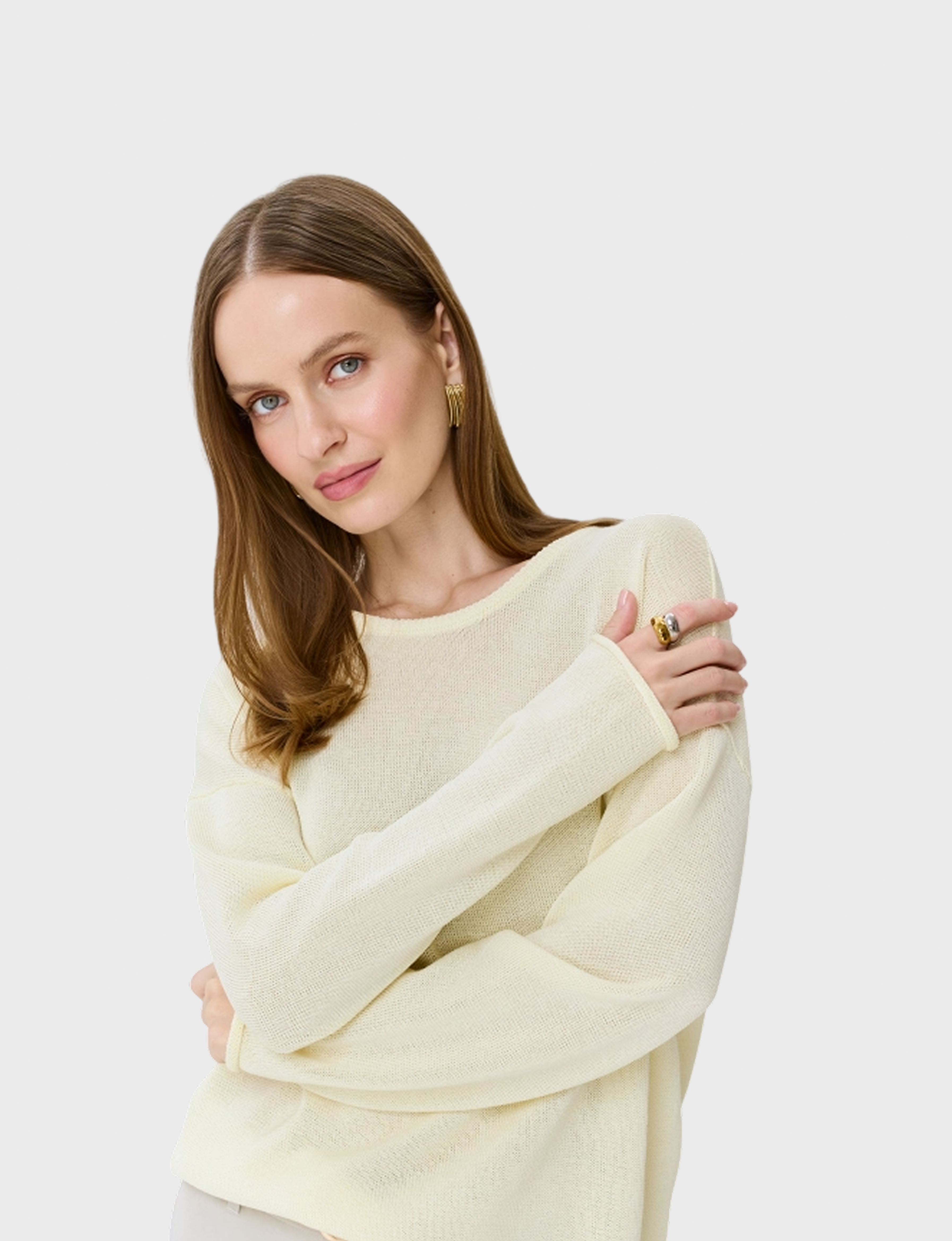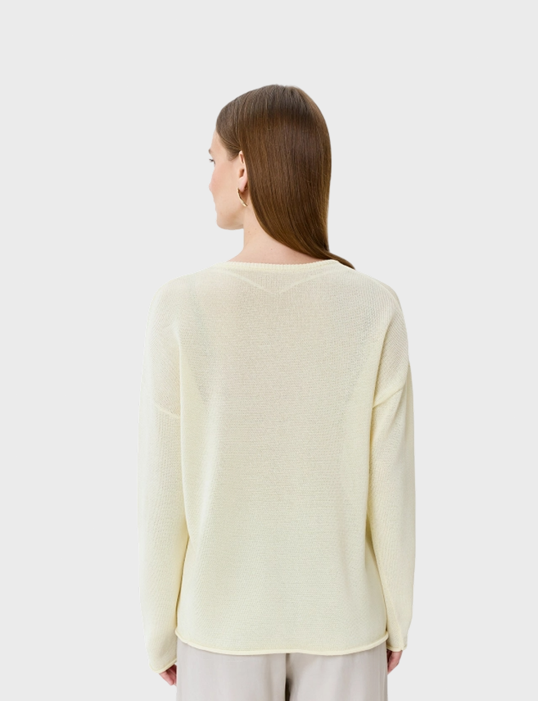 Вязаный джемпер свободного силуэта. Круглый вырез. Спущенная линия плеч и длинные втачные рукава. По низу рукавов и изделия закругленный край. В составе вискоза.