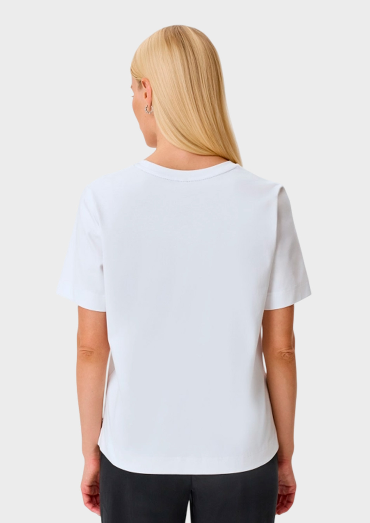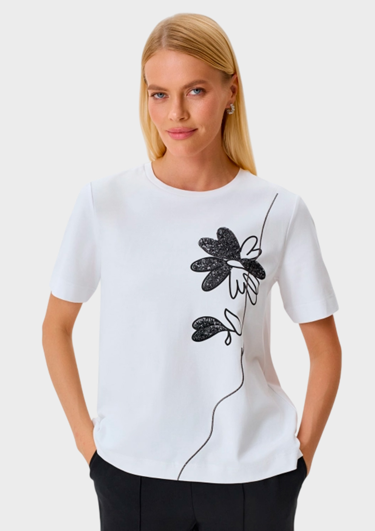 Футболка из 100% хлопка с контрастными мерцающими стразами и монохромным принтом. Прямой силуэт. Круглый вырез. Короткие втачные рукава.