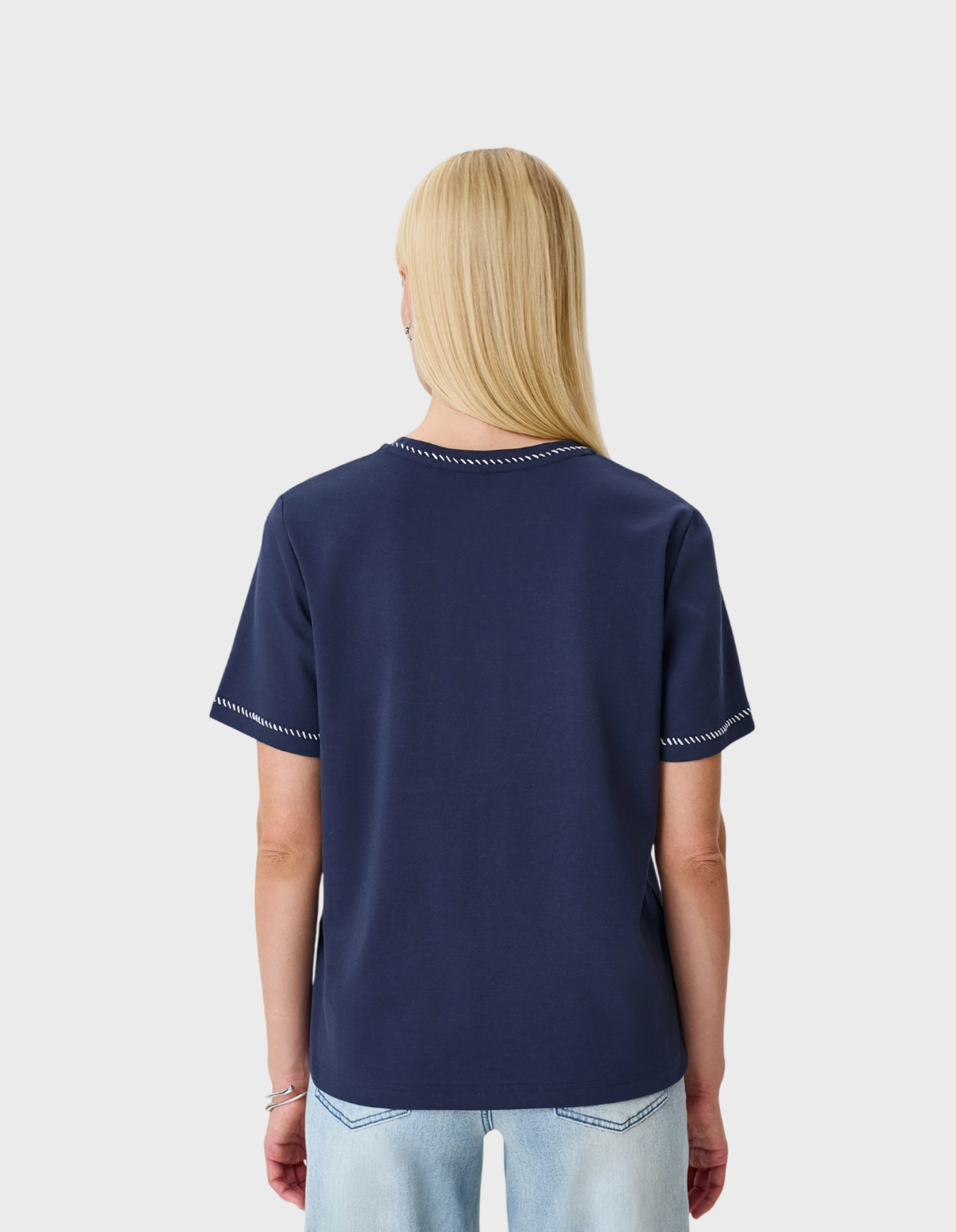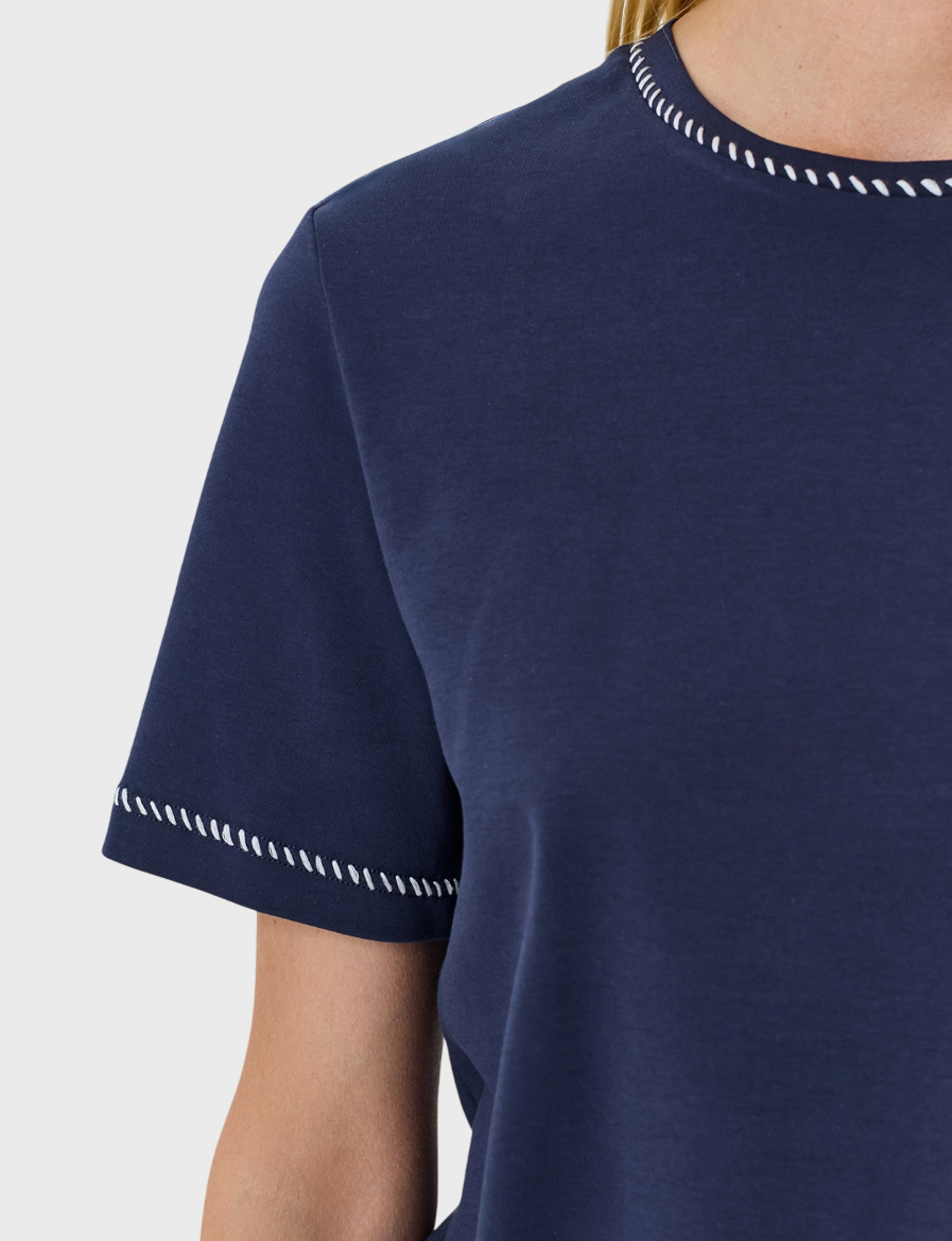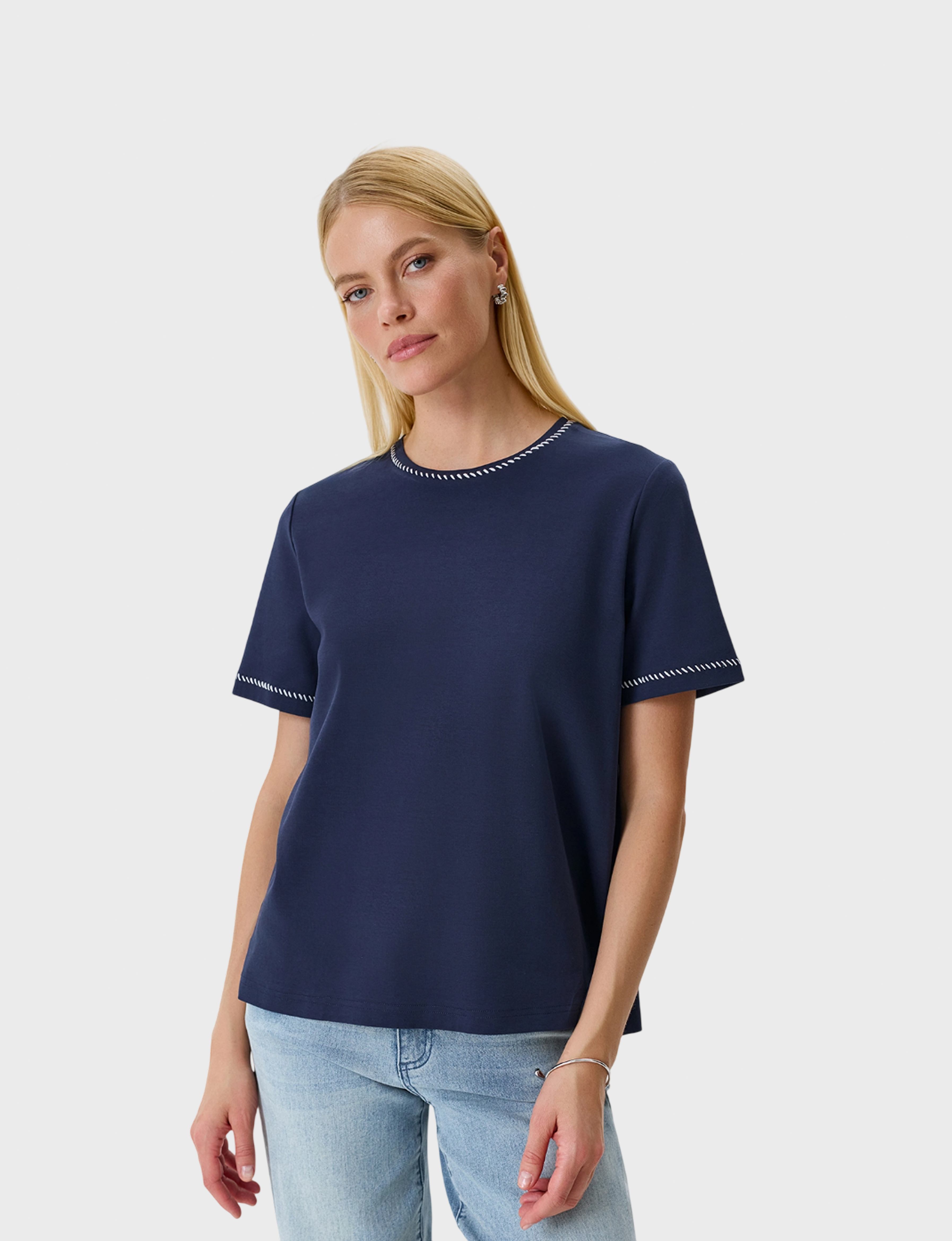Футболка из 100% хлопка. Прямой силуэт. Круглый вырез. Короткие втачные рукава. Дополнена декоративным контрастным стежком по горловине и низу рукавов.