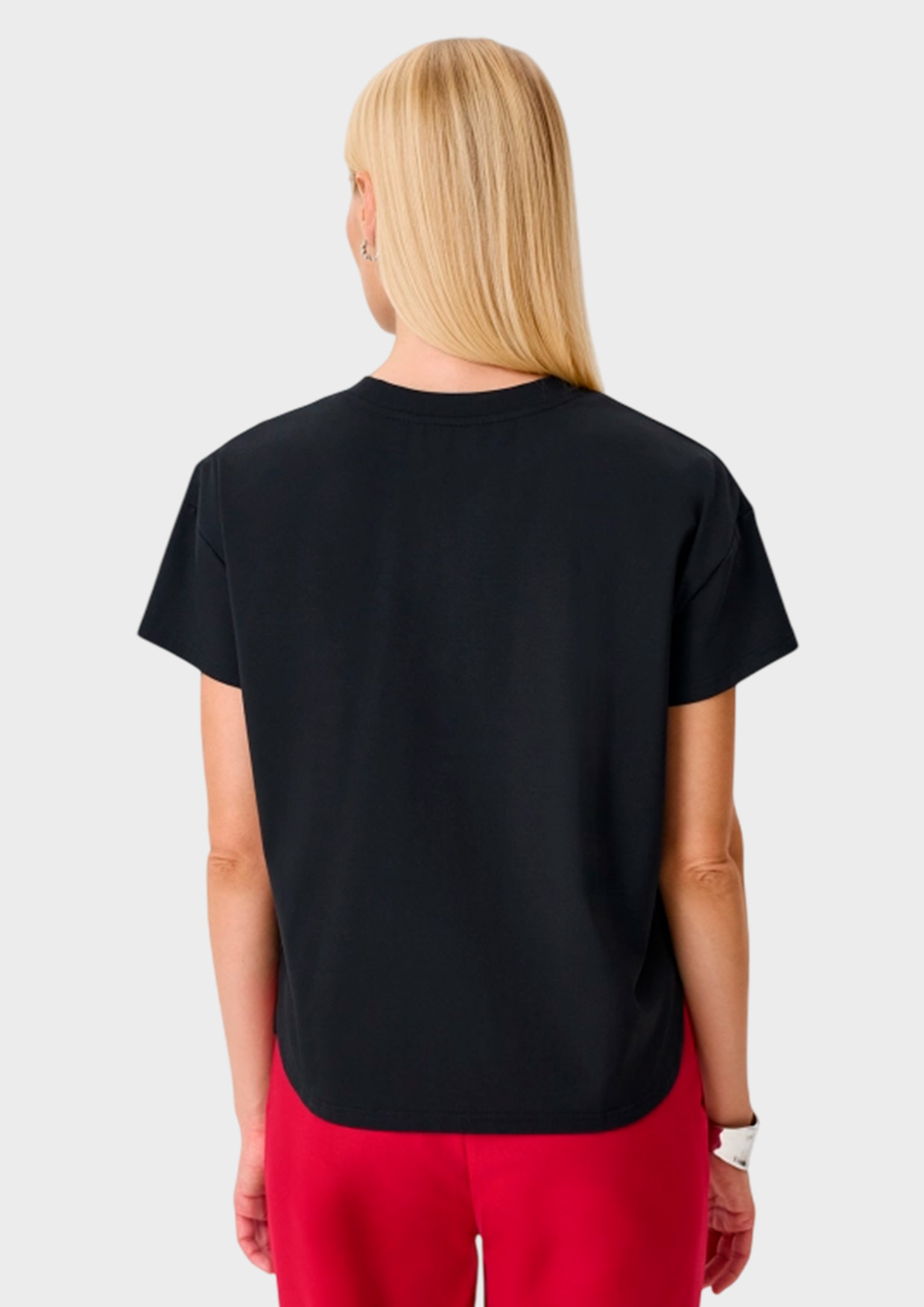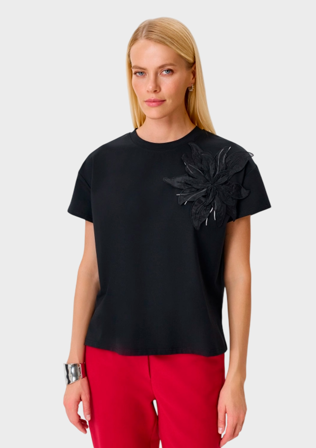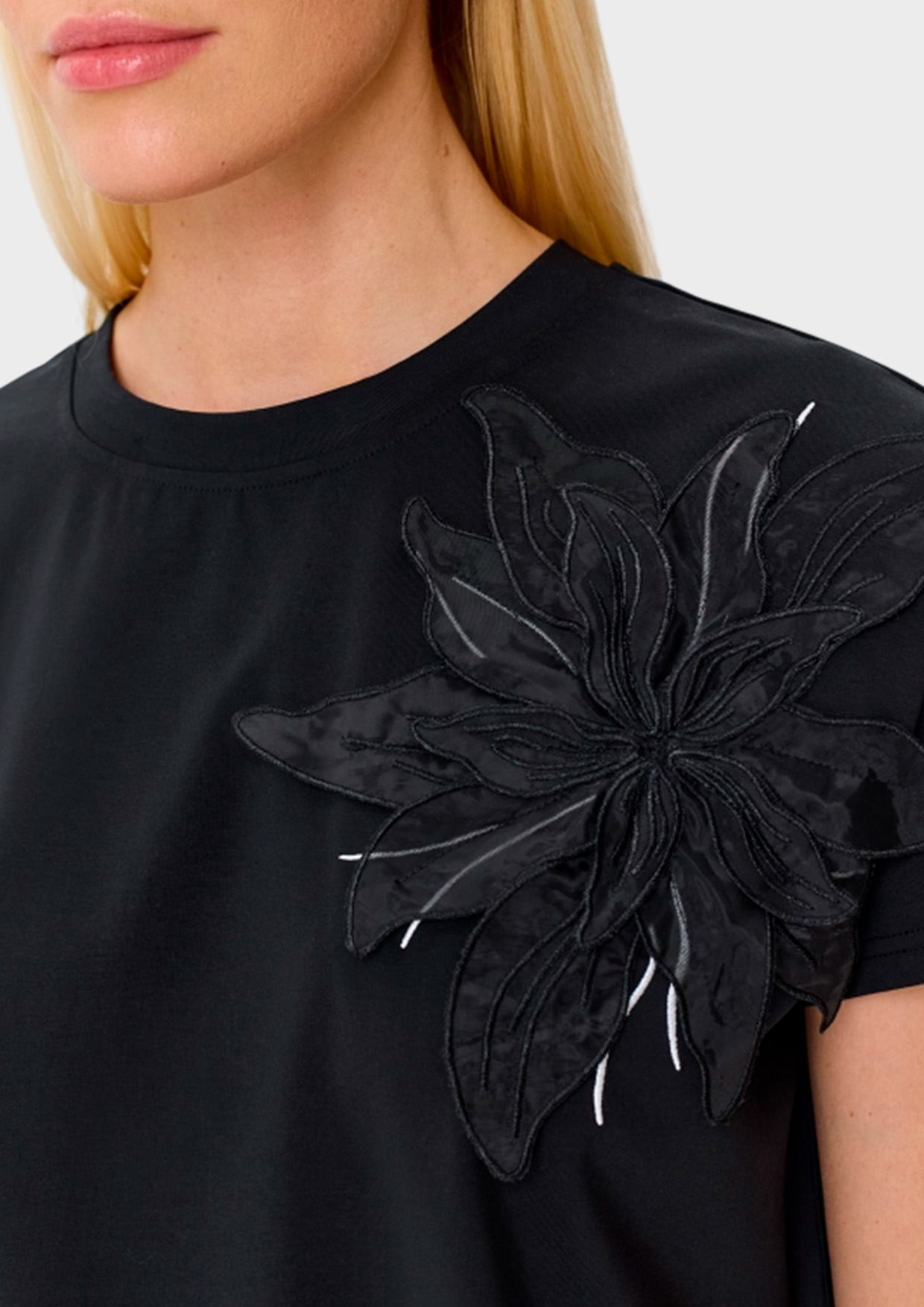 Блузка из мягкого модала и хлопка с акцентной цветочной аппликацией. Свободный силуэт. Круглый вырез. Спущенная линия плеч и короткие втачные рукава.
