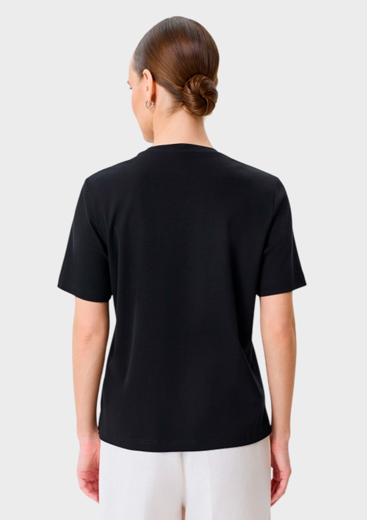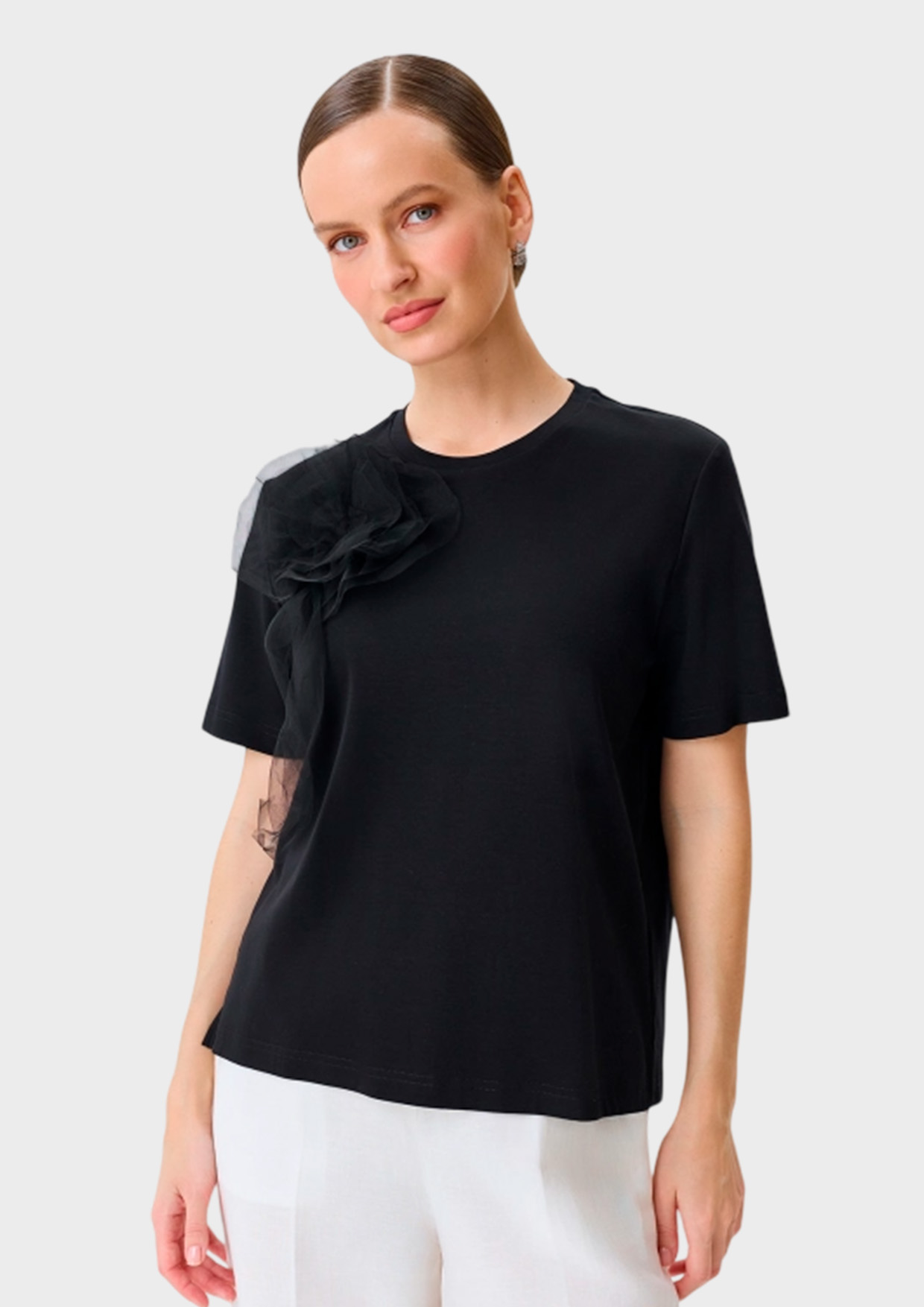 Футболка из 100% хлопка с объемной флоральной аппликацией из мягкого фатина. Прямой силуэт. Круглый вырез. Короткие втачные рукава.