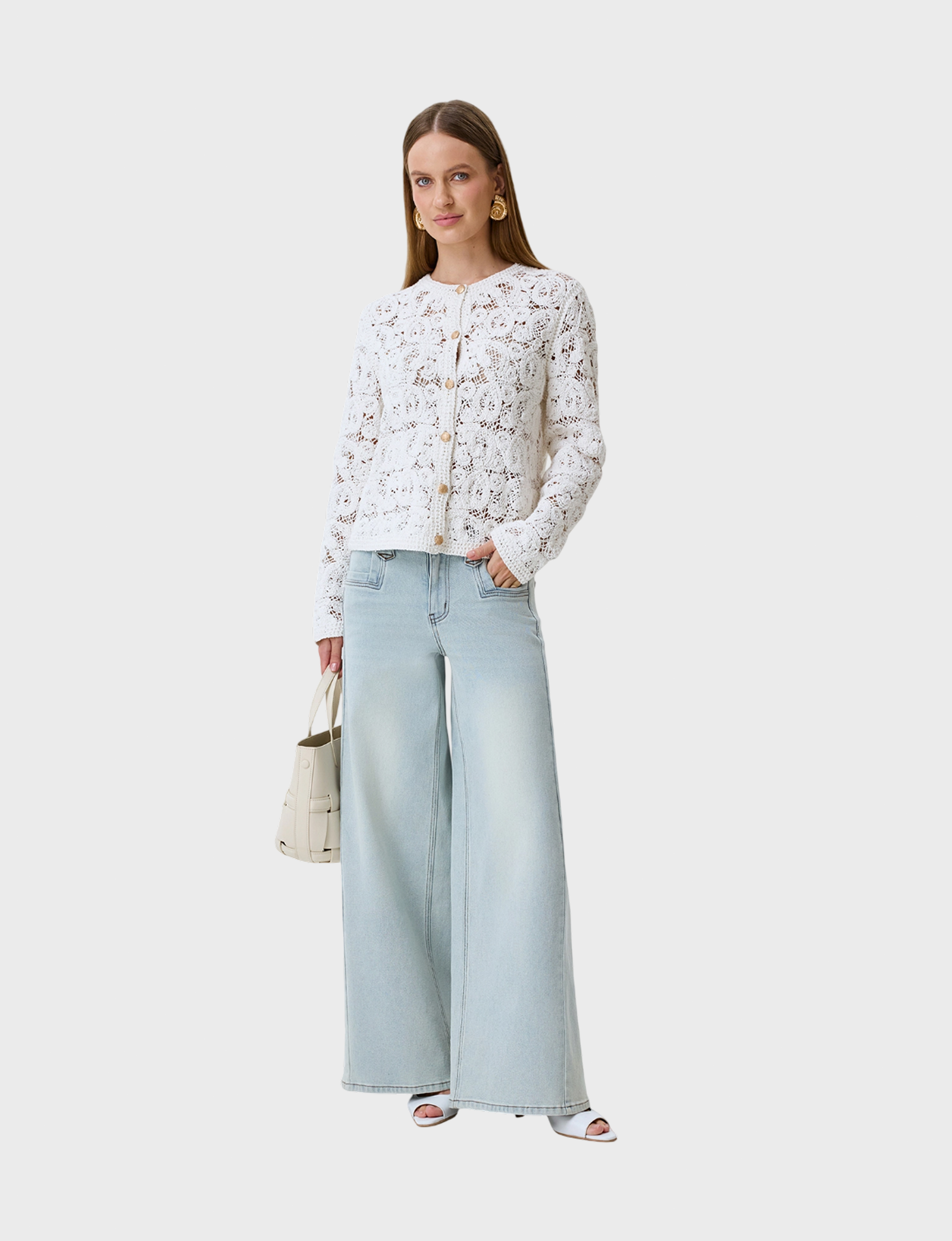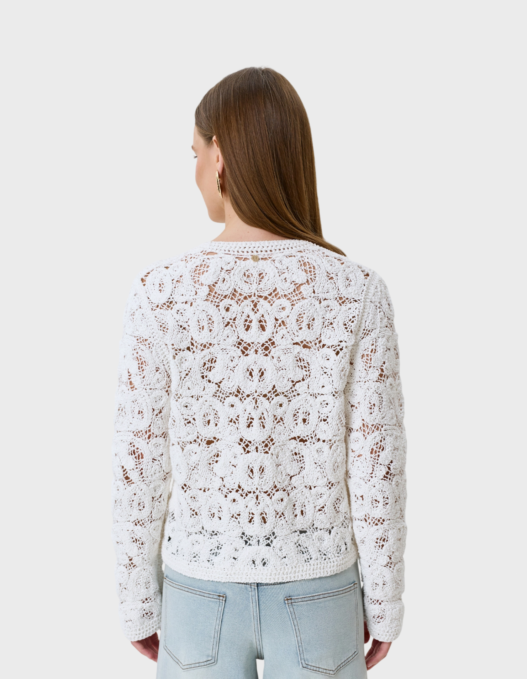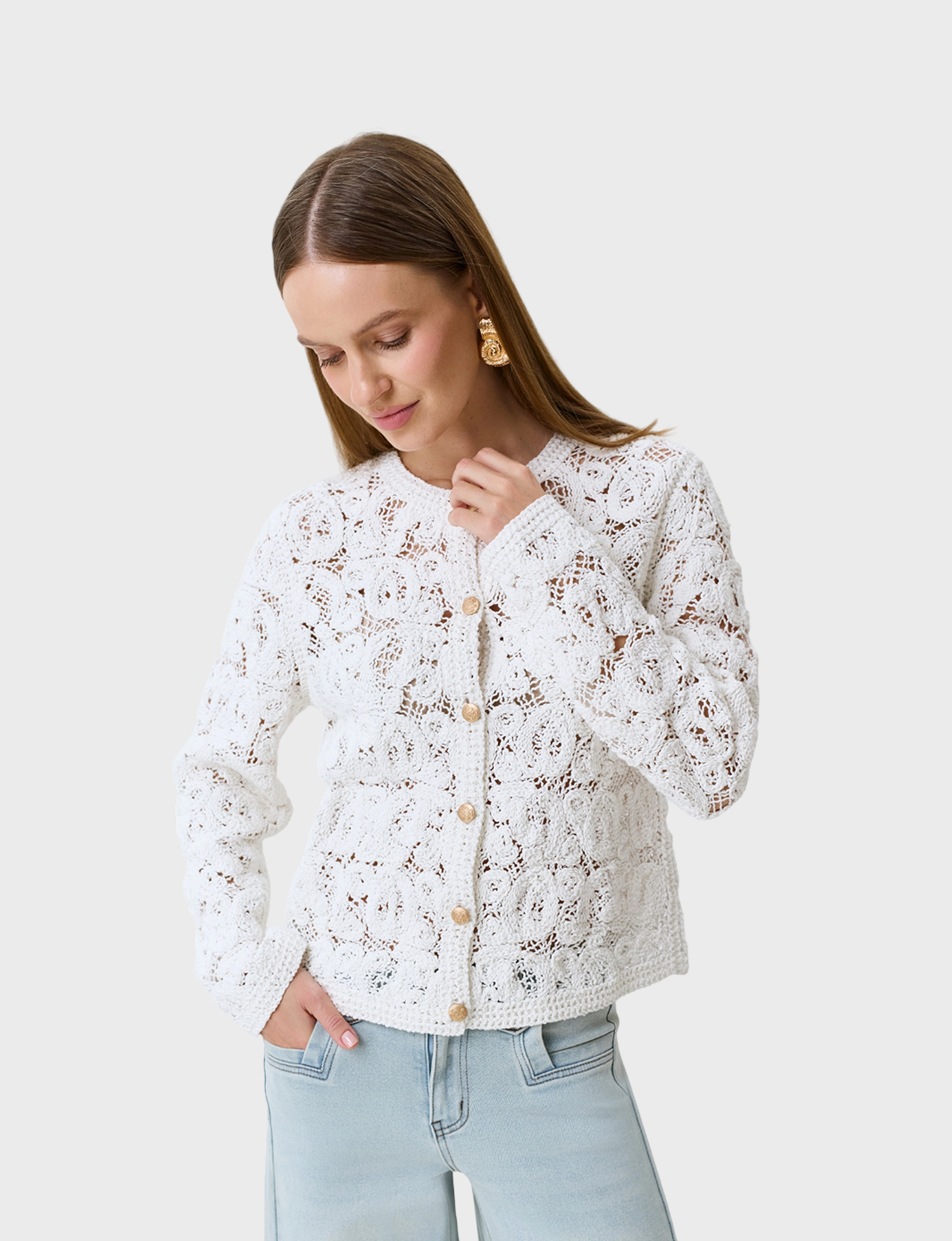 Ажурный полупрозрачный кардиган из 100% хлопка. Прямой силуэт. Круглый вырез. Длинные втачные рукава. Застежка на акцентные металлические пуговицы.