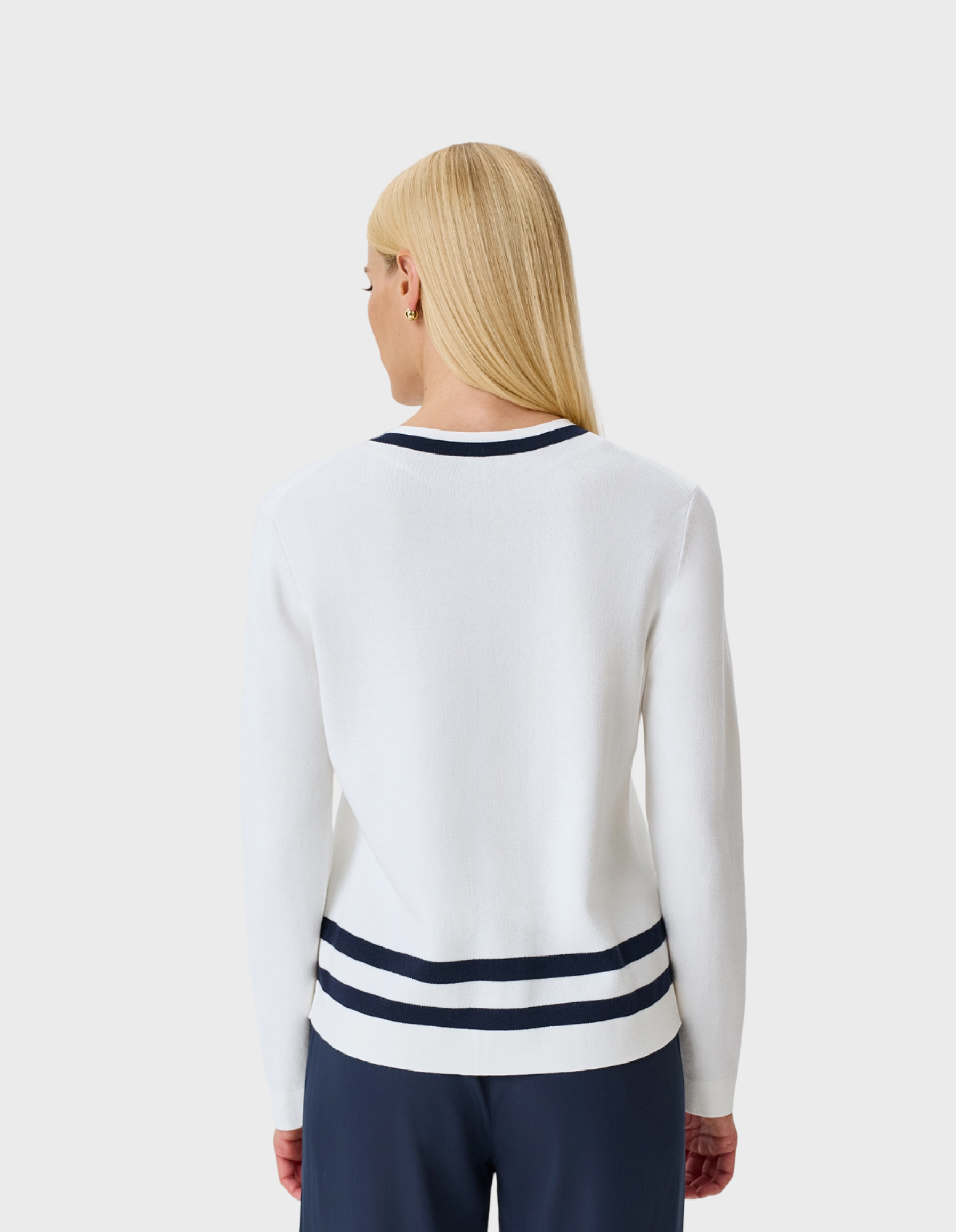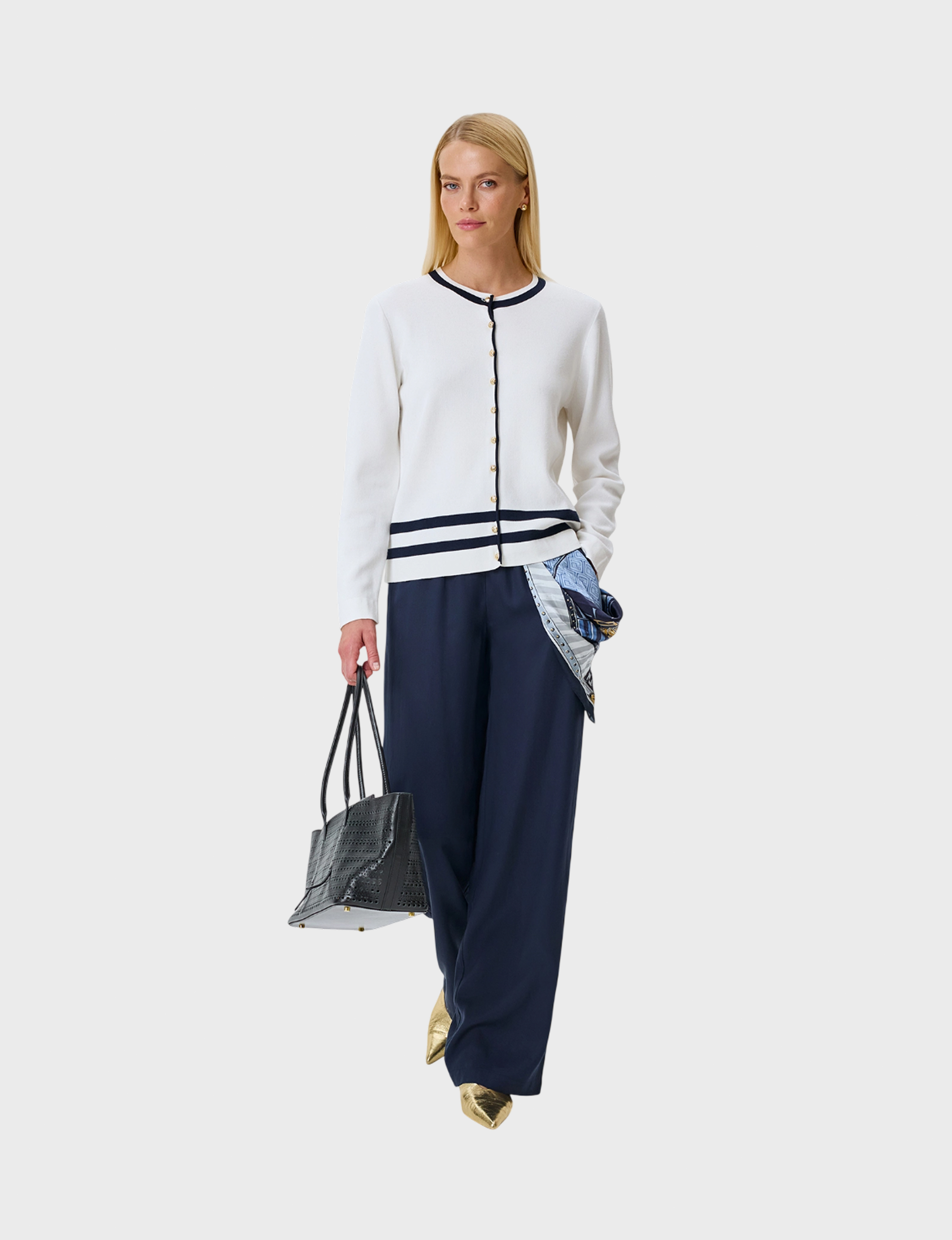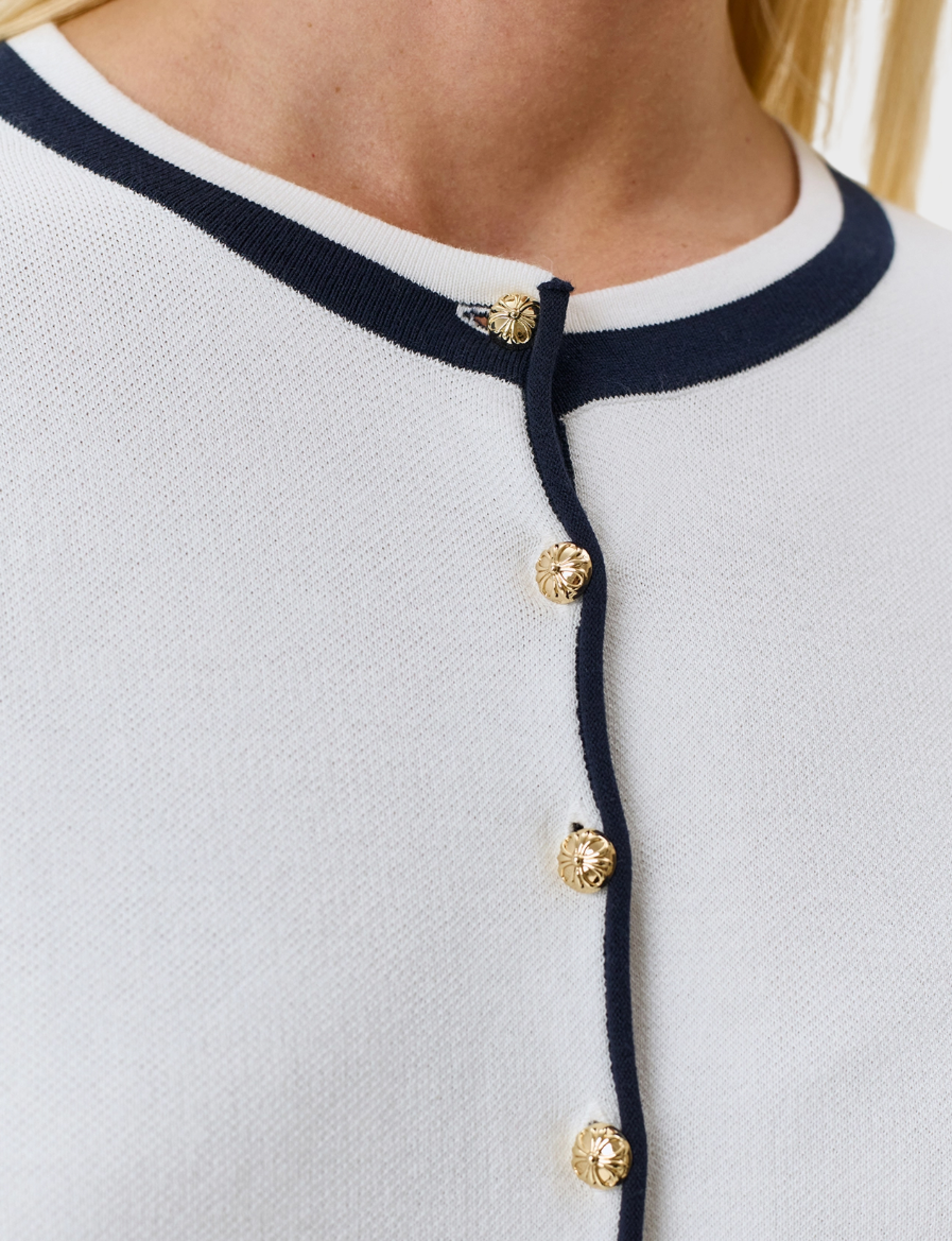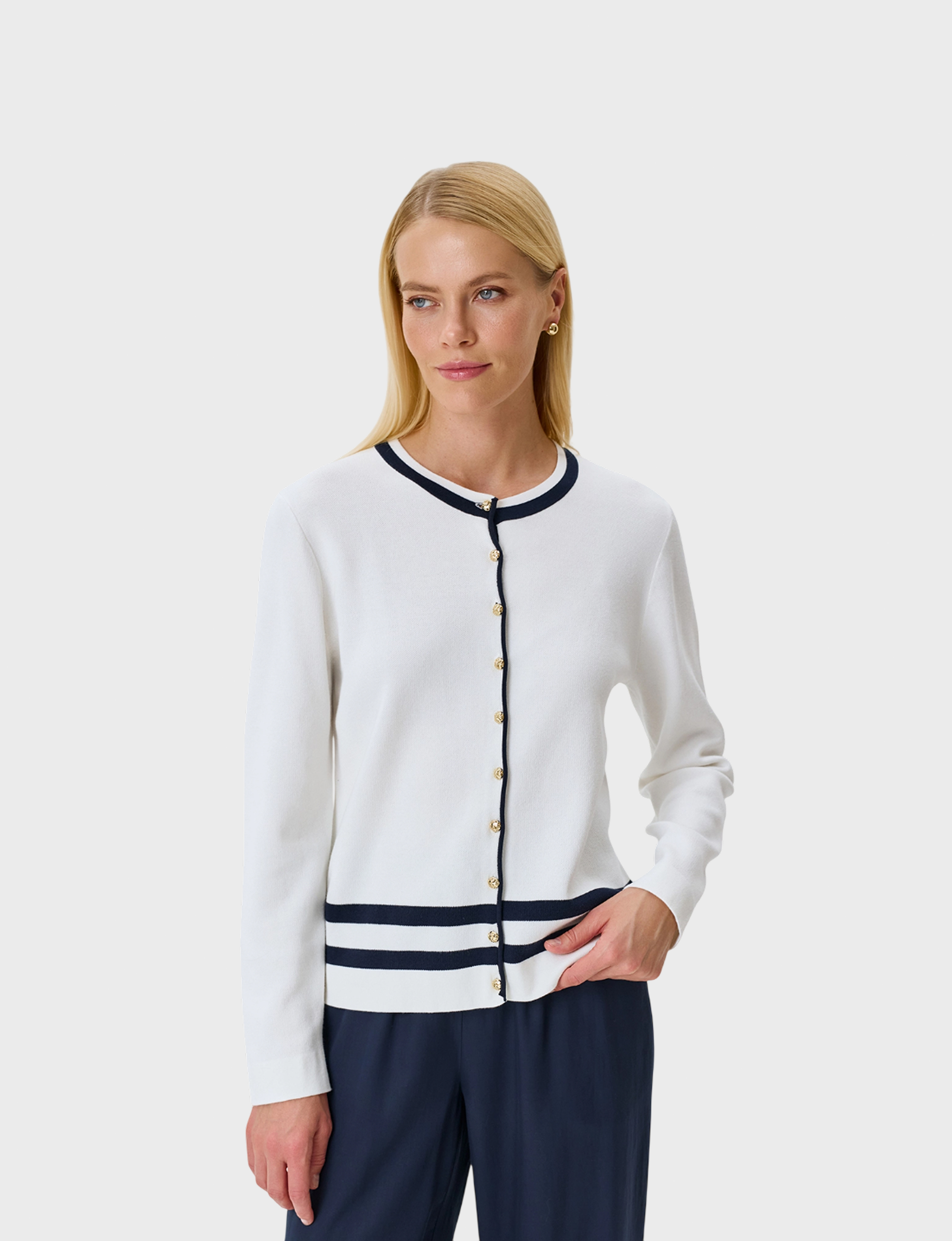 Кардиган из мягкого модала и хлопка с контрастной отделкой. Прямой силуэт. Круглый вырез. Застежка на золотистые пуговицы. Длинные втачные рукава