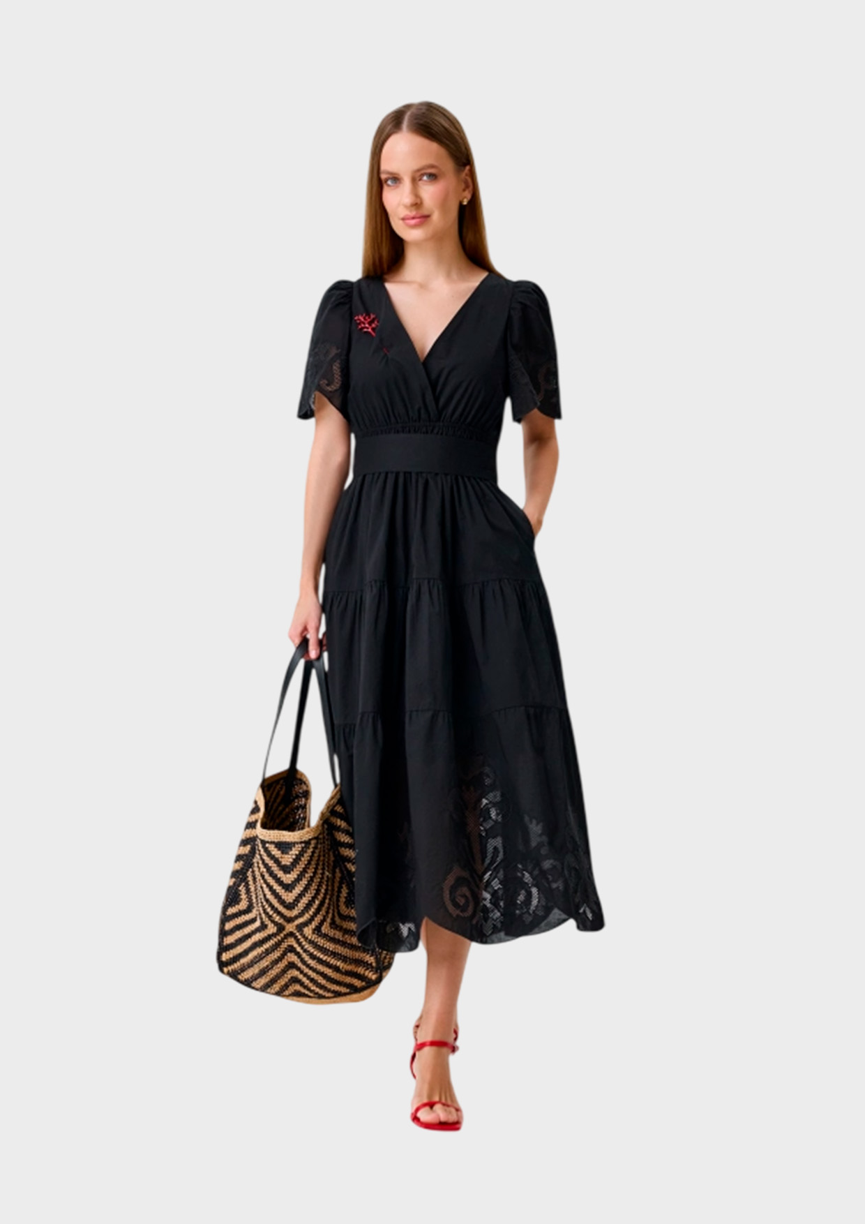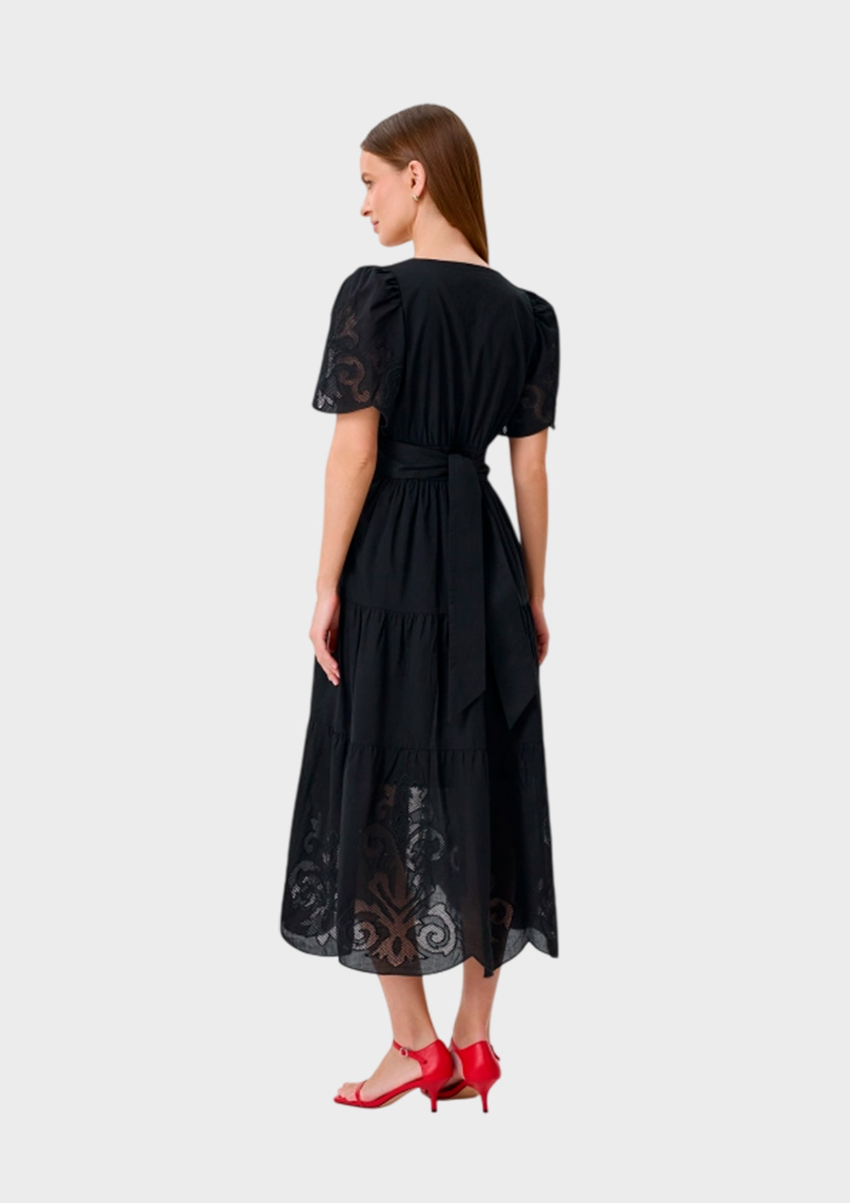 Пышное ярусное платье-миди из 100% хлопка с ажурной вышивкой по низу рукавов и изделия. Приталенный силуэт дополнен поясом. V-образный вырез на запах. Объемные укороченные рукава.