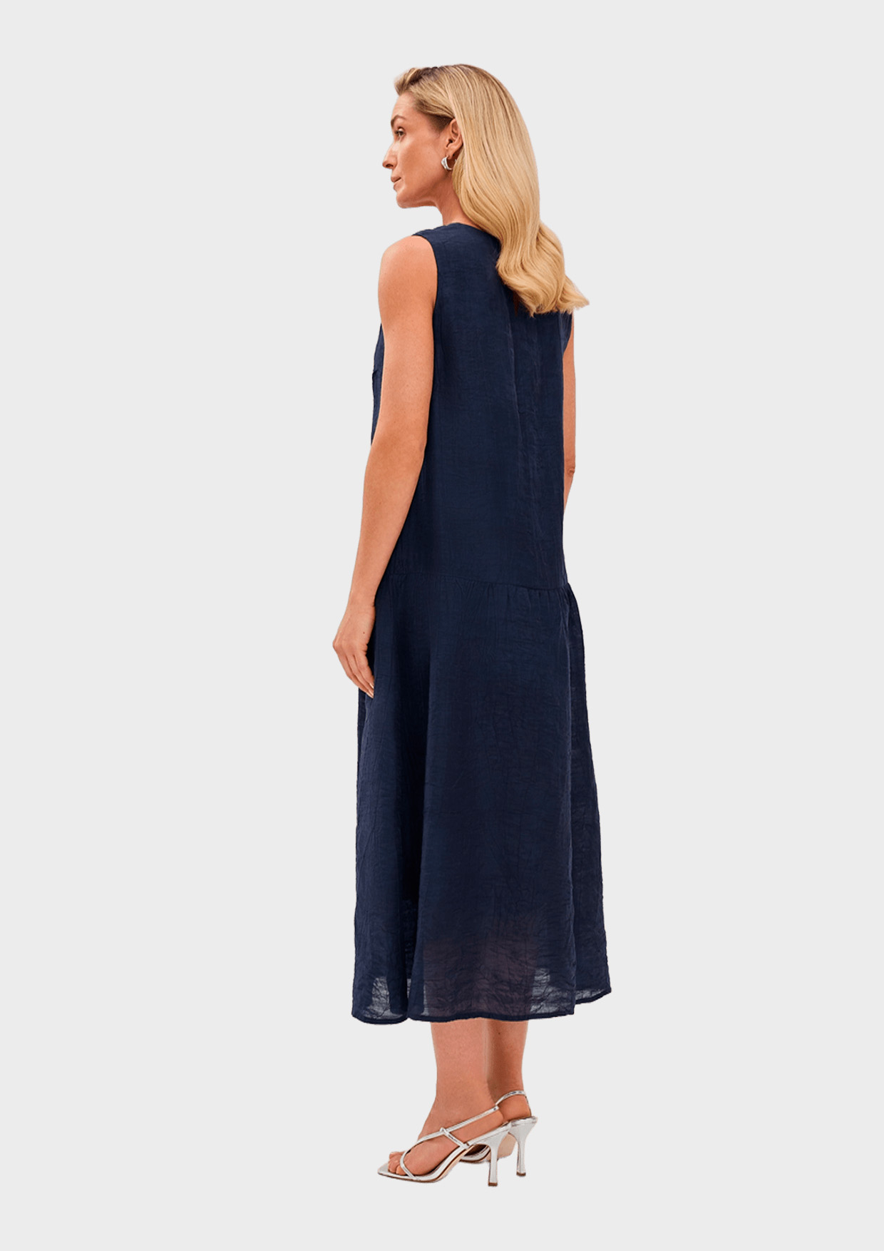 Элегантное платье в глубоком синем цвете из смесового льна от немецкого бренда BULMER — это воплощение летнего комфорта и утонченного вкуса. Свободный силуэт модели создает ощущение легкости и свободы движений.