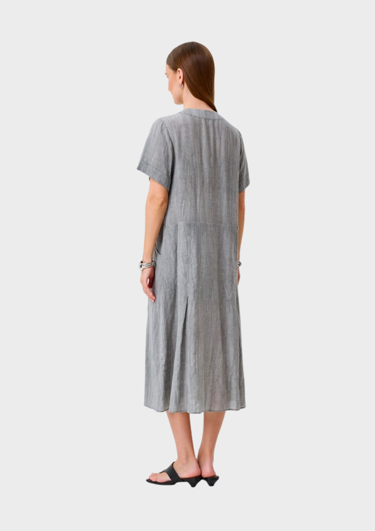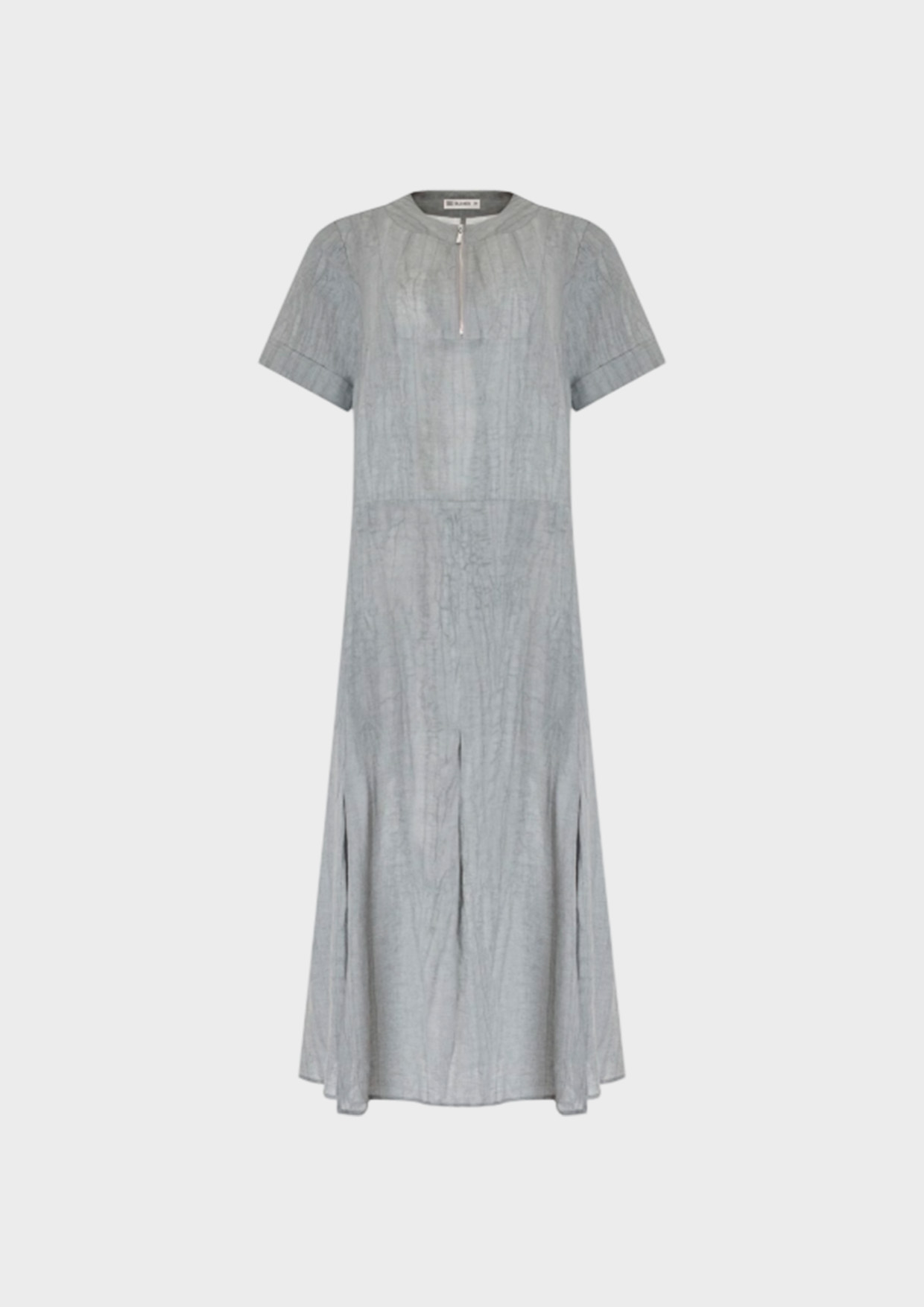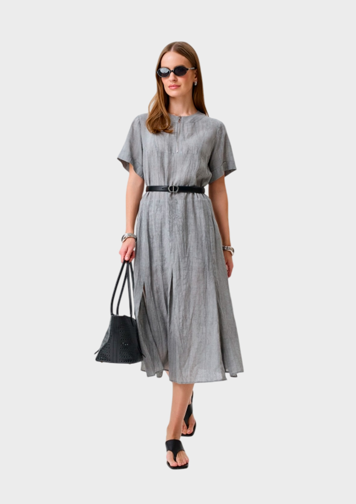 Свободное платье из тенселя и льна. Длина миди. Круглый вырез дополнен молнией. Укороченные широкие втачные рукава. Боковые карманы в швах. Дополнено мягкими складками по низу. Подкладка из 100% хлопка.