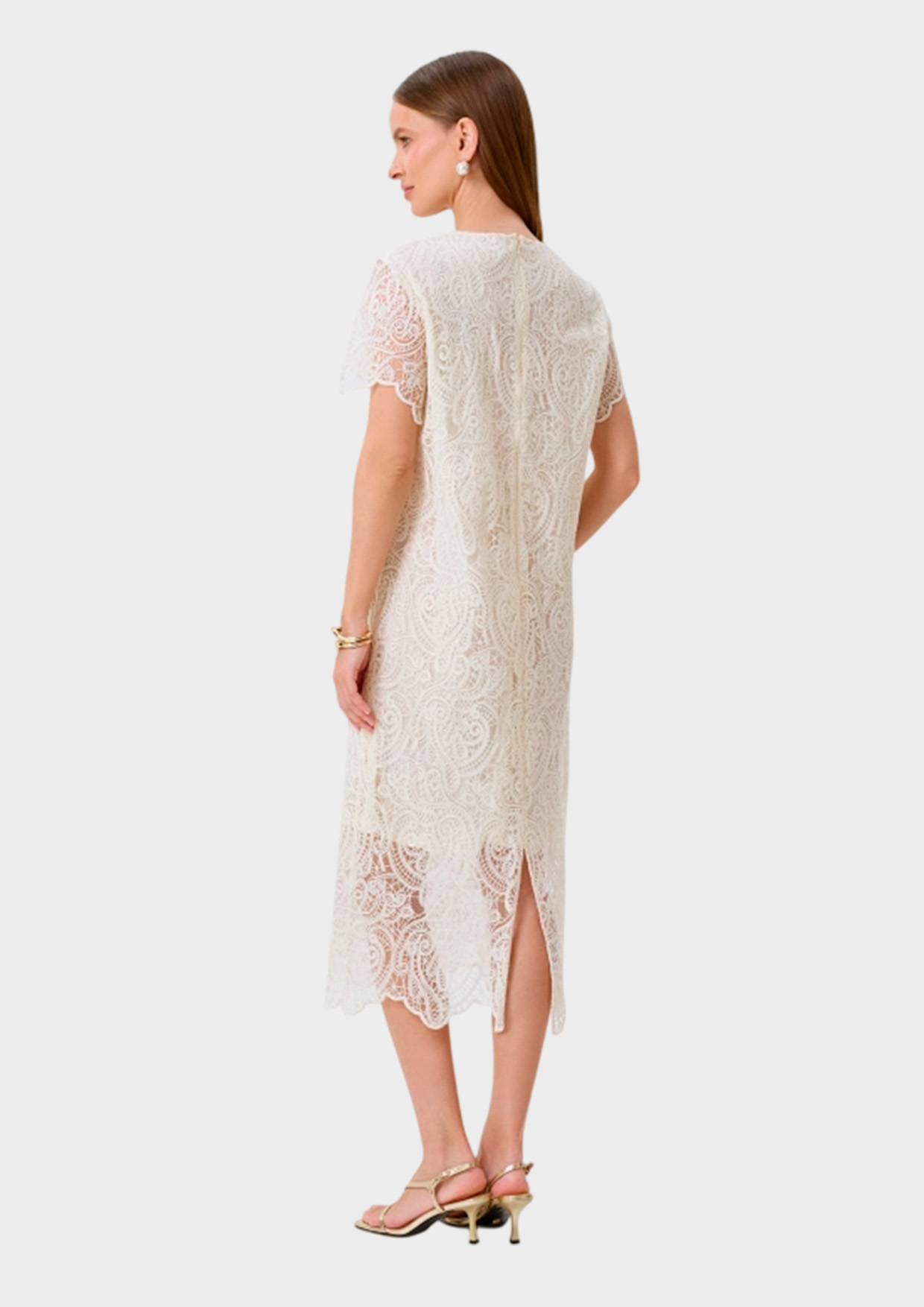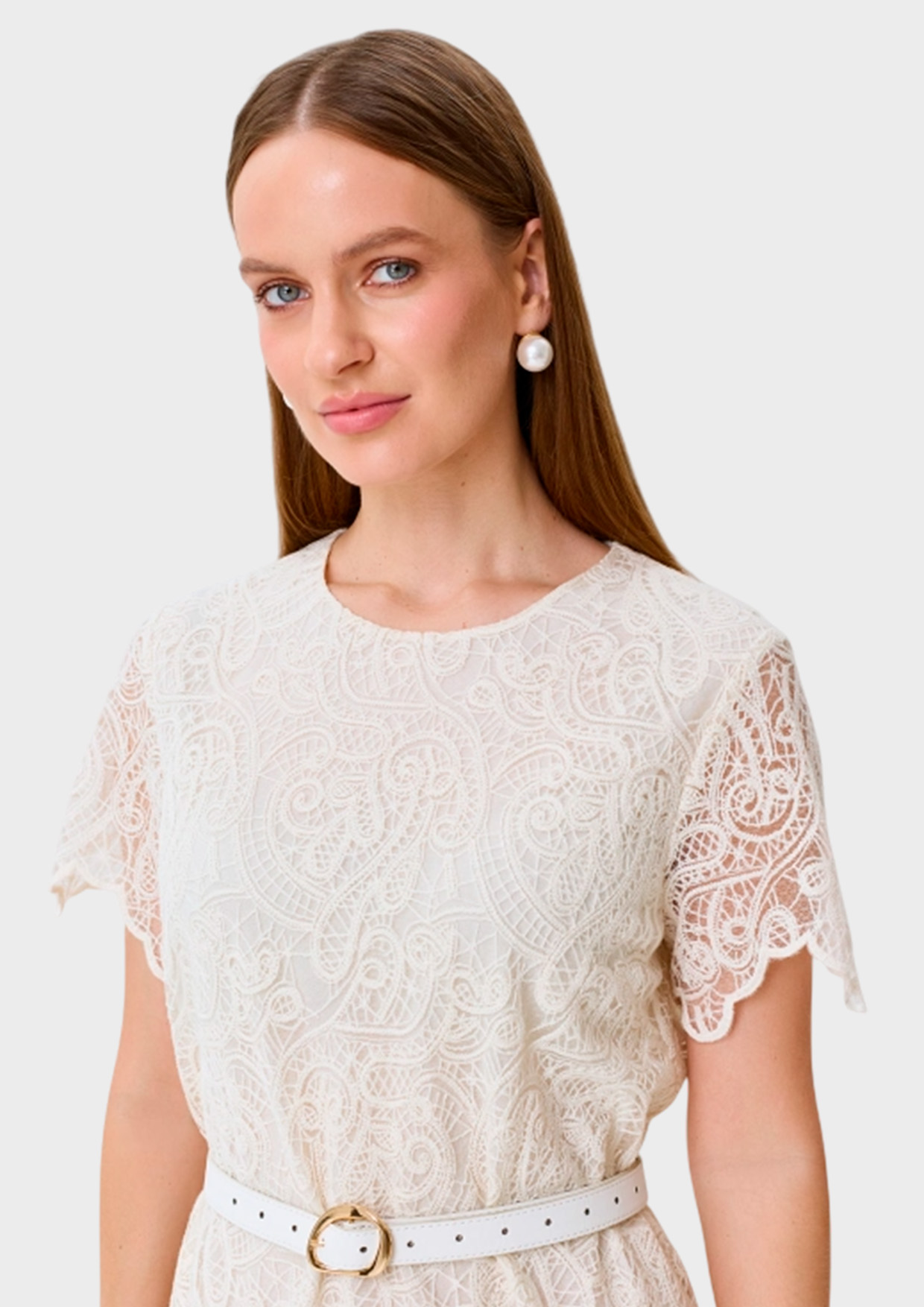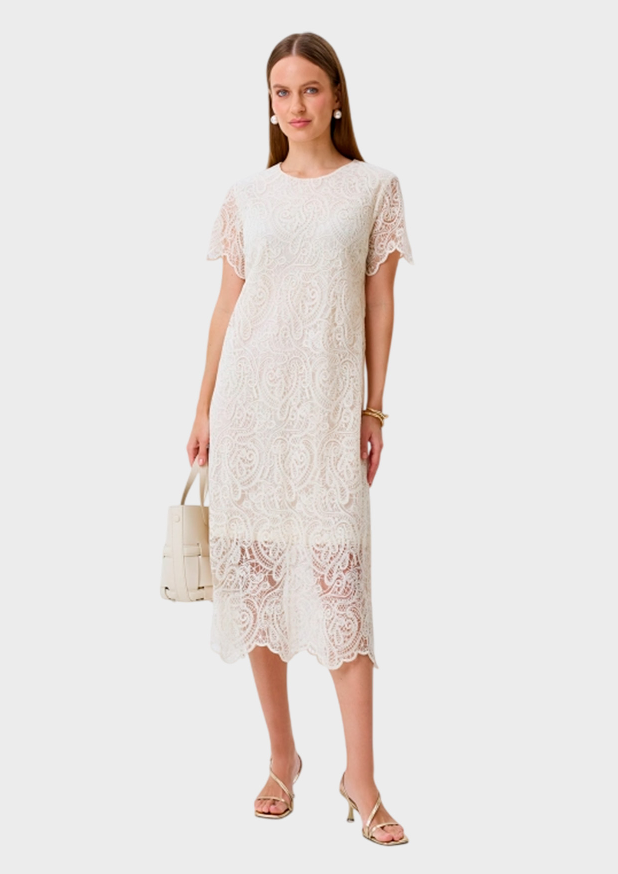 Ажурное хлопковое платье-миди. Прямой силуэт можно приталить поясом. Круглый вырез. Застежка на потайную молнию. Короткие ажурные полупрозрачные рукава. Дополнено подкладкой.