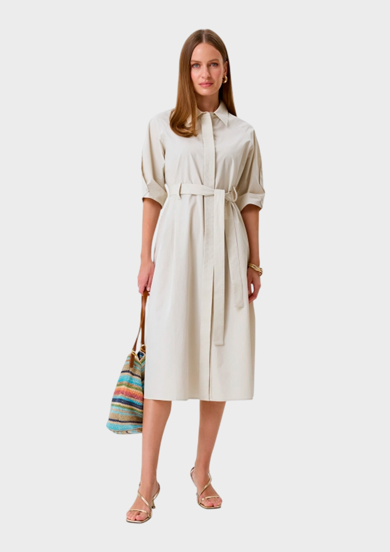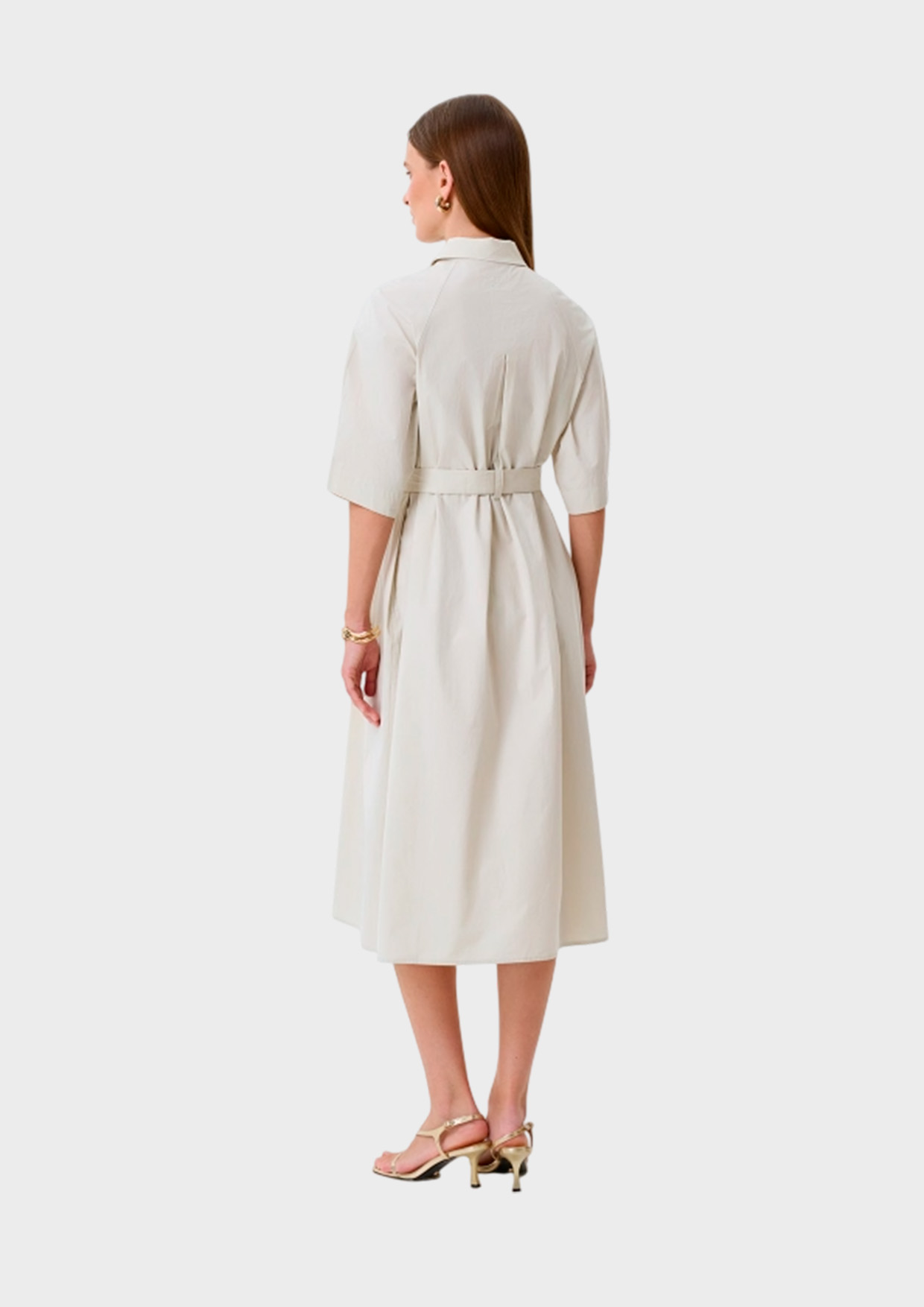Платье-рубашка из 100% хлопка. Свободный силуэт можно приталить поясом. Отложной воротник. Застежка на пуговицы. Укороченные рукава реглан заужены манжетами. Боковые карманы в швах.