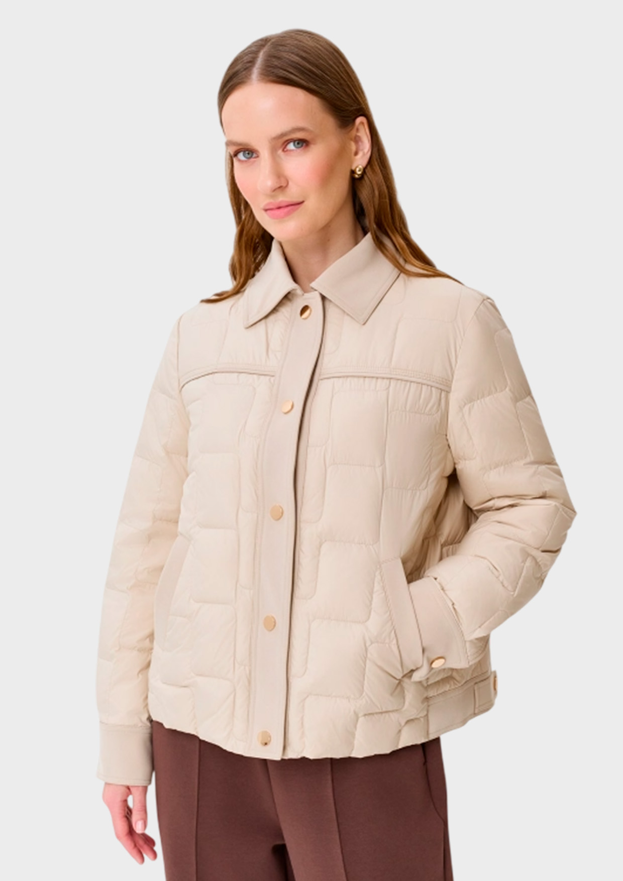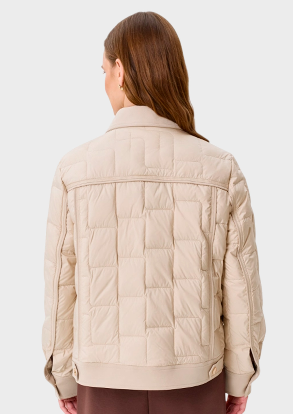 Куртка с квадратной графичной стежкой на натуральном утеплителе. Прямой силуэт. Застежка на кнопки. Отложной воротник. Боковые карманы с листочками. Воротник, планка, манжеты рукавов и отделка карманов- из гладкого плотного текстиля. Кнопки на манжетах и хлястиках по низу изделия.