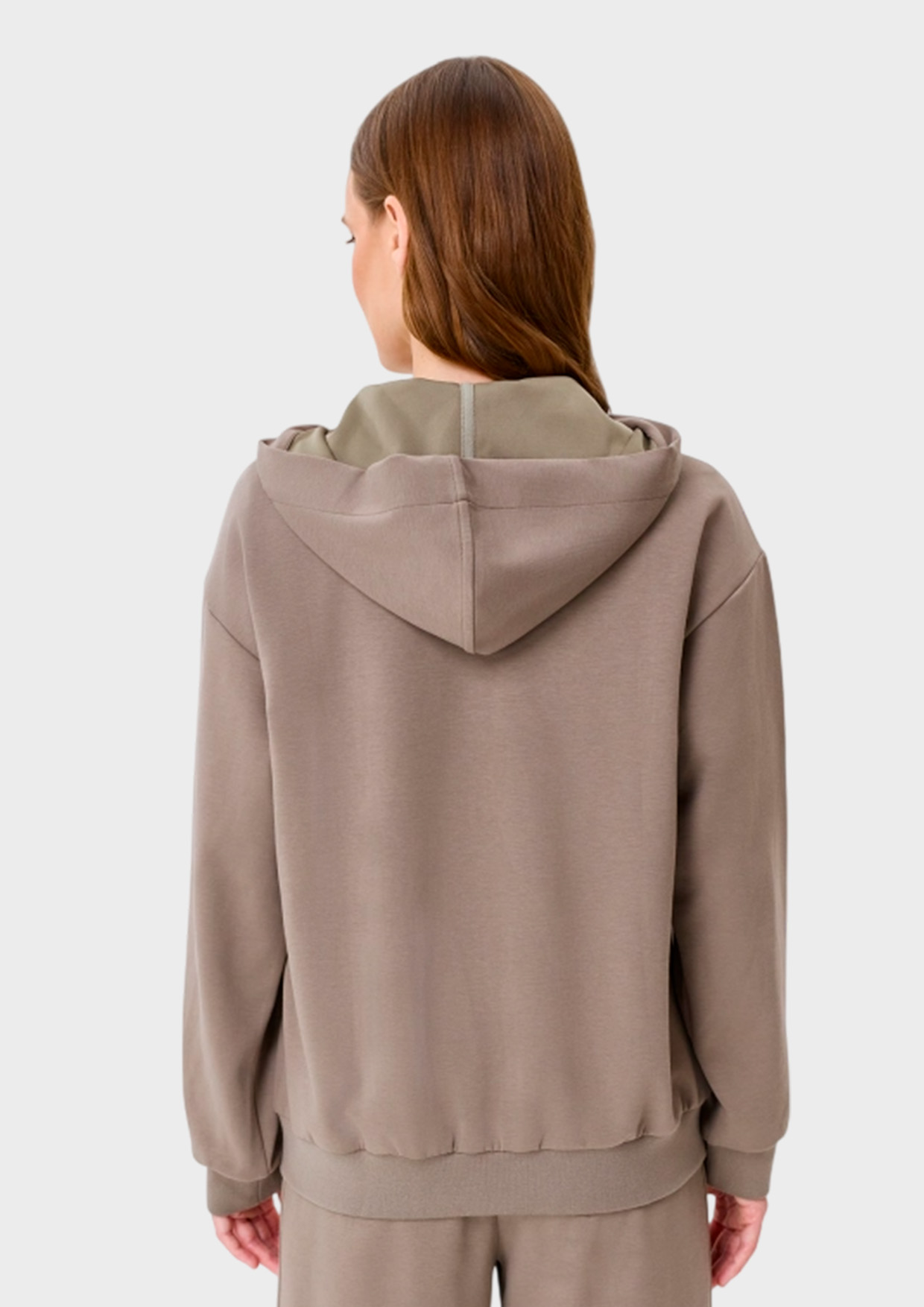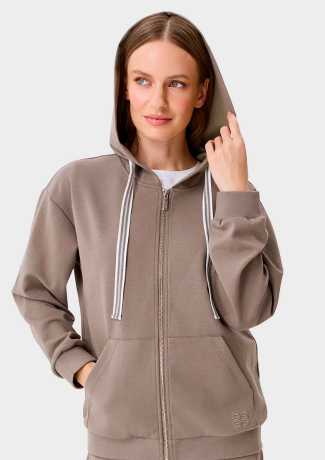 Худи свободного силуэта из смесового хлопка. Воротник дополнен капюшоном с контрастной тесьмой. Застежка на молнию. Спущенная линия плеч и длинные рукава с манжетами по низу. Накладные боковые карманы. Риб по низу изделия.