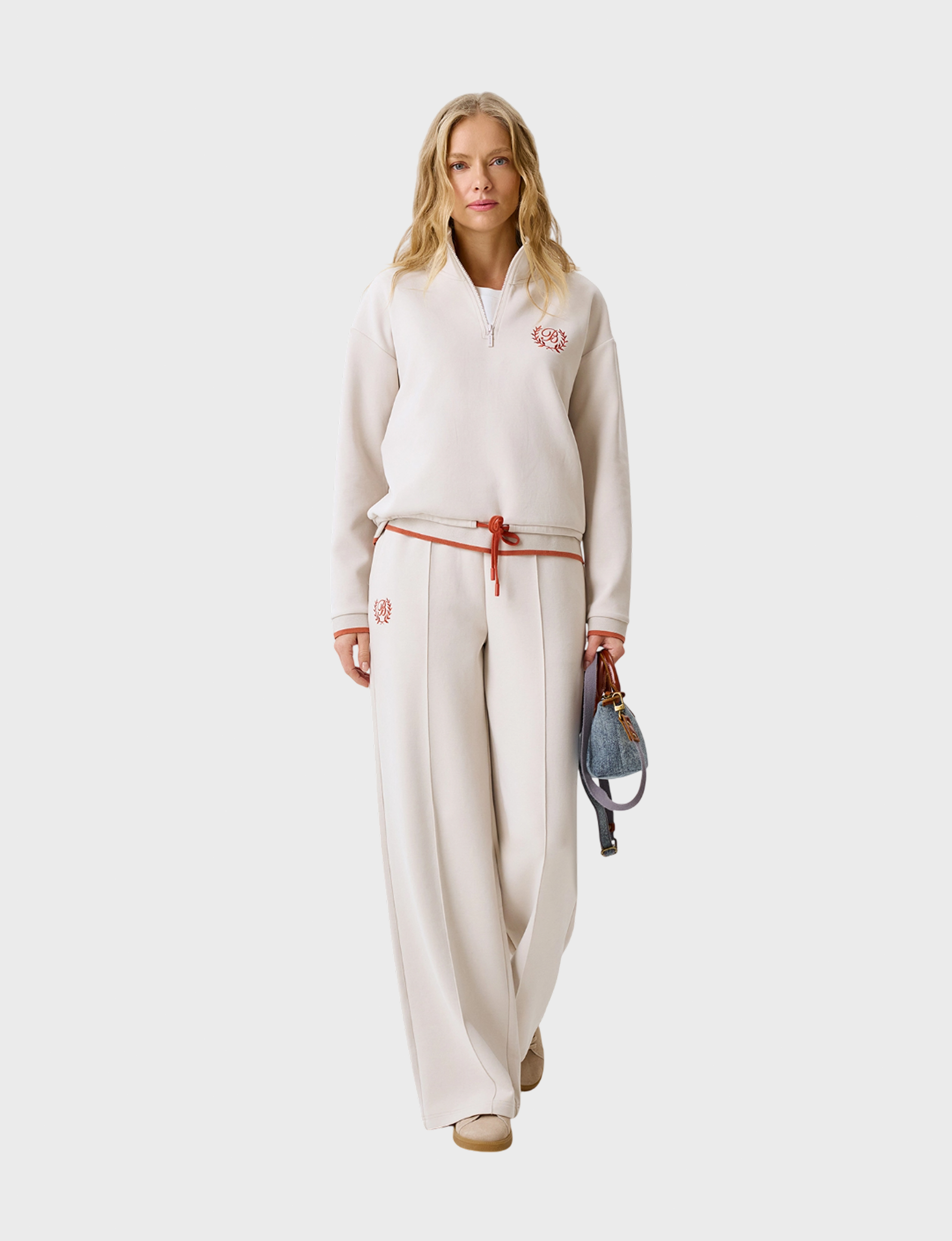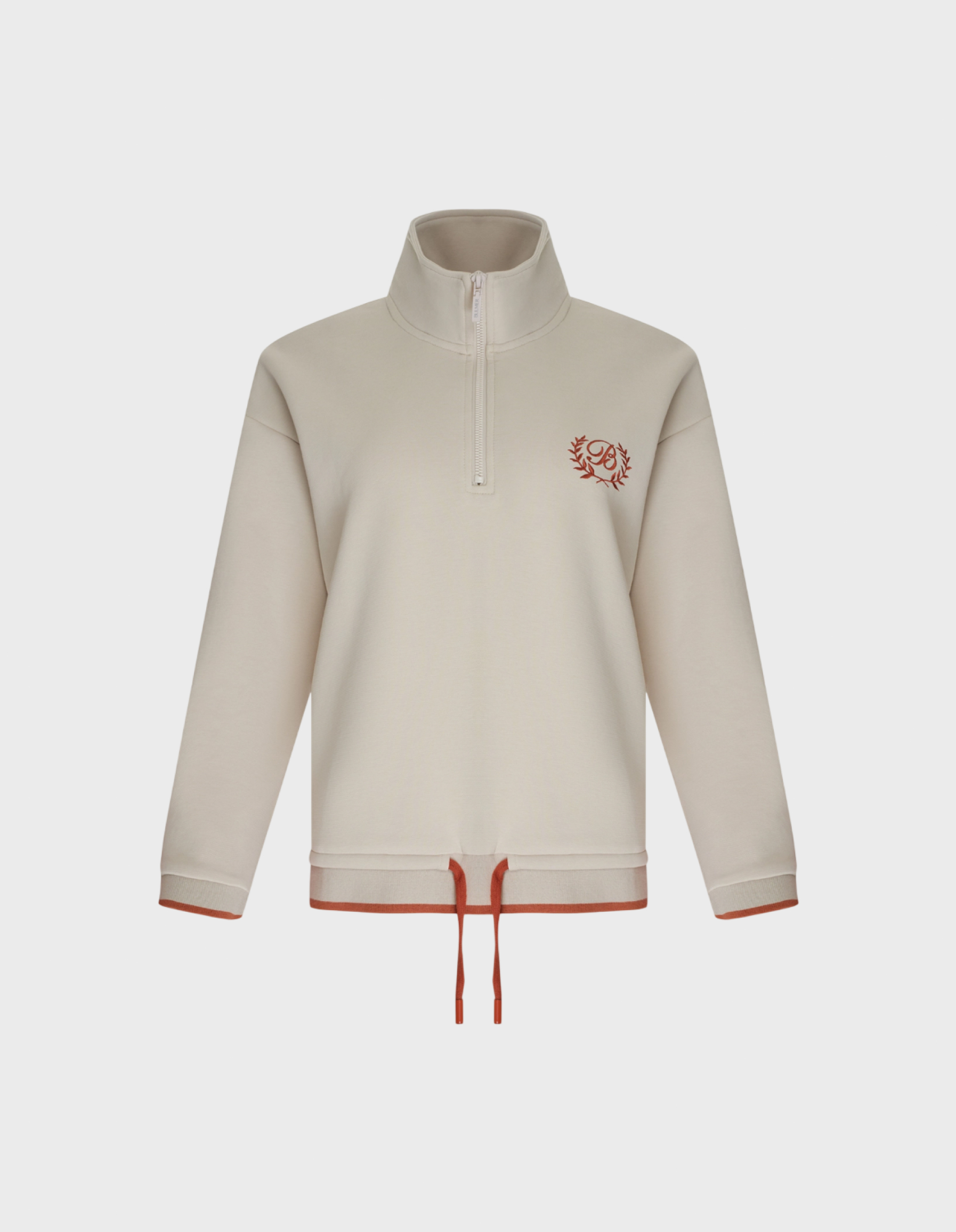Трикотажный свитшот из смесового хлопка. Свободный силуэт. Высокий воротник стойка дополнен молнией. Спущенная линия плеч и длинные рукава с манжетами по низу. Риб с контрастной полосой по низу рукавов и изделия. Дополнен контрастной вышивкой. По низу изделия кулиса с ярким шнурком.