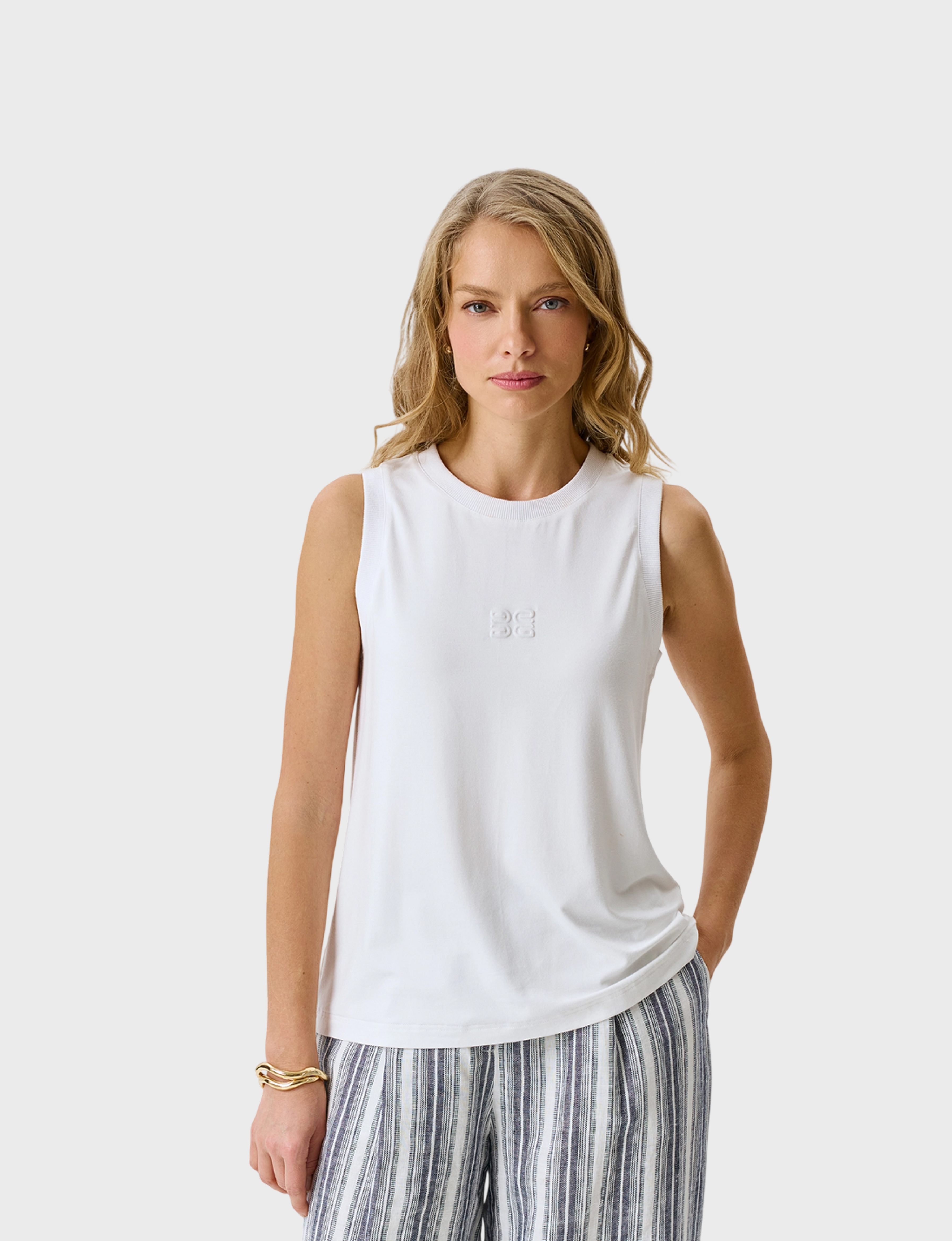 Топ из бамбукового волокна. Полуприталенный силуэт. Круглый вырез. Дополнен рибом по плечам и горловине. В составе спандекс.