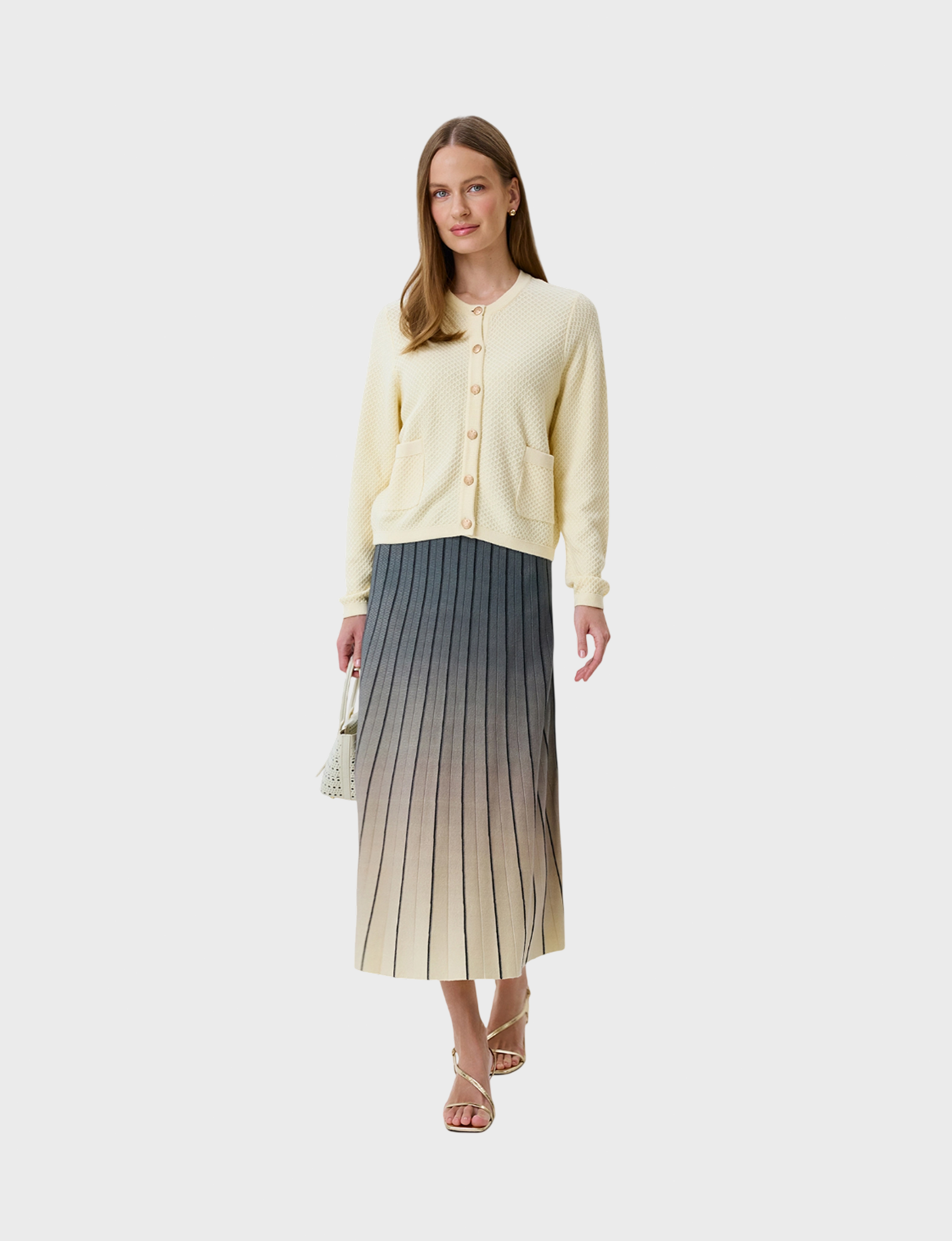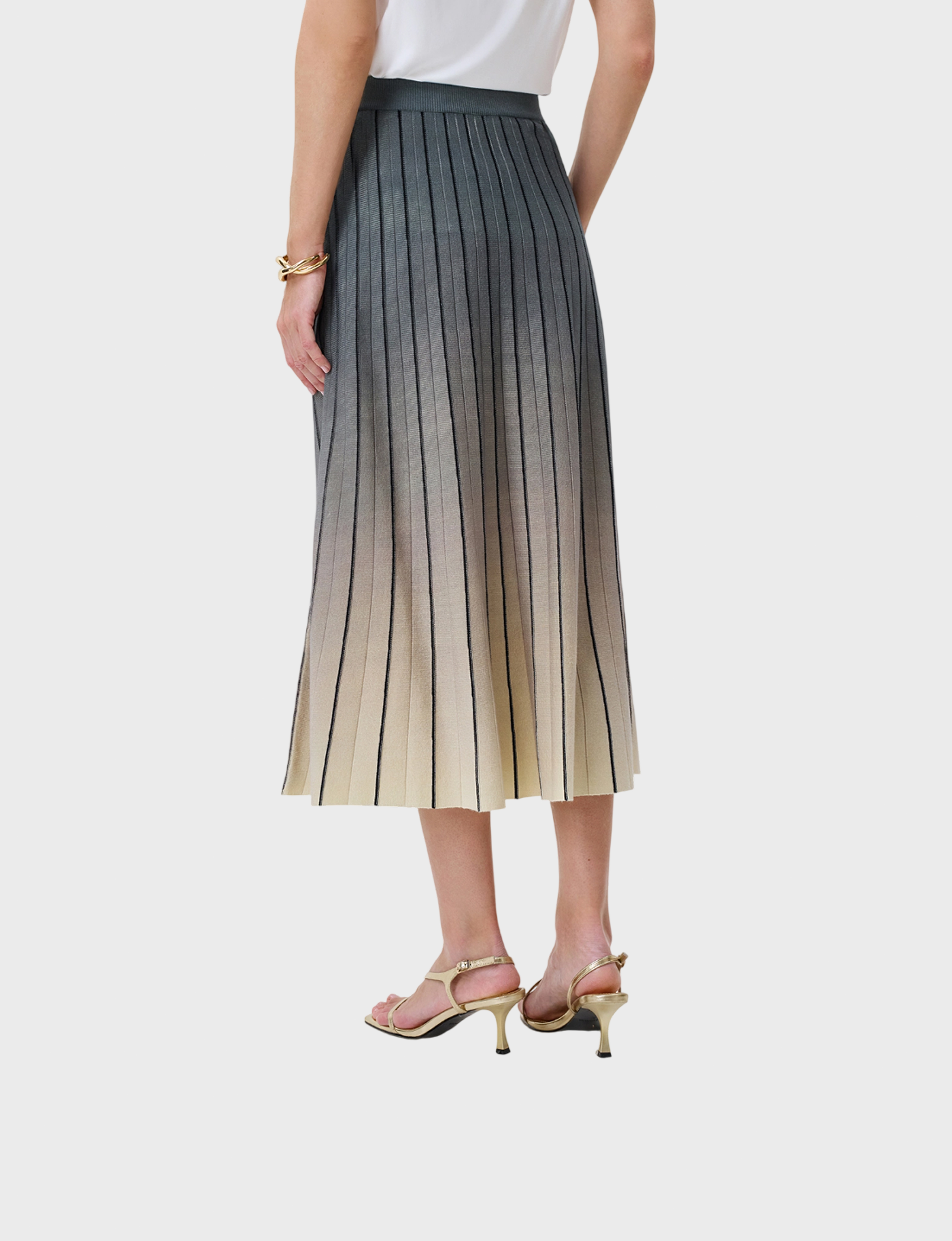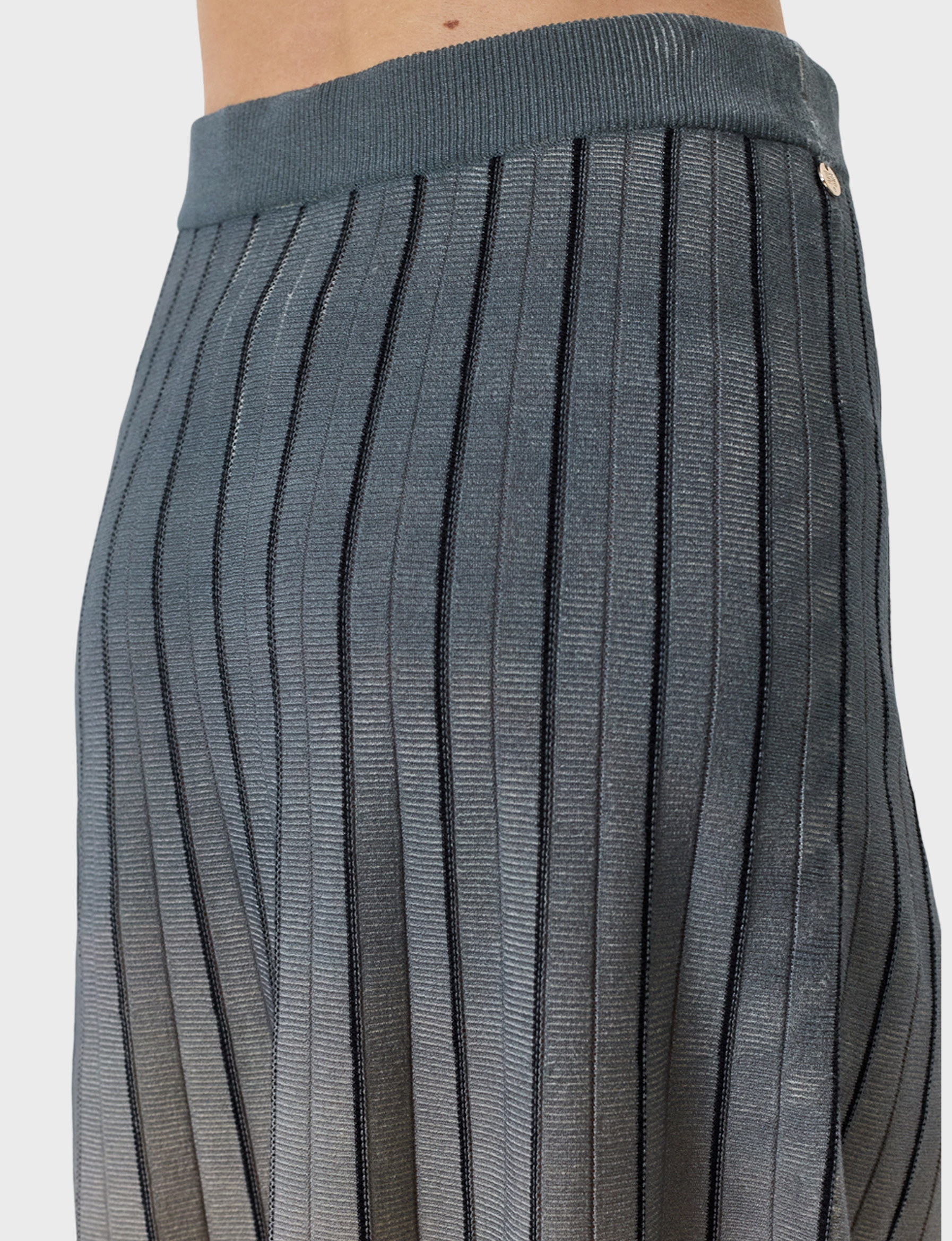 Юбка-плиссе с ярким градиентным принтом. Длина миди. Силуэт трапеция. Резинка по линии талии. Дополнена контрастными гофрированными ребрами. В составе район и нейлон.