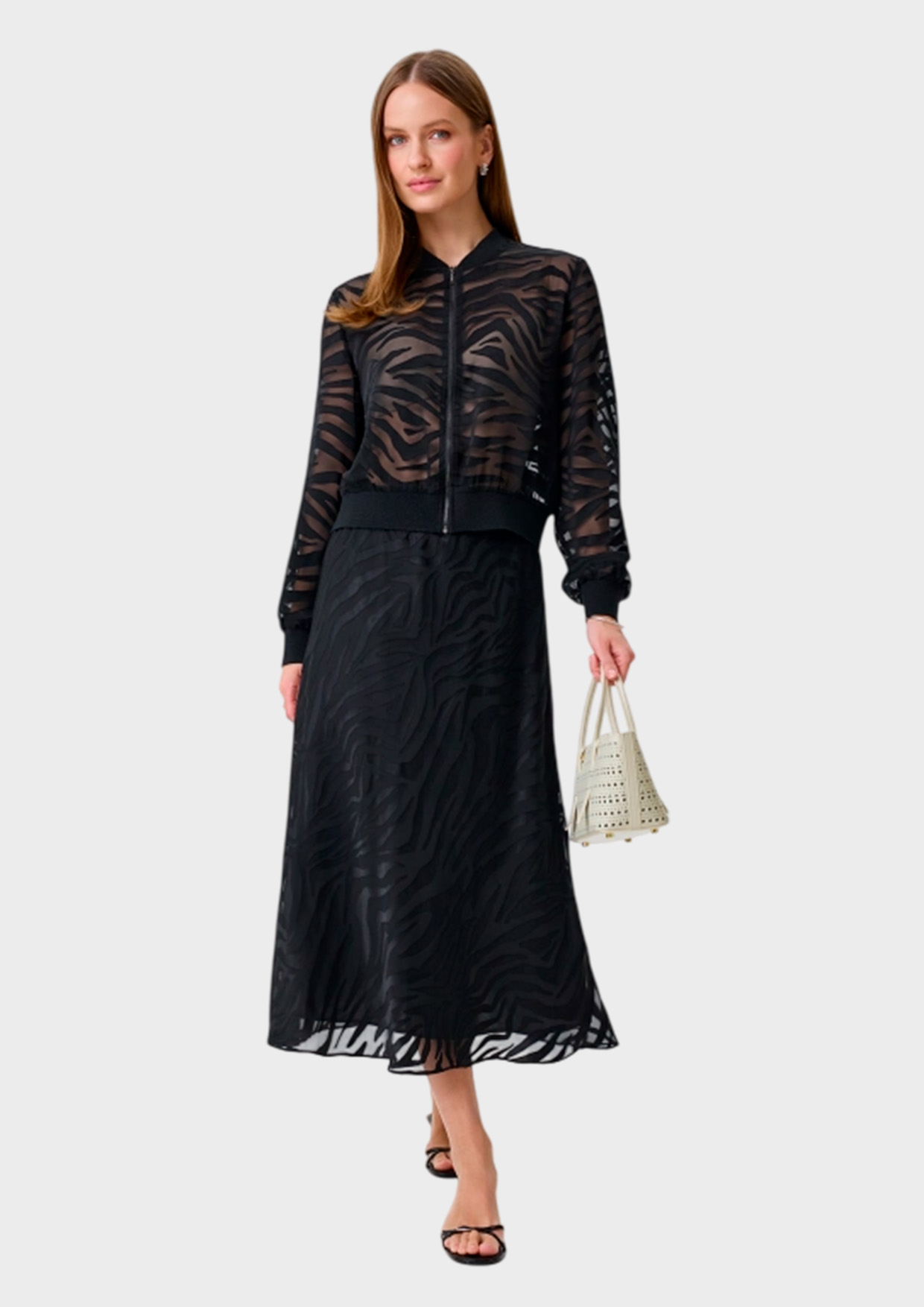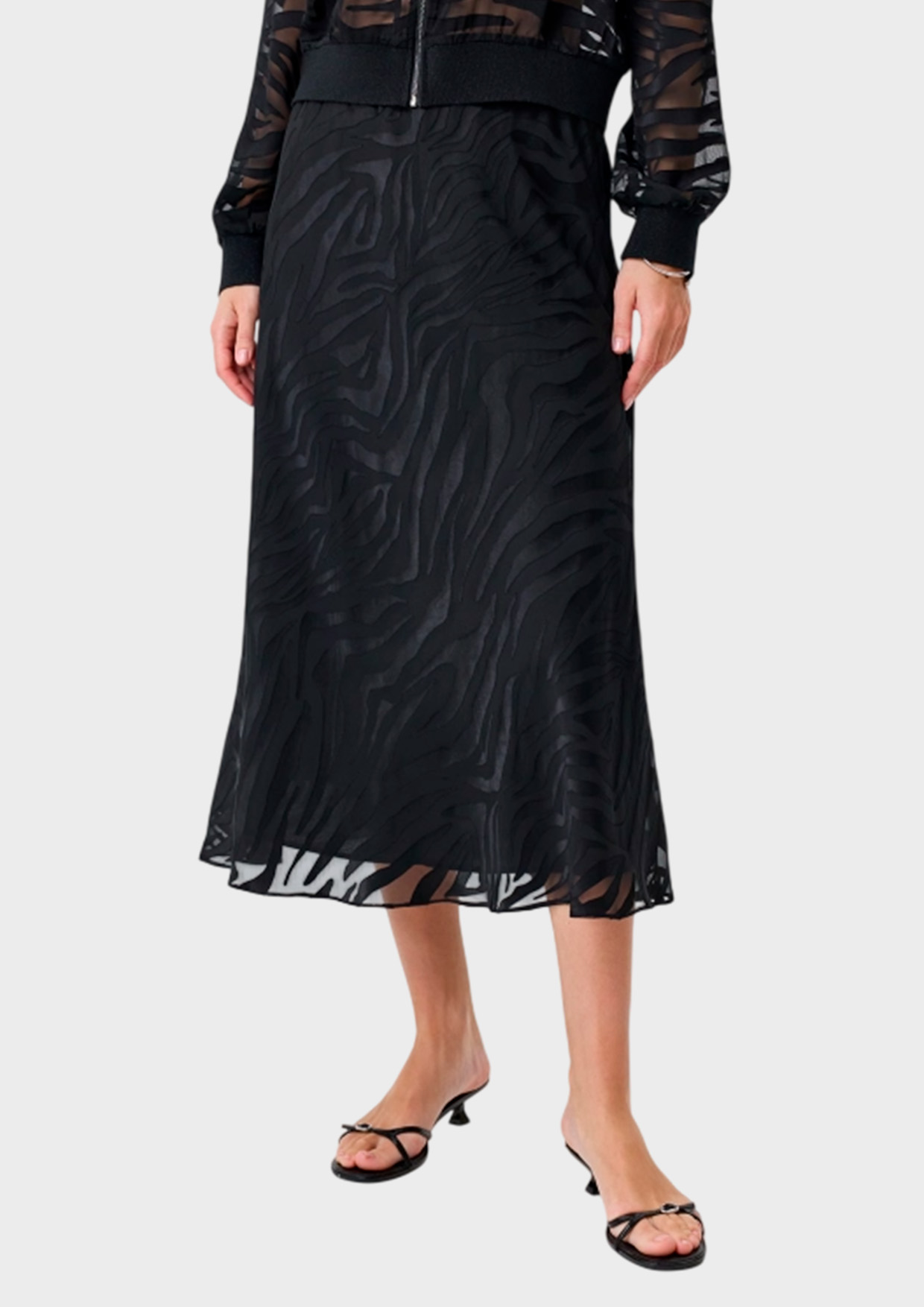 Юбка-миди из смесовой вискозы с монохромным анималистичным принтом. Свободный силуэт. По линии талии резинка с вкраплением люрекса. Дополнена мягкими складками. Подкладка из смесового хлопка.