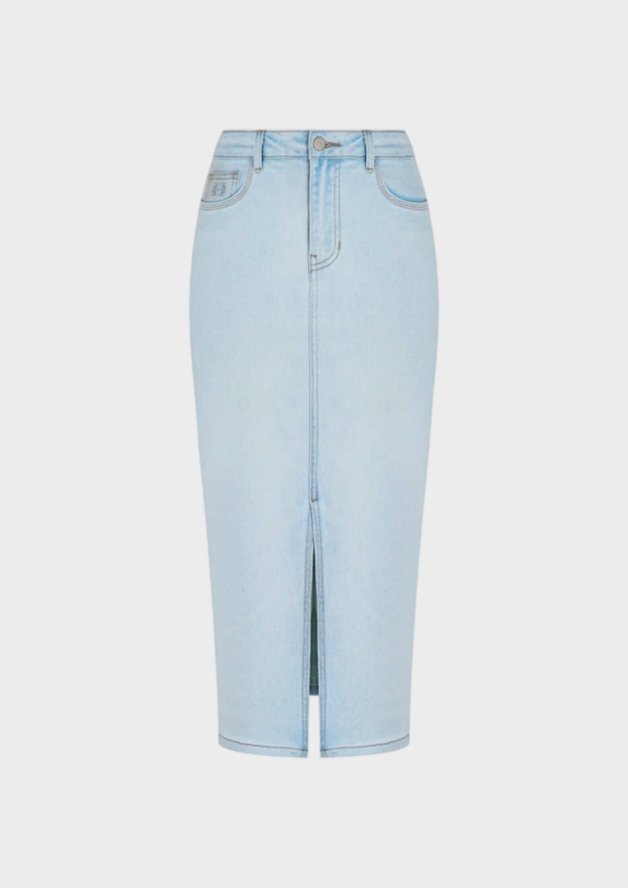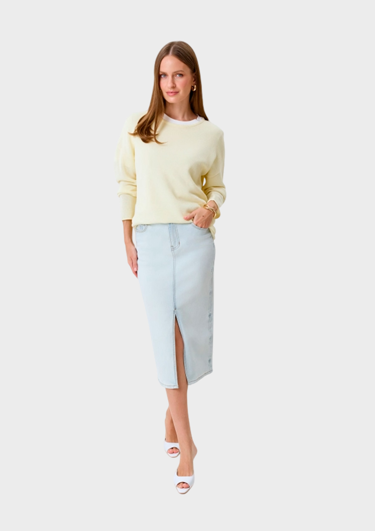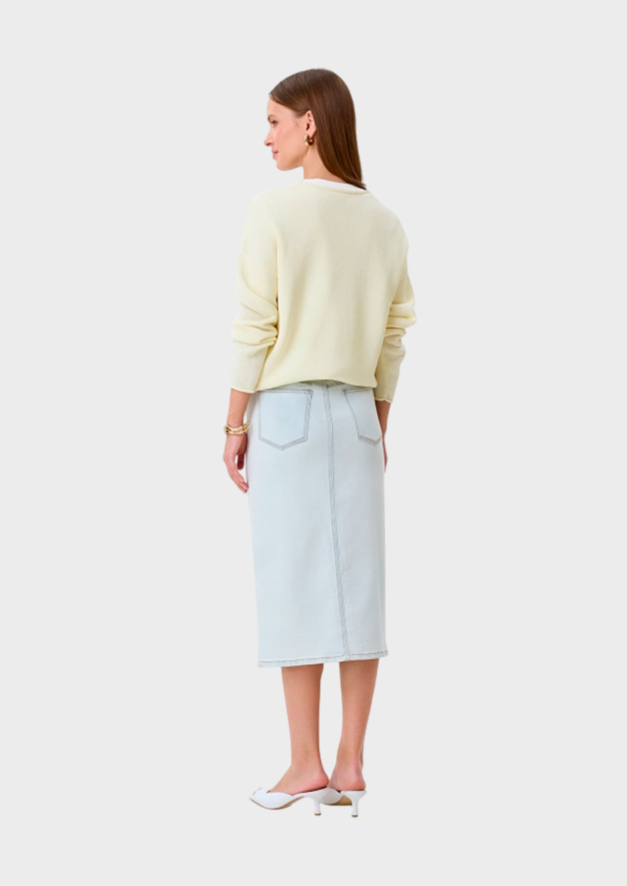 Джинсовая юбка-миди с деликатными лампасами в цвет. Прямой силуэт. Застежка на молнию и металлическую пуговицу. Пять карманов. Дополнена акцентным разрезом спереди. В составе спандекс.
