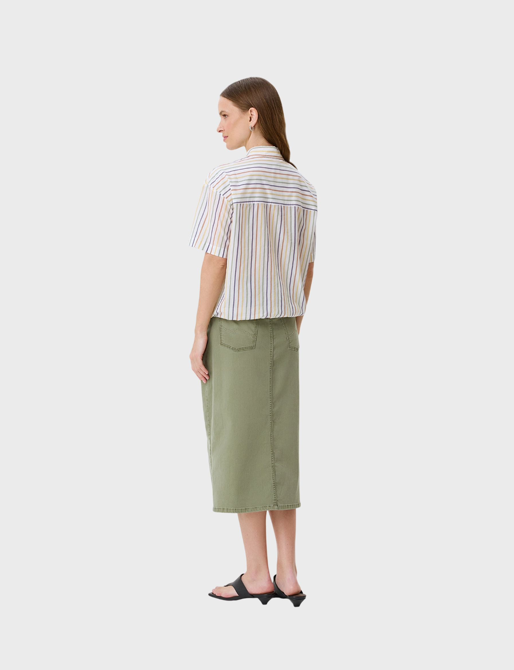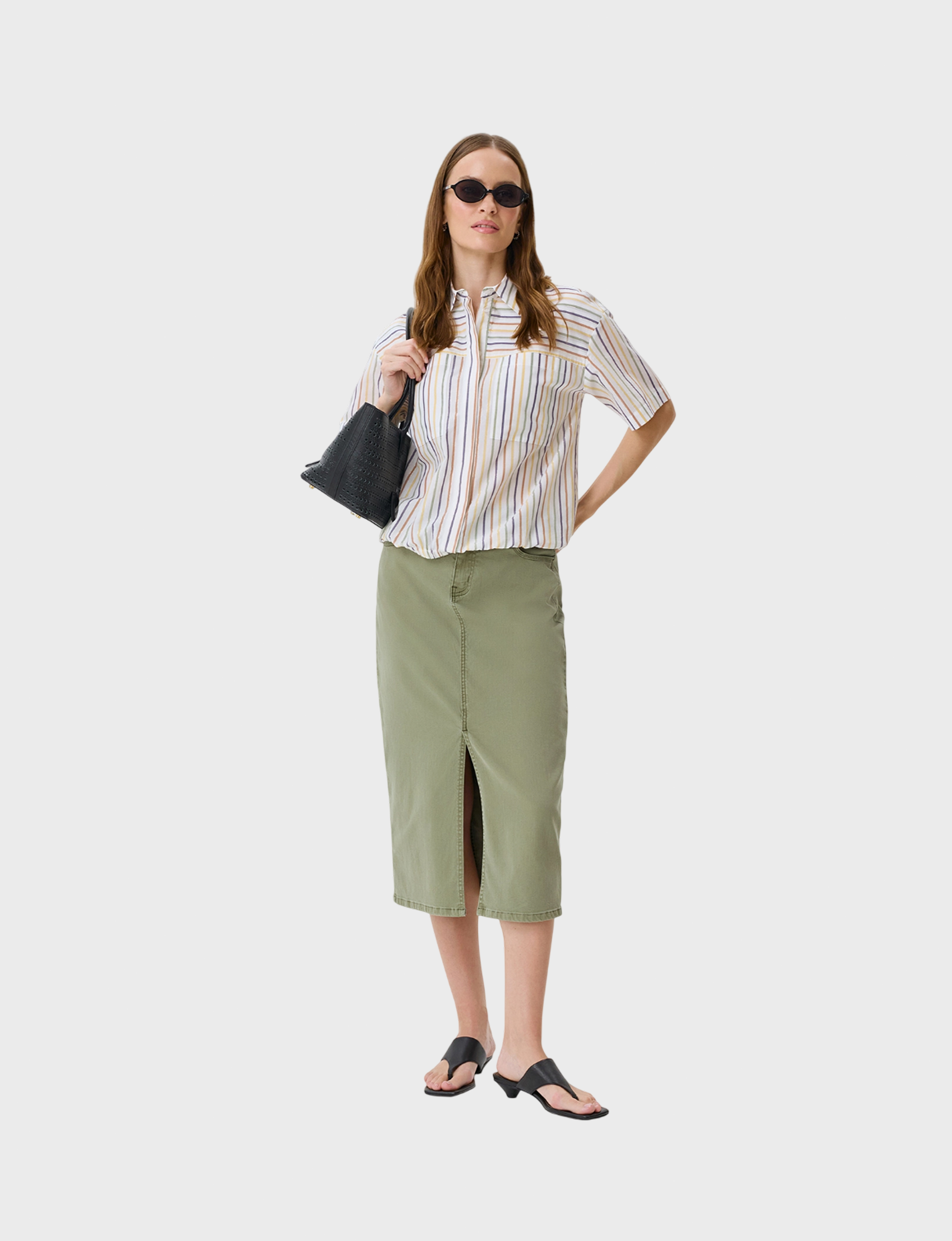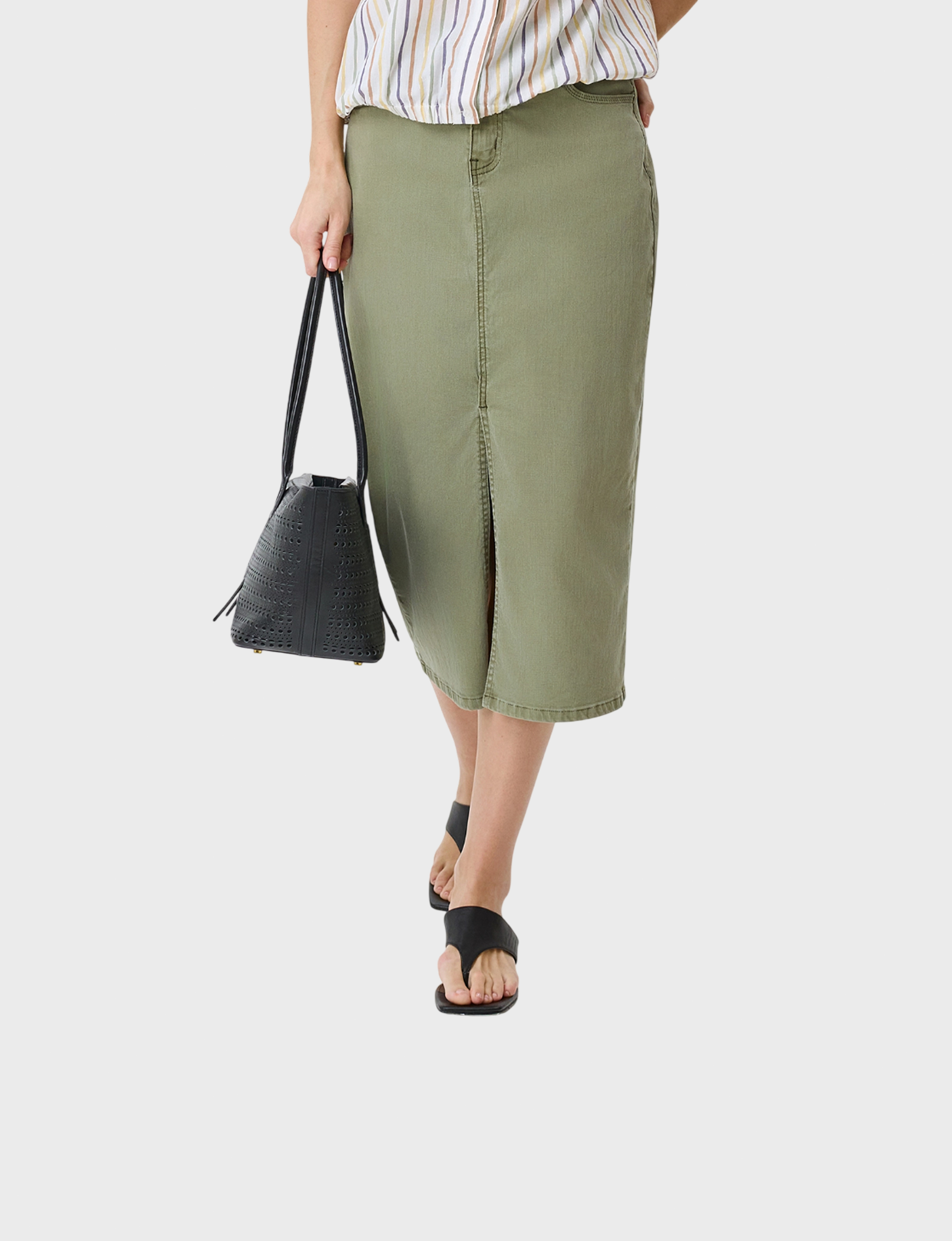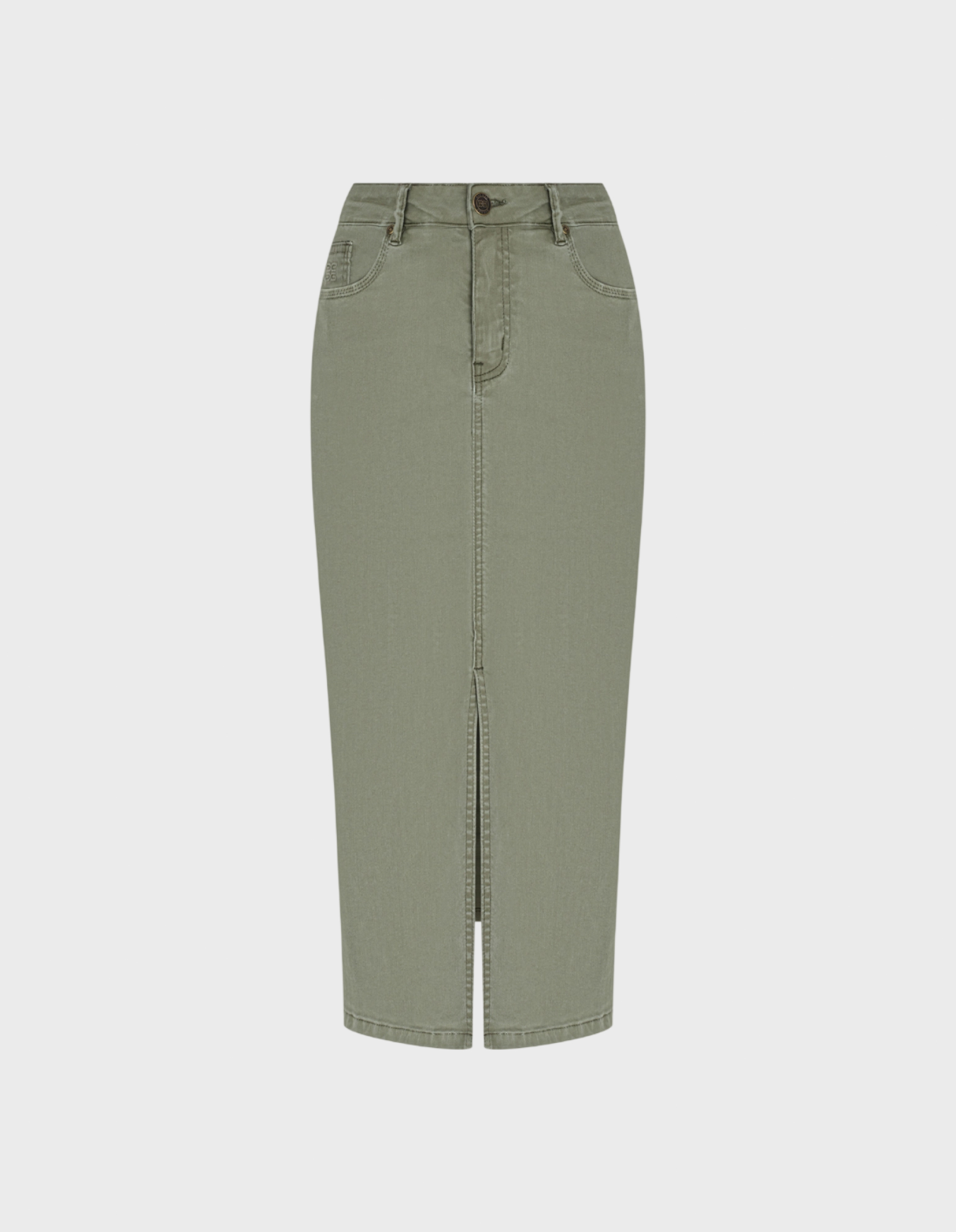 Оливковая джинсовая юбка-миди. Прямой силуэт. Застежка на молнию и металлическую пуговицу. Пять карманов. Дополнена акцентным разрезом спереди и вышивкой в цвет на задних карманах. В составе спандекс