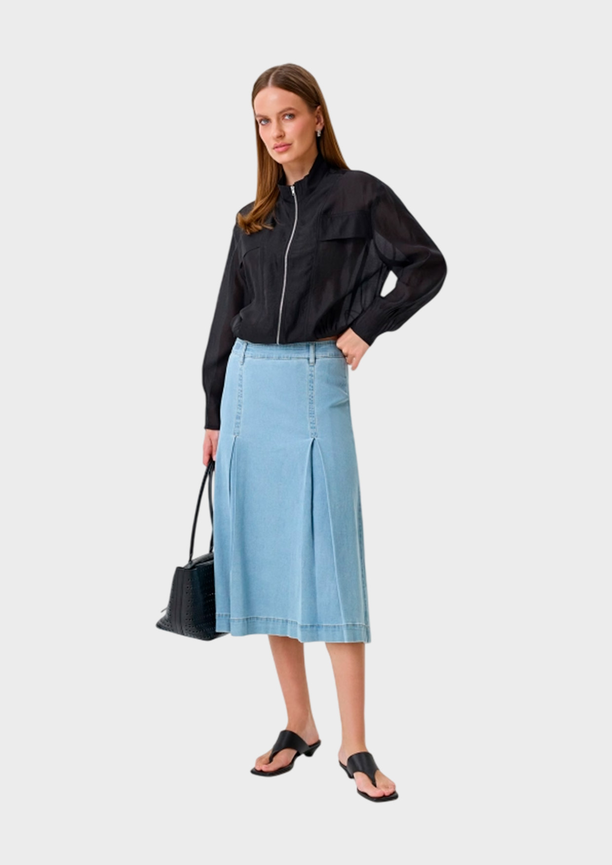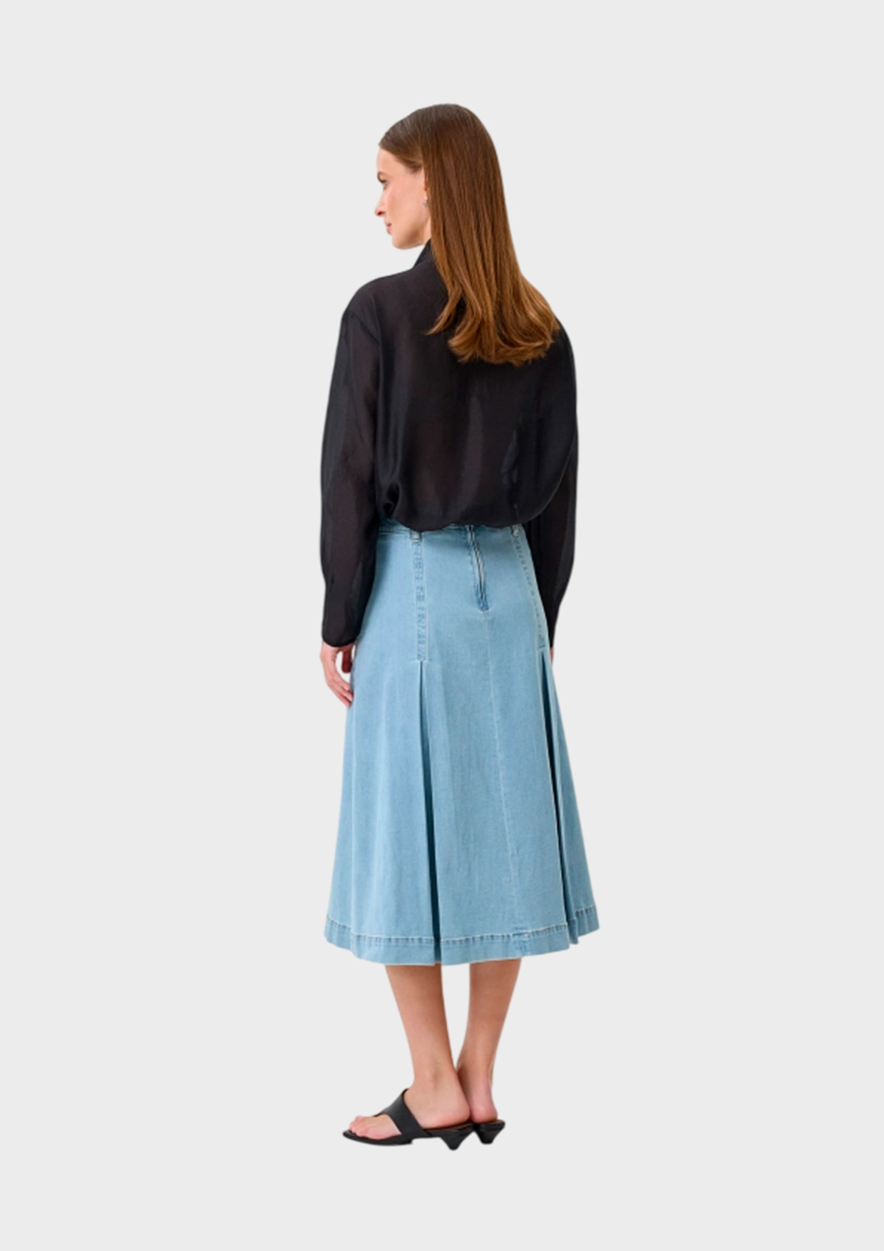 Джинсовая юбка-миди с мягкими встречными складками. А-силуэт. Застежка на молнию. Пояс дополнен шлевками. В составе хлопок и спандекс.