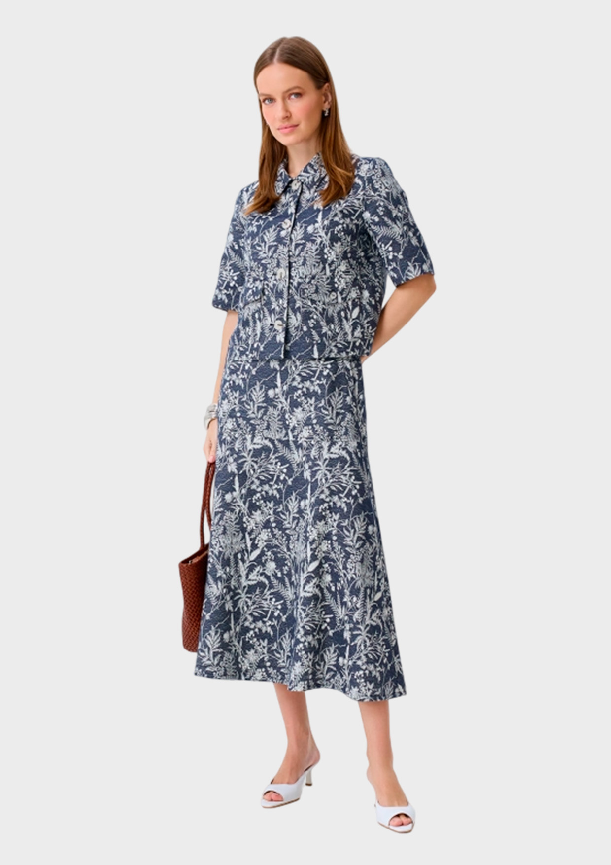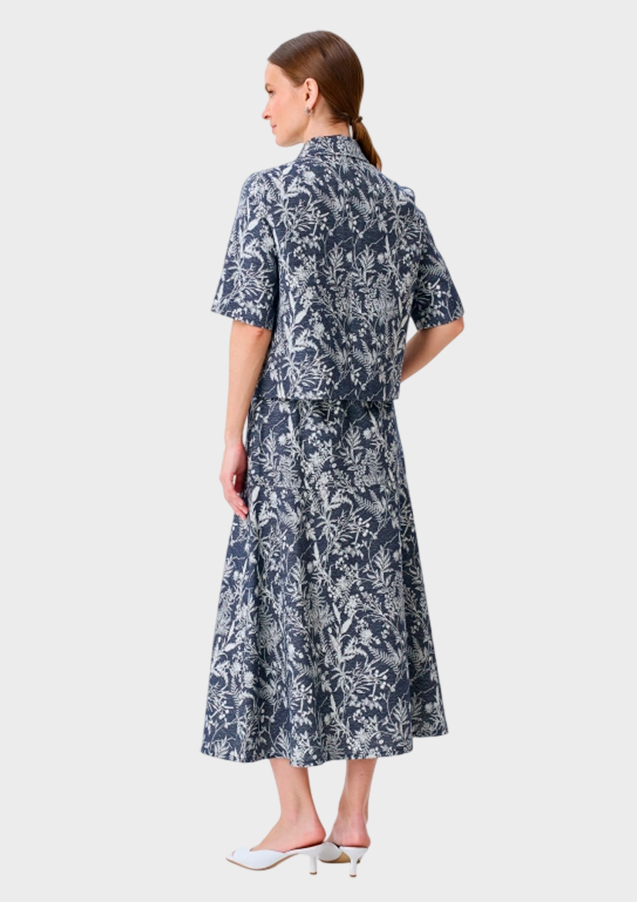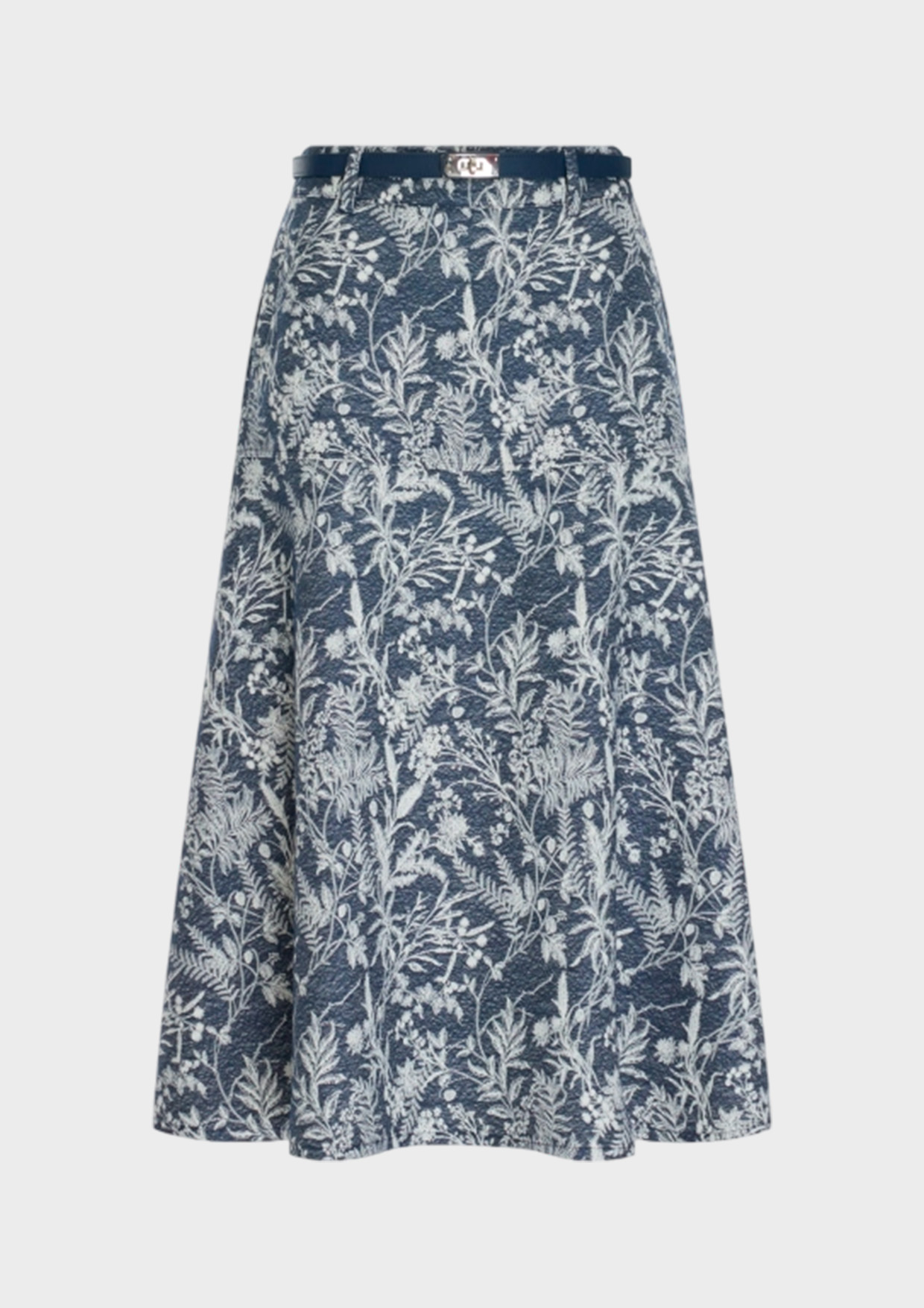 Жаккардовая юбка-миди с флоральным принтом. Силуэт трапеция дополнен мягкими складками. Застежка на молнию. Резинка по линии талии по спинке. В комплекте ремень с пряжкой из эко кожи. Боковые карманы в швах. В составе вискоза и лен.