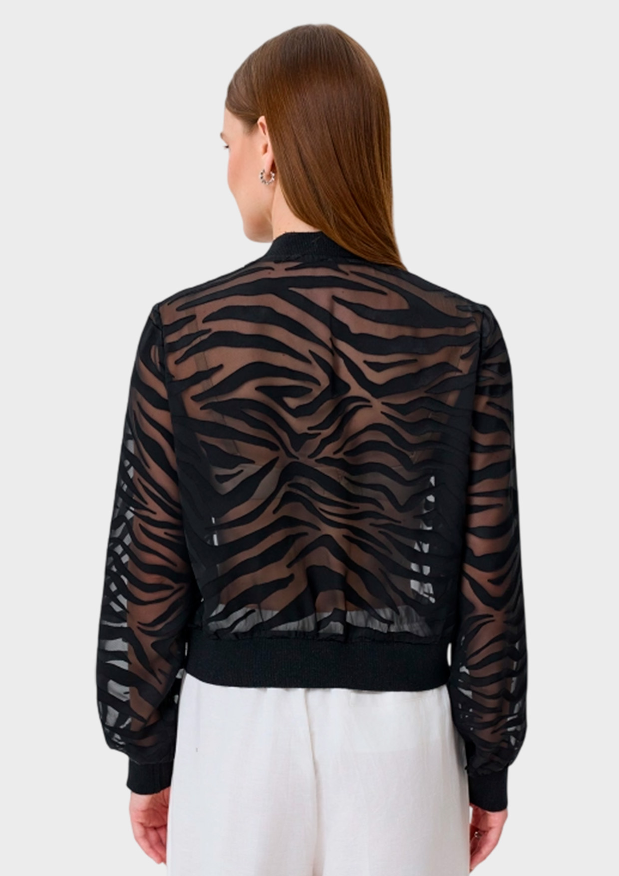 Полупрозрачный бомбер из смесовой вискозы с анималистичным принтом. Прямой силуэт. Воротник небольшая стойка. Застежка на молнию. Длинные втачные рукава. Дополнен рибом по воротнику, низу рукавов и изделия.