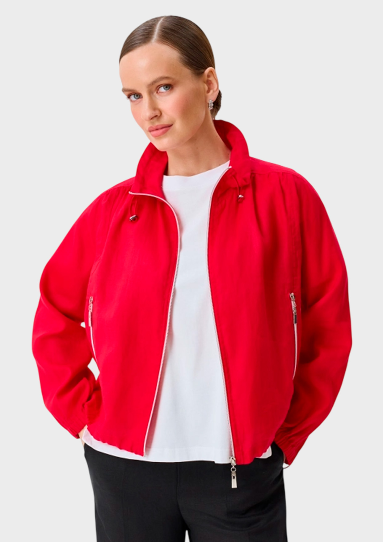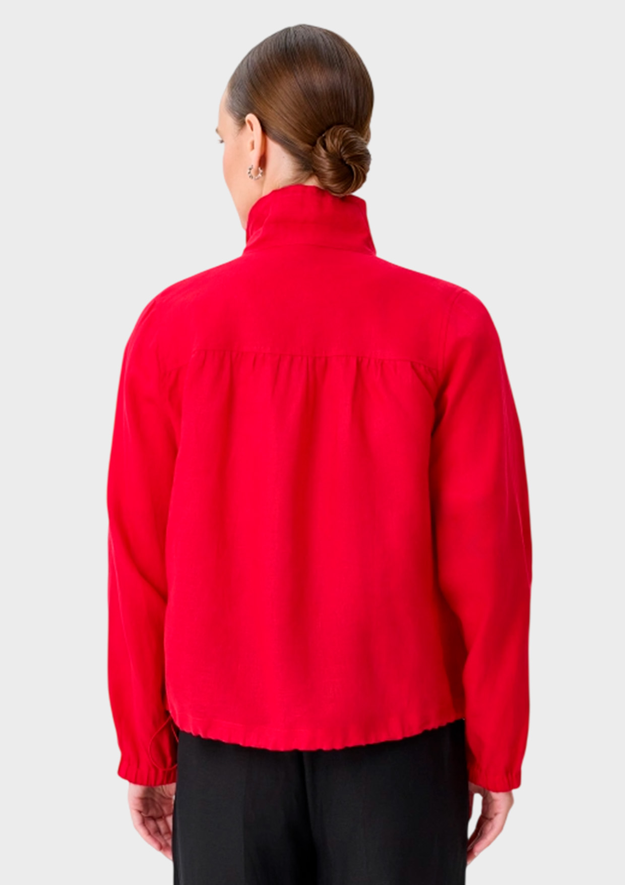 Укороченный жакет из 100% льна. Свободный силуэт. Воротник стойку на утяжниках можно отложить. Застежка на молнию. Спущенная линия плеч и длинные рукава с резинкой по низу. Боковые карманы на молнии. Дополнен кулисой по низу изделия.