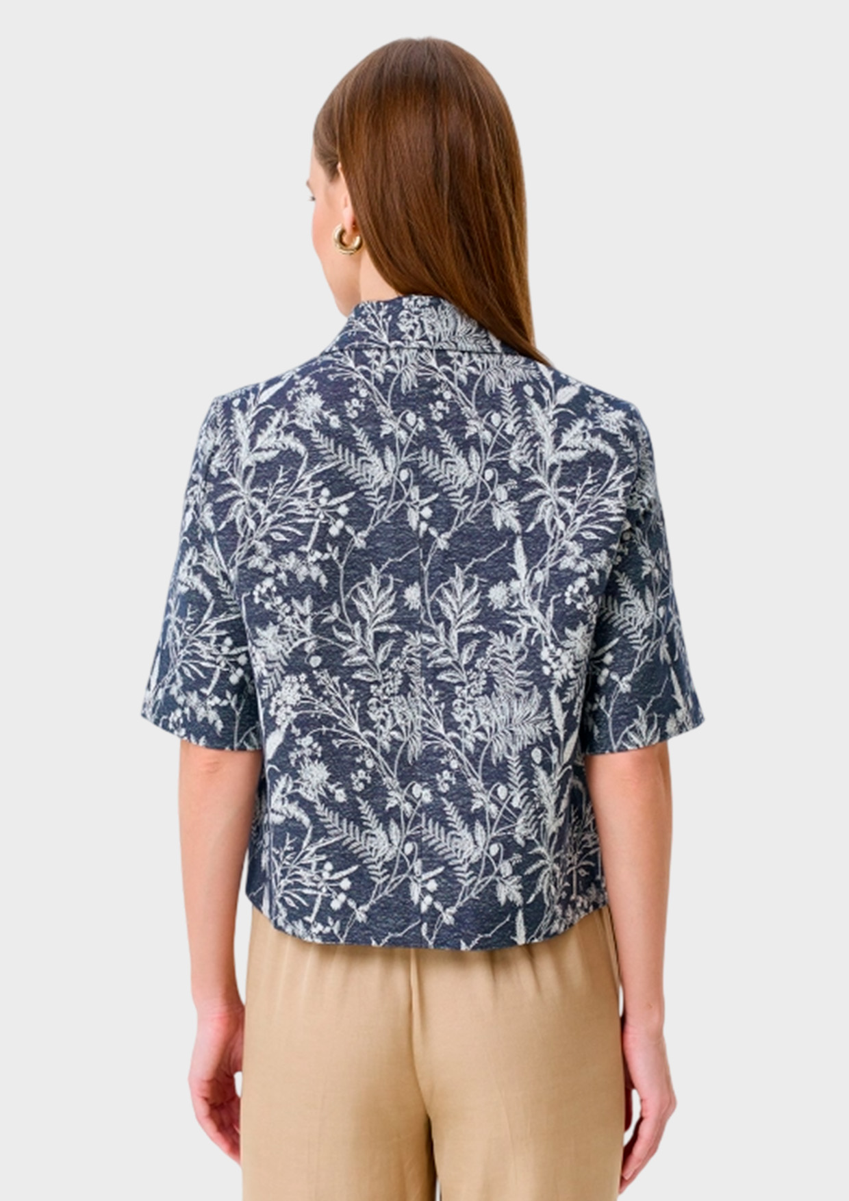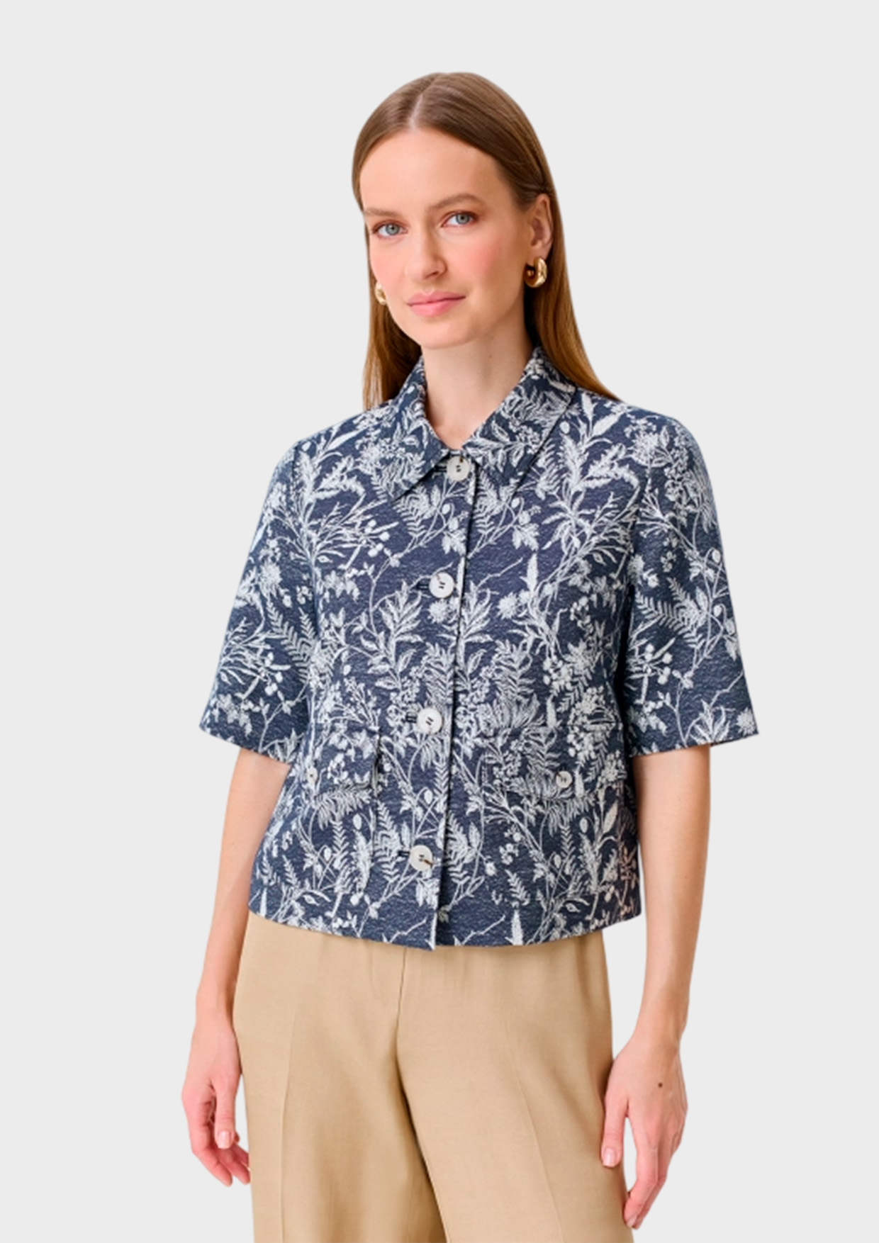 Укороченный жаккардовый жакет с флоральным принтом. Прямой силуэт. Отложной воротник. Застежка на пуговицы. Укороченные втачные рукава. Накладные боковые карманы с клапанами и пуговицами. В составе вискоза и лен. Подкладка из смесовой вискозы.