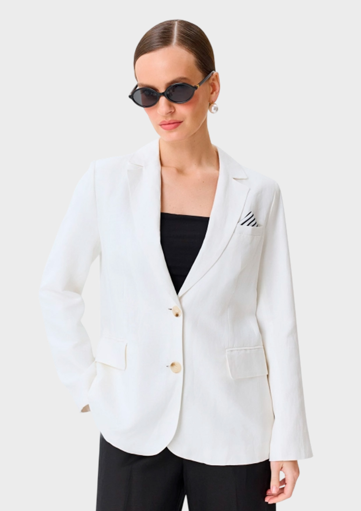 Однобортный жакет из смесового льна и вискозы. Прямой силуэт. Классический английский воротник. Застежка на пуговицы. Боковые карманы с клапанами. Дополнен контрастным съемным платком в нагрудном кармане. Подкладка из смесовой вискозы.