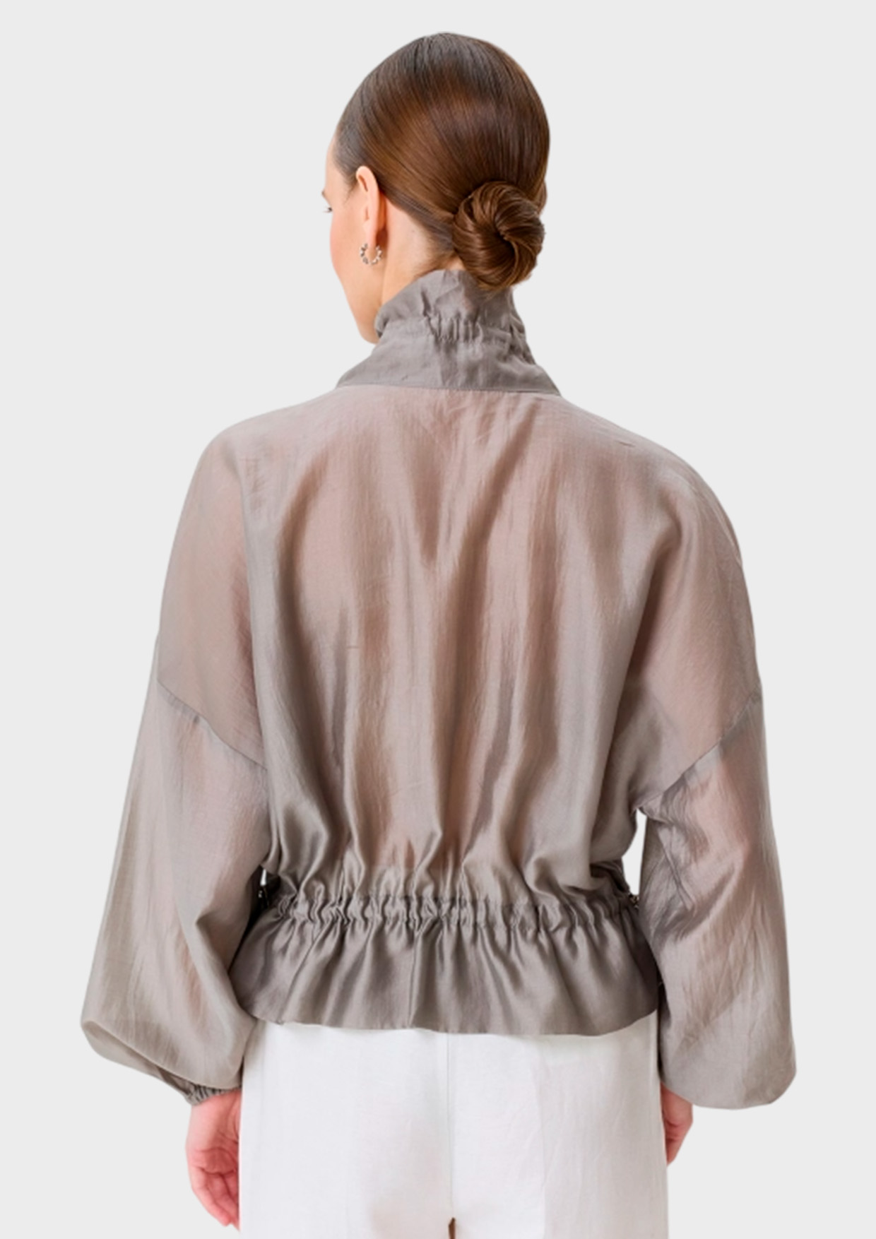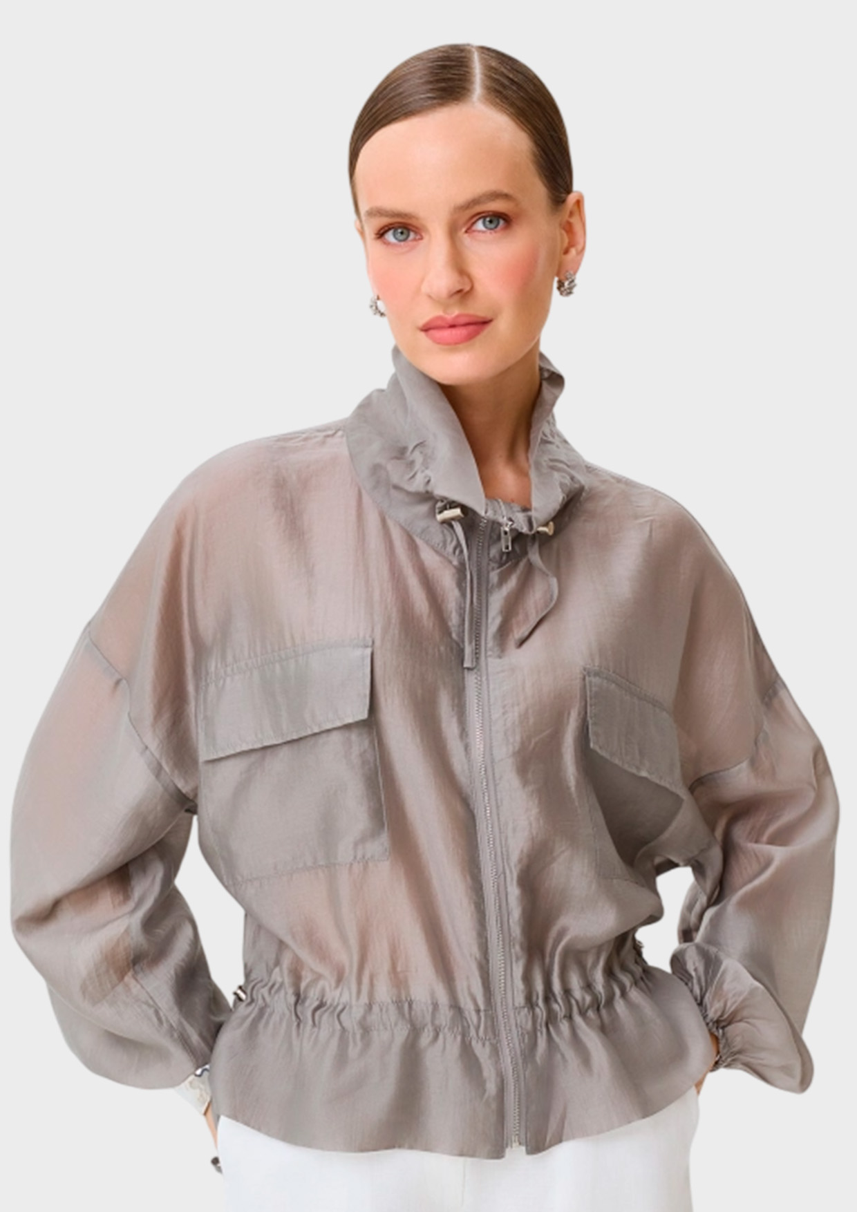 Полупрозрачный тонкий жакет из тенселя. Свободный силуэт. Высокий воротник стойка дополнен утяжниками. Застежка на молнию. Спущенная линия плеч и длинные рукава с резинкой по низу. Накладные боковые карманы с клапанами. Дополнен кулисой по низу изделия.