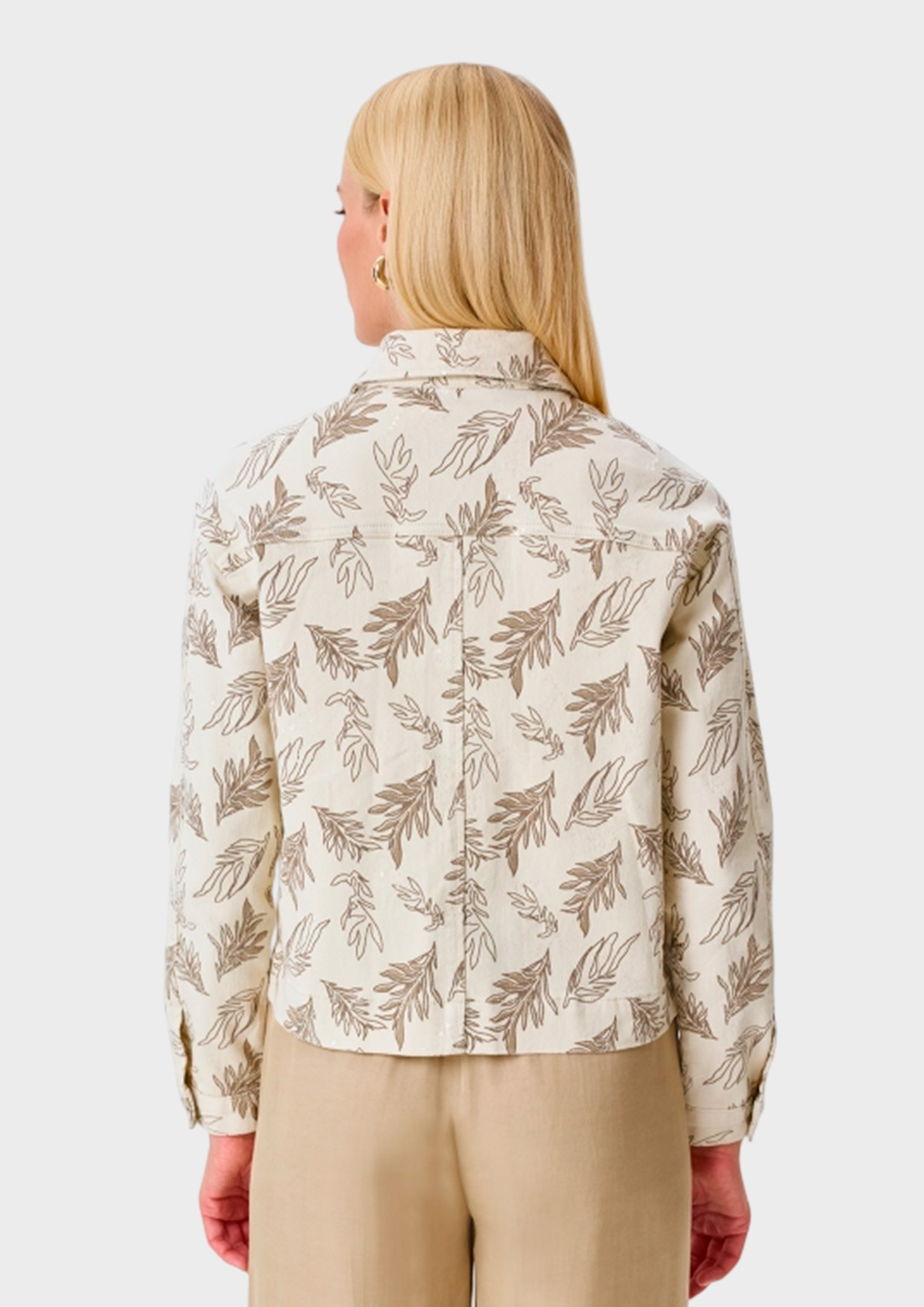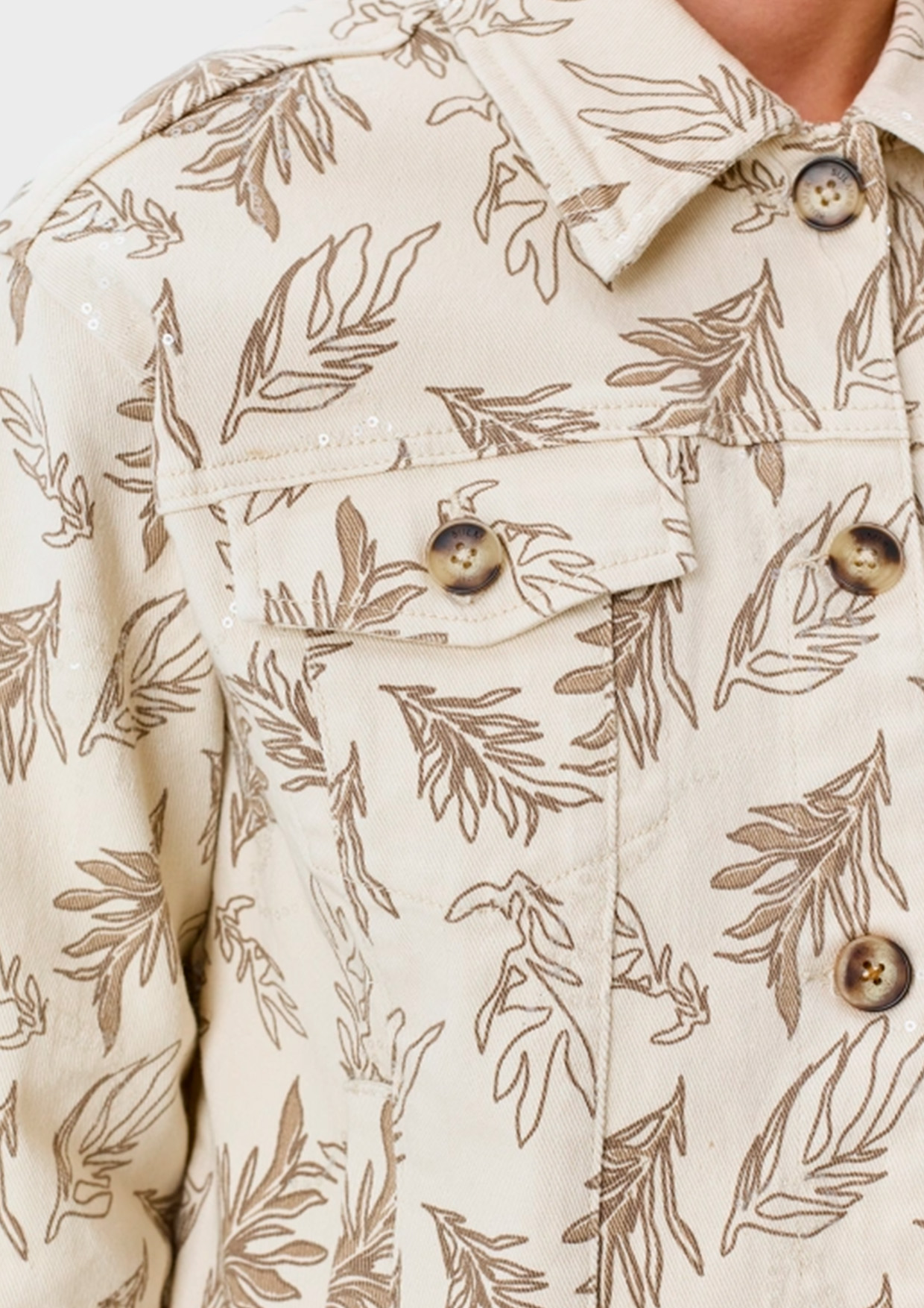 Джинсовый хлопковый жакет с растительным принтом и деликатными пайетками. Прямой силуэт. Отложной воротник. Застежка на пуговицы. Спущенная линия плеч и длинные втачные рукава. Накладные нагрудные карманы с клапанами на пуговицах. Боковые карманы с листочками.