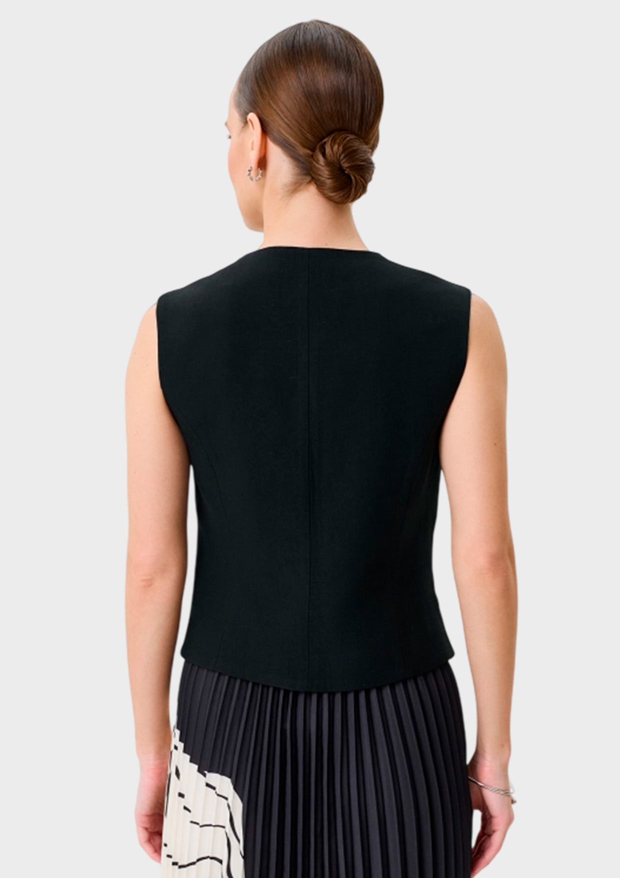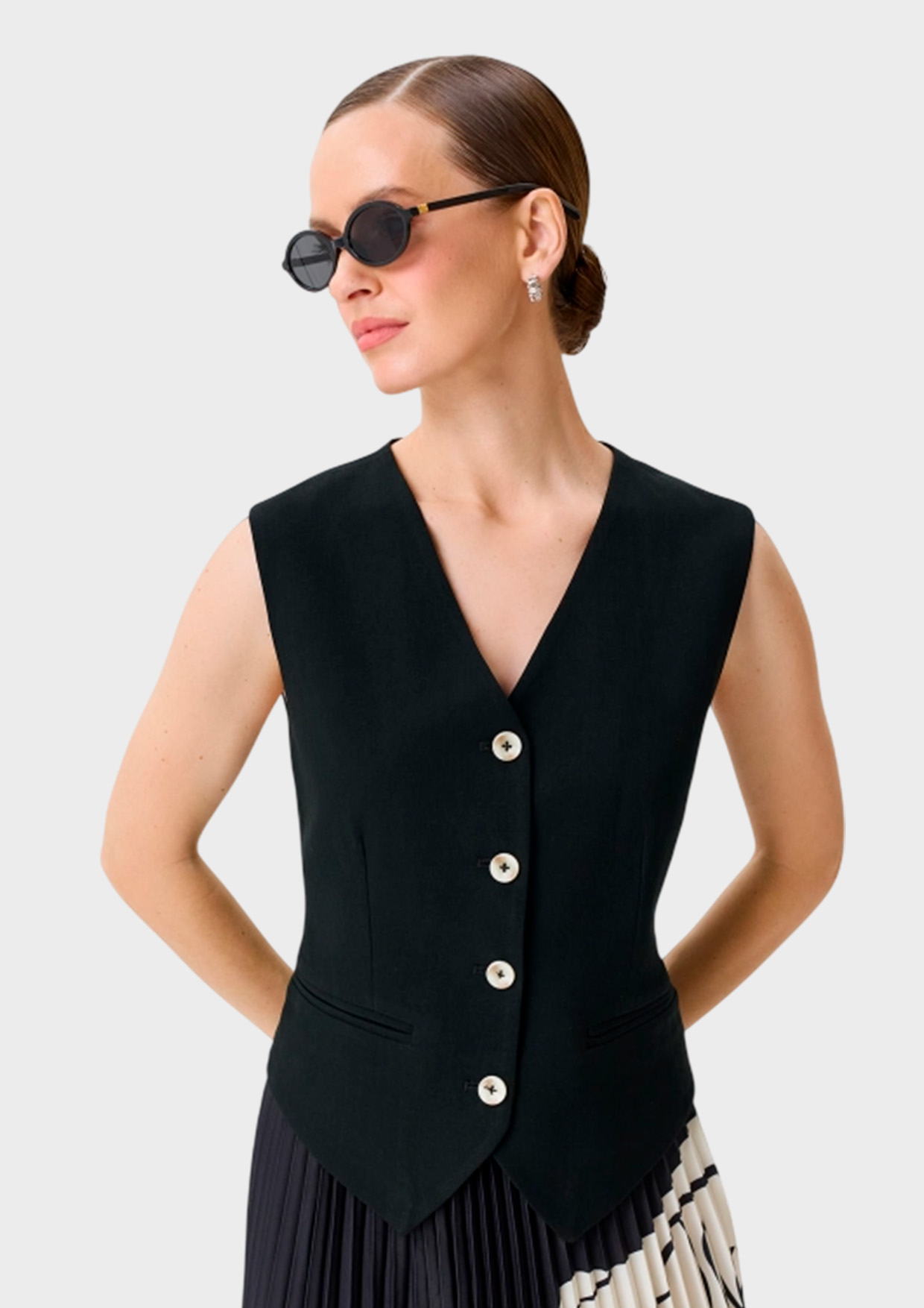 Классический жилет из 100% ацетата. Полуприталенный силуэт. V-образный вырез. Застежка на пуговицы. Боковые карманы с листочками. Подкладка из смесовой вискозы.